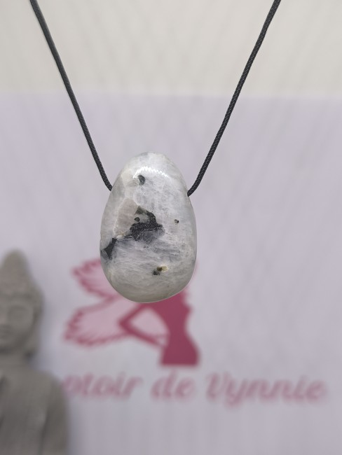 Symbole intemporel de féminité et d’intuition, la pierre est ici montée sur un cordon en nylon noir à la fois discret et élégant, terminé par un fermoir à vis pratique et sécurisé.