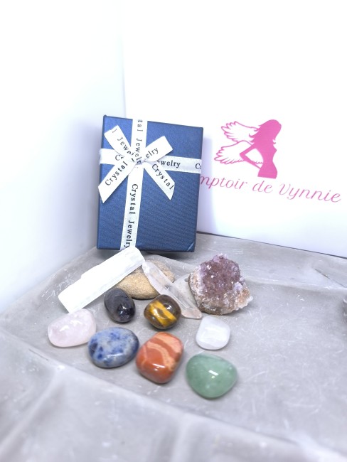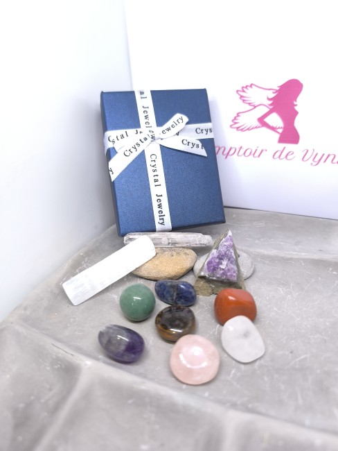 Découvrez ce magnifique coffret composé de 10 pierres naturelles soigneusement sélectionnées pour leurs vertus énergétiques complémentaires. Présenté dans une élégante boîte bleue nouée d’un ruban, ce set est parfait pour offrir ou pour débuter une collection de lithothérapie.