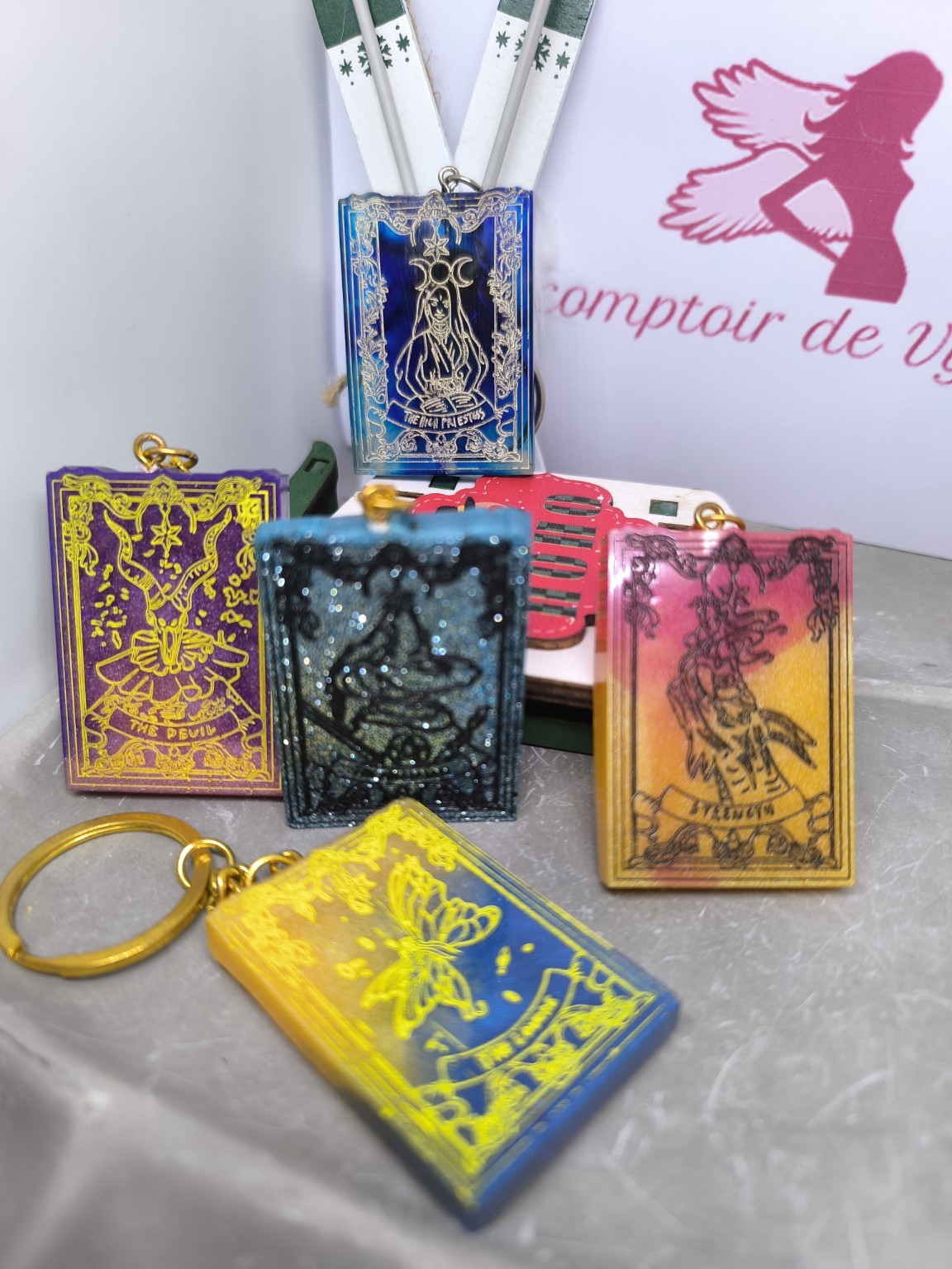 un porte-clés représentant une lame majeure du Tarot,