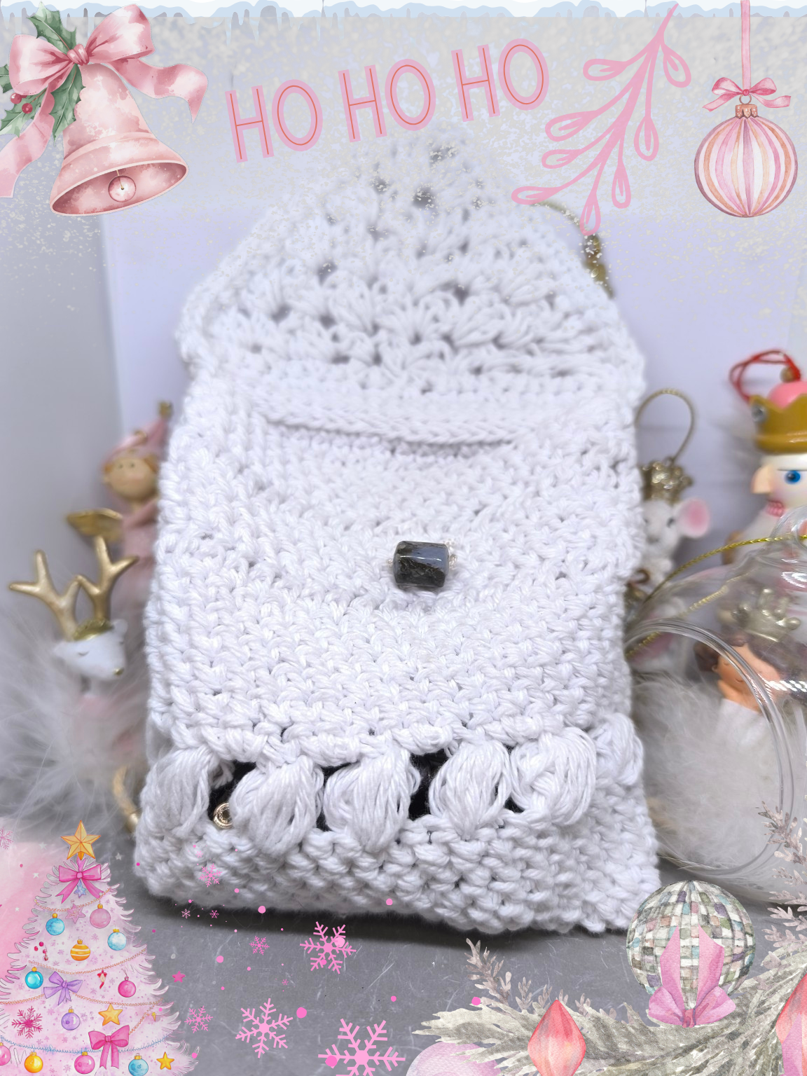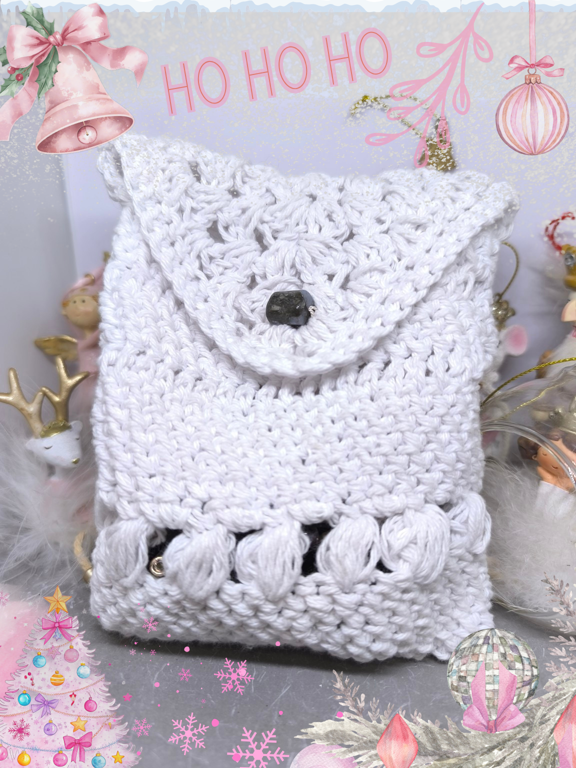 Pour ce quatrième jour, je vous propose une pochette entièrement crochetée à la main, dans un magnifique blanc neige satiné, douce et lumineuse comme un matin d’hiver.