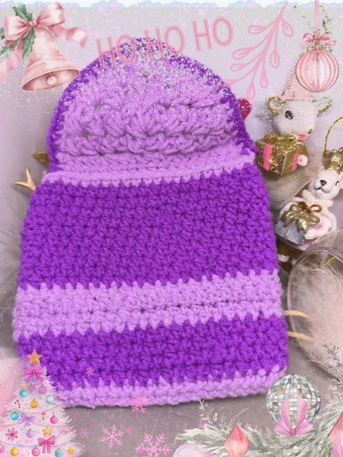Cette pochette merveilleusement crochetée à la main dans un dégradé de violets lumineux rappelle les nuits étoilées d’hiver et l’univers féerique du Comptoir de Vynnie.
