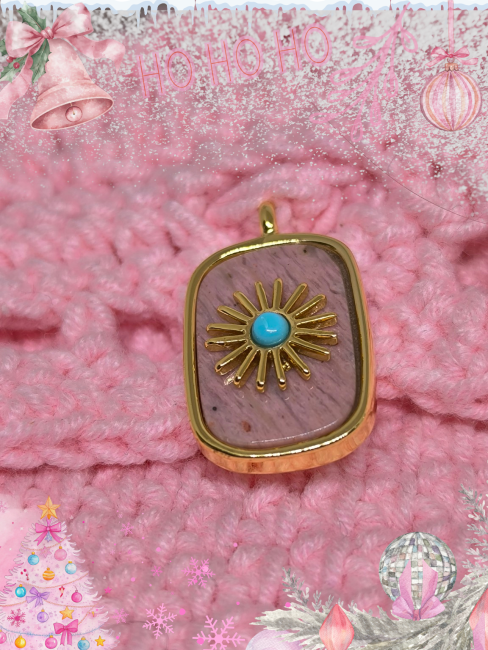 Elle est fermée par un sublime pendentif plaqué or 18 carats, serti de rhodocrosite et d’une délicate turquoise centrale, symbole de protection et d’amour tendre.