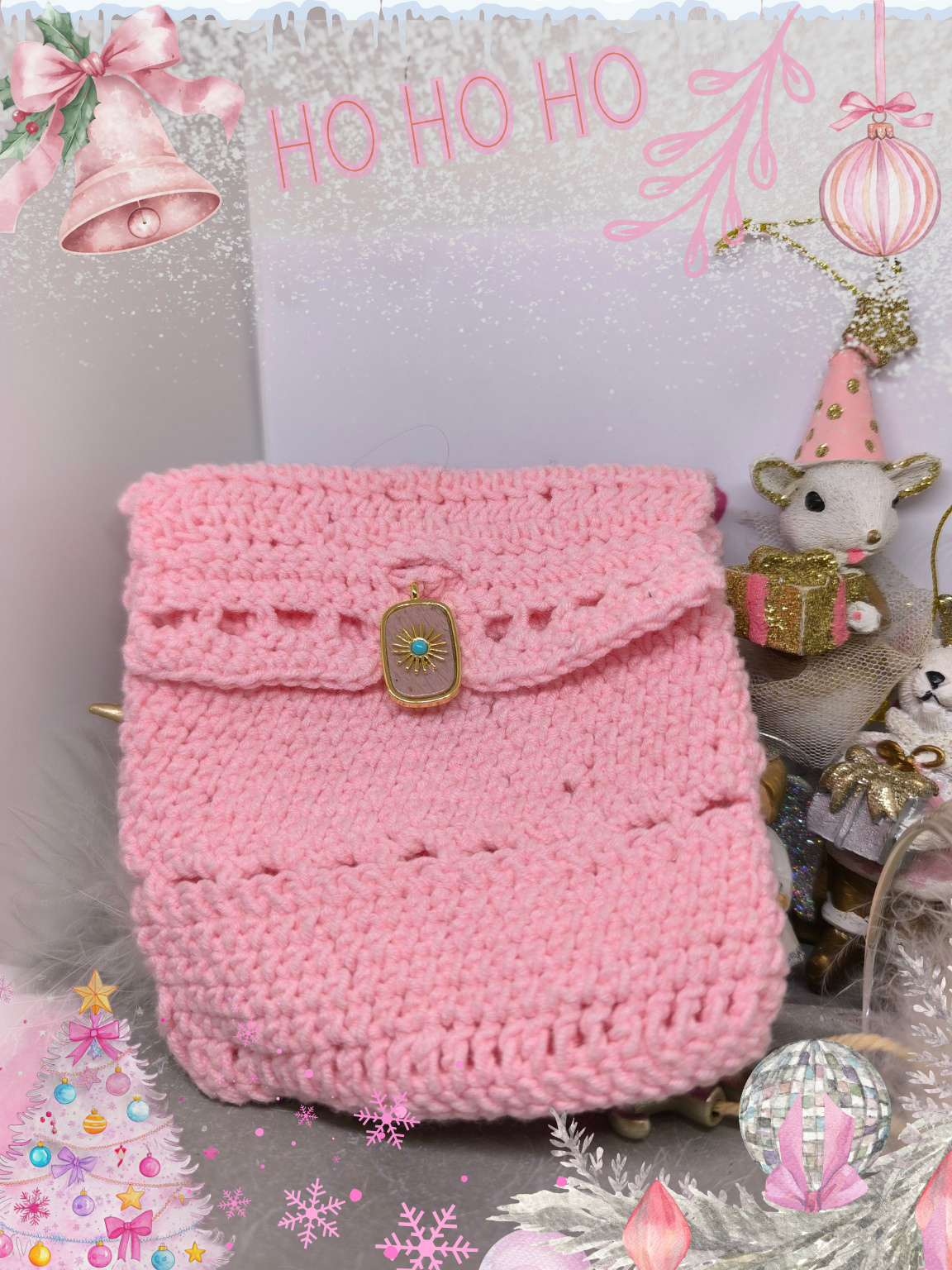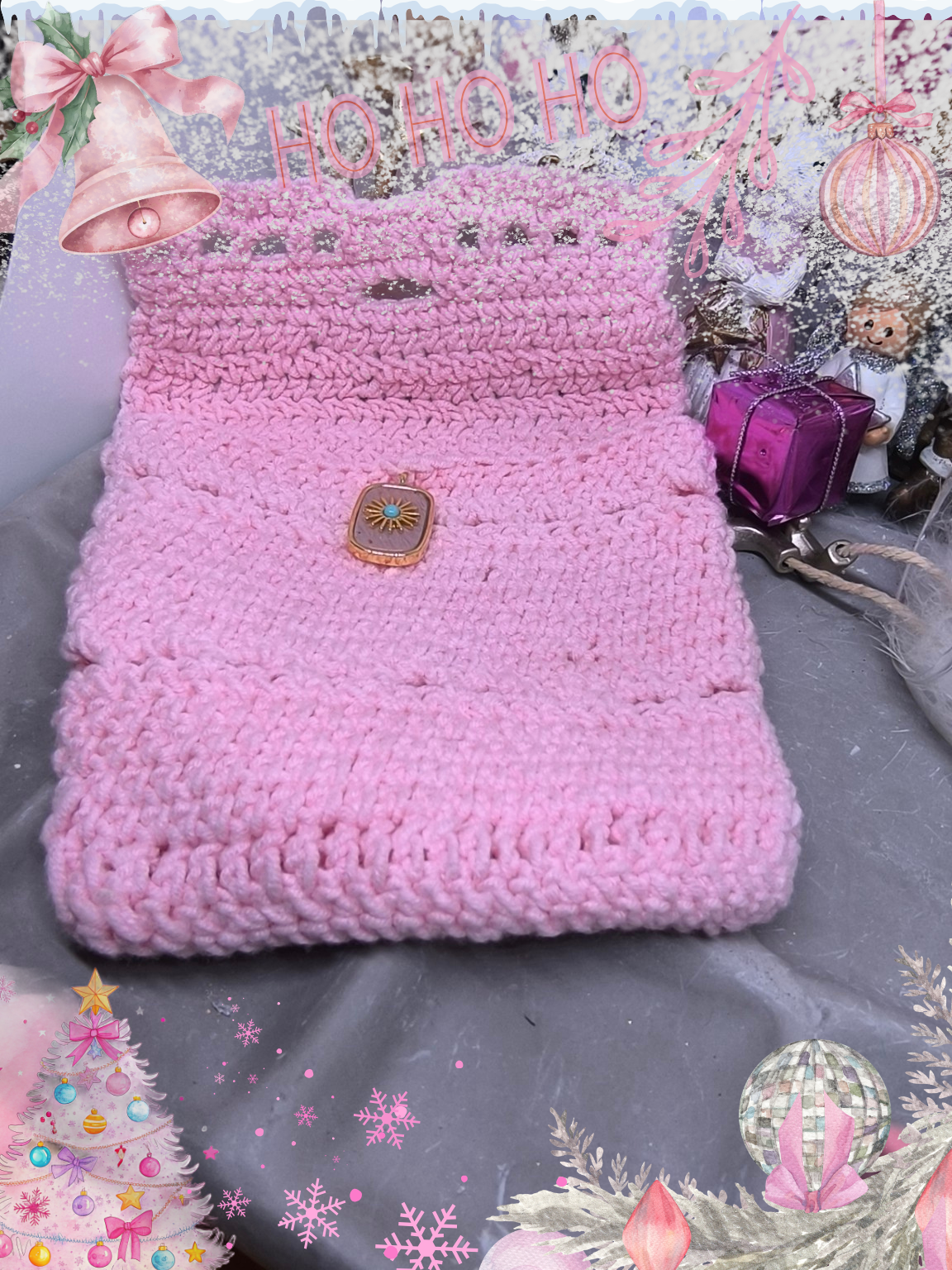 Une pochette délicatement crochetée à la main dans un rose tendre et lumineux, symbole de douceur, de féminité et de chaleur hivernale.