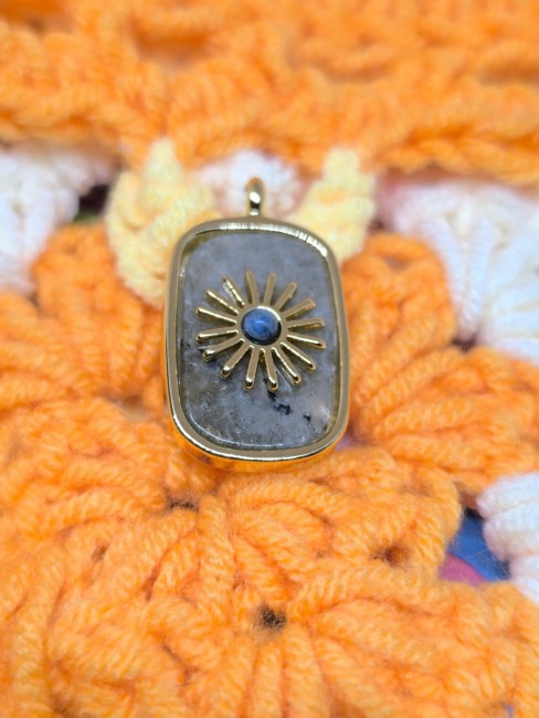 Elle est décorée d’un sublime pendentif plaqué or 18 carats, orné d’une labradorite douce et mystique, illuminée en son centre d’un lapis lazuli, pierre de sagesse et de vérité intérieure.