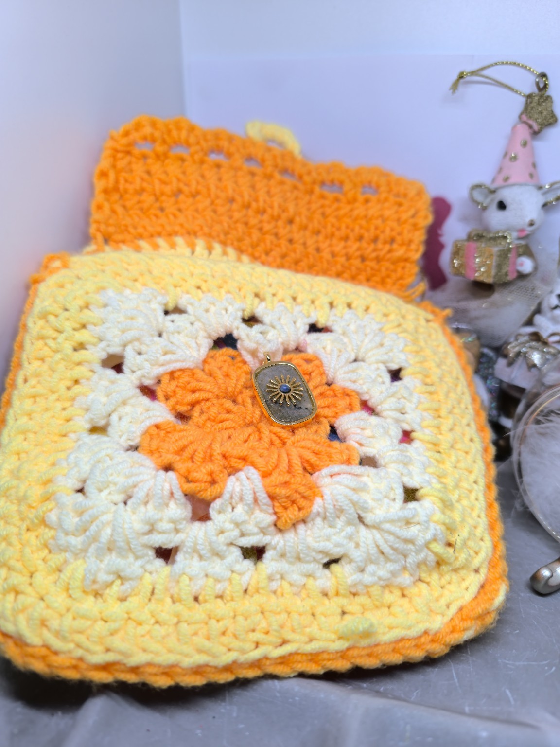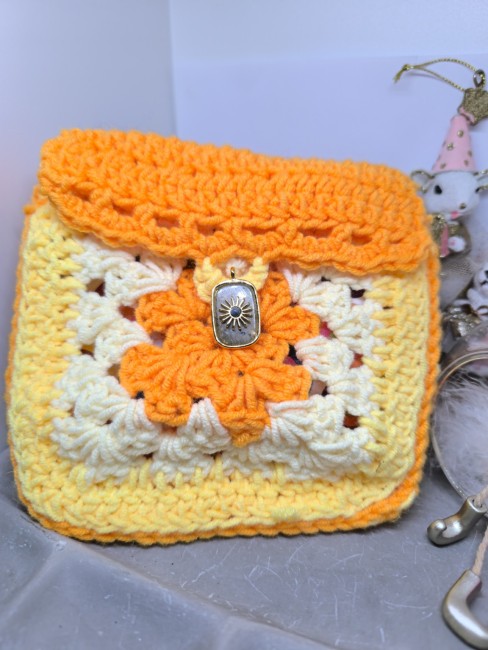 Cette pochette unique, crochetée entièrement à la main, rayonne dans des tons jaune, crème et orange, rappelant la chaleur du soleil d’hiver.