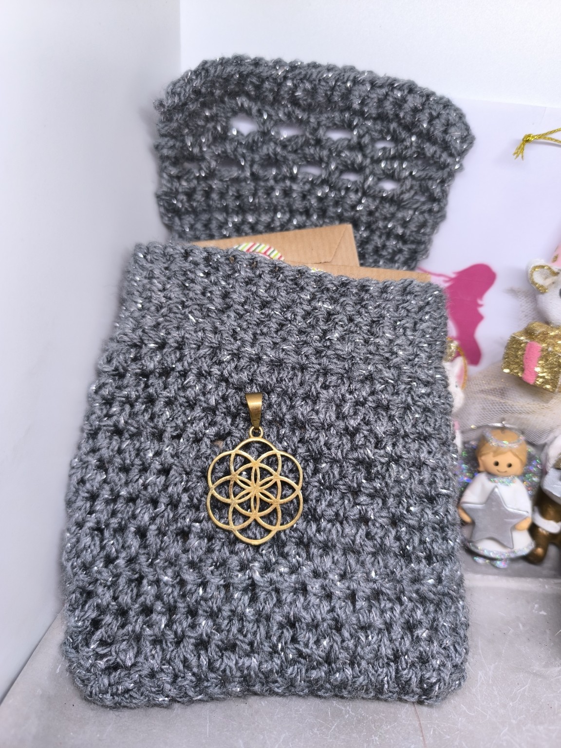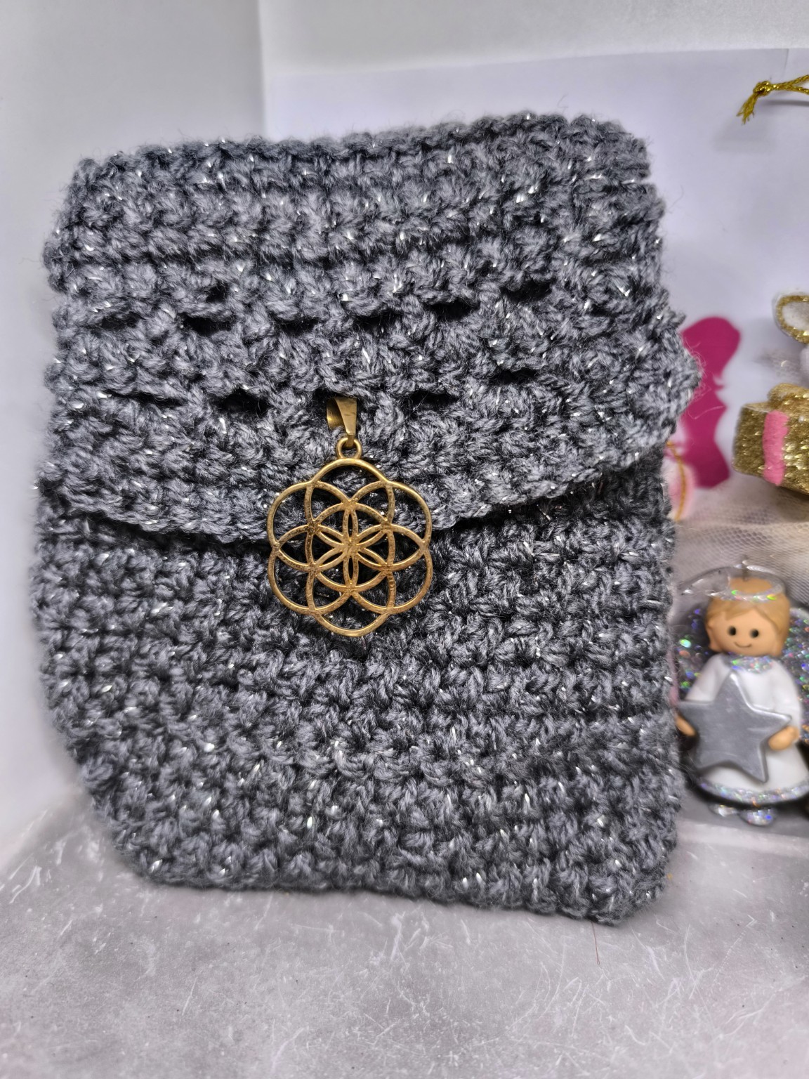 Cette pochette crochetée à la main par Vynnie, dans un gris acier pailleté, incarne l’élégance, la stabilité et la profondeur des énergies de terre.