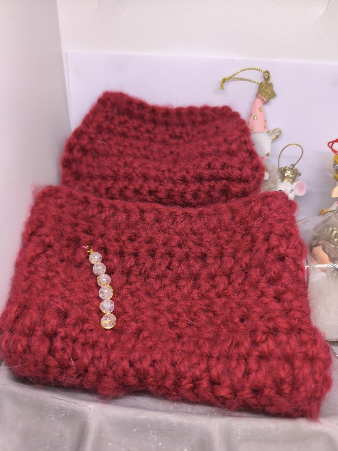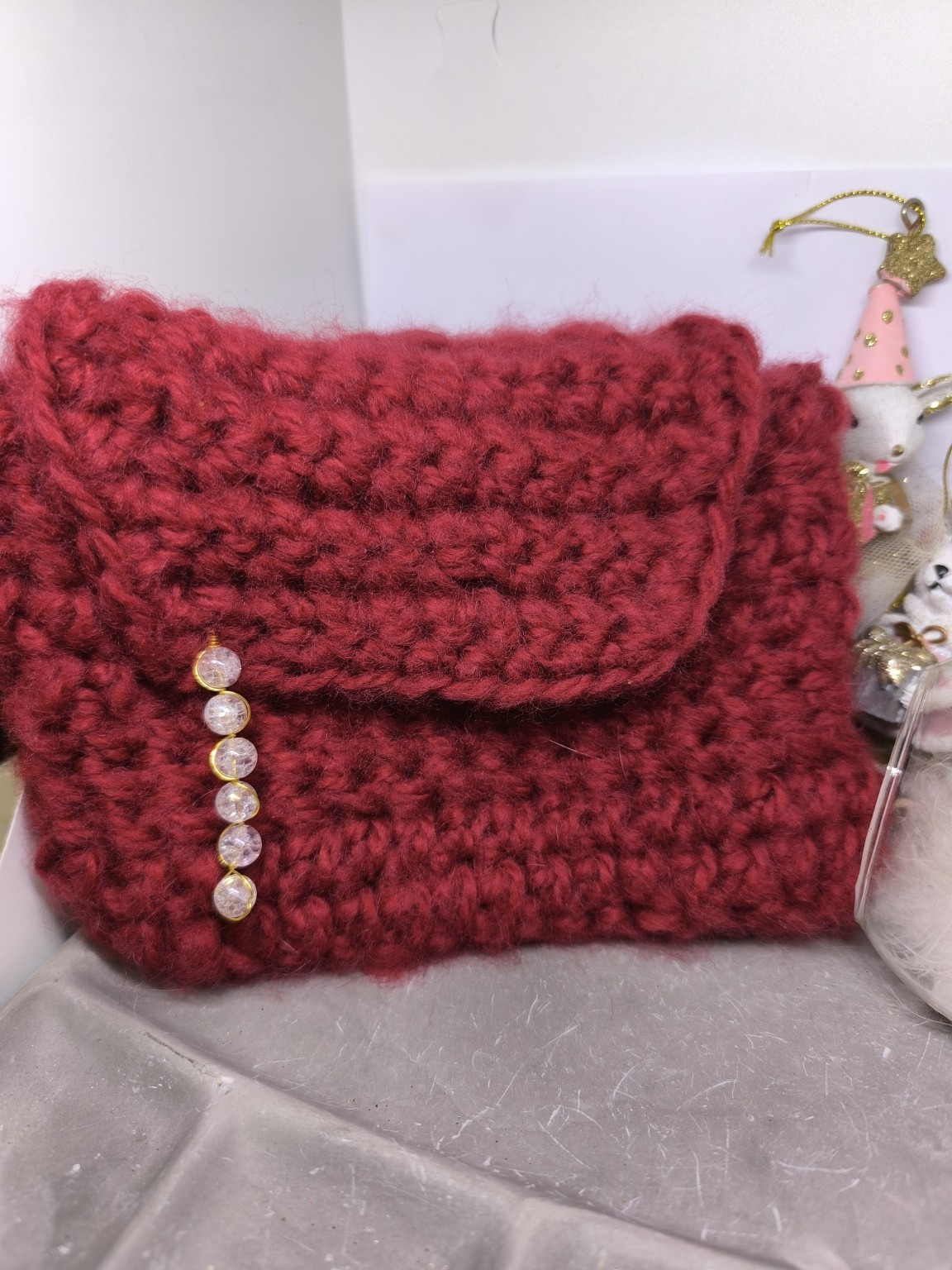 Une pochette chaleureuse et enveloppante, crochetée entièrement à la main par Vynnie, dans un rouge profond, couleur du cœur, de la passion et de l’énergie vitale.