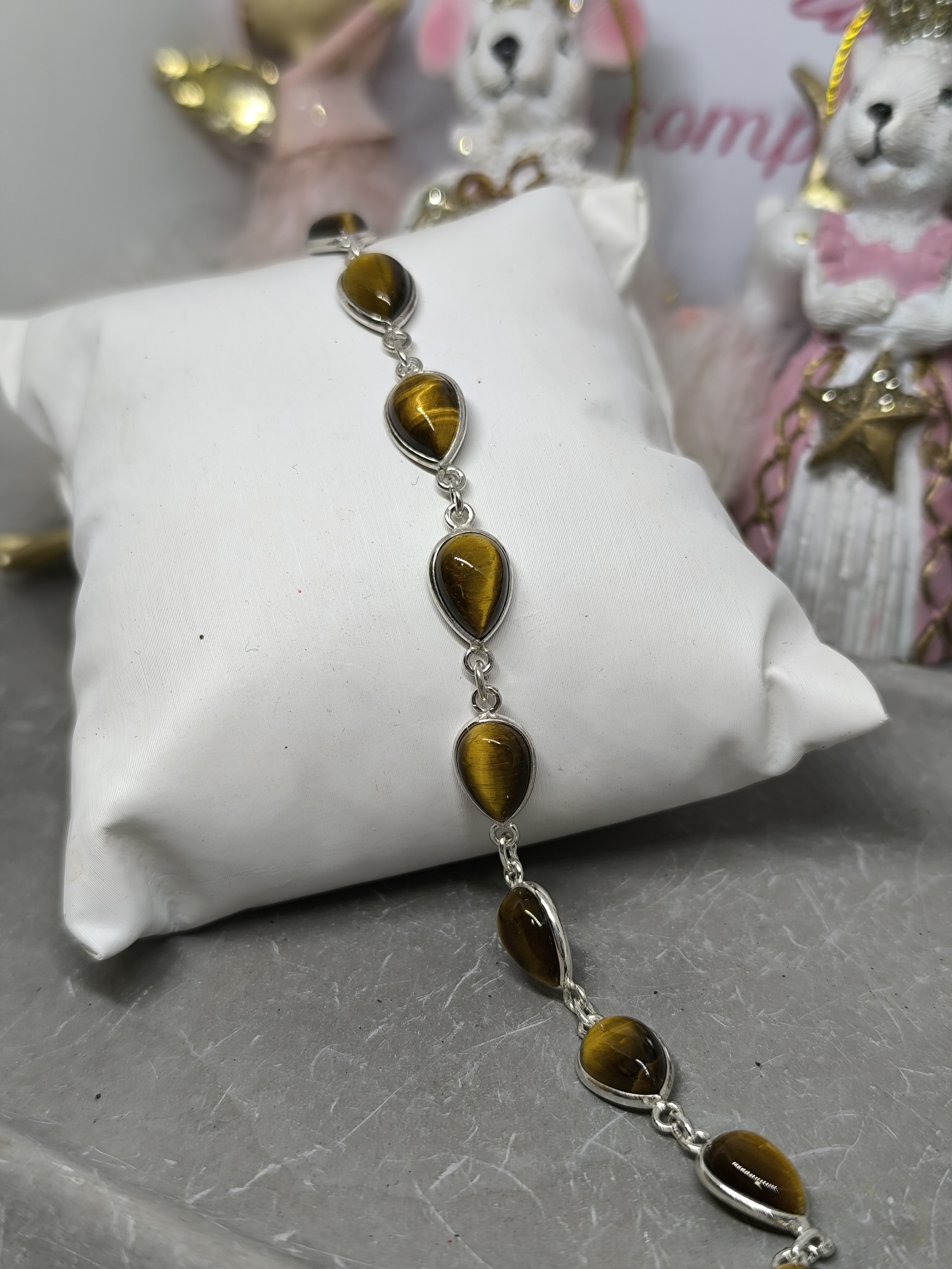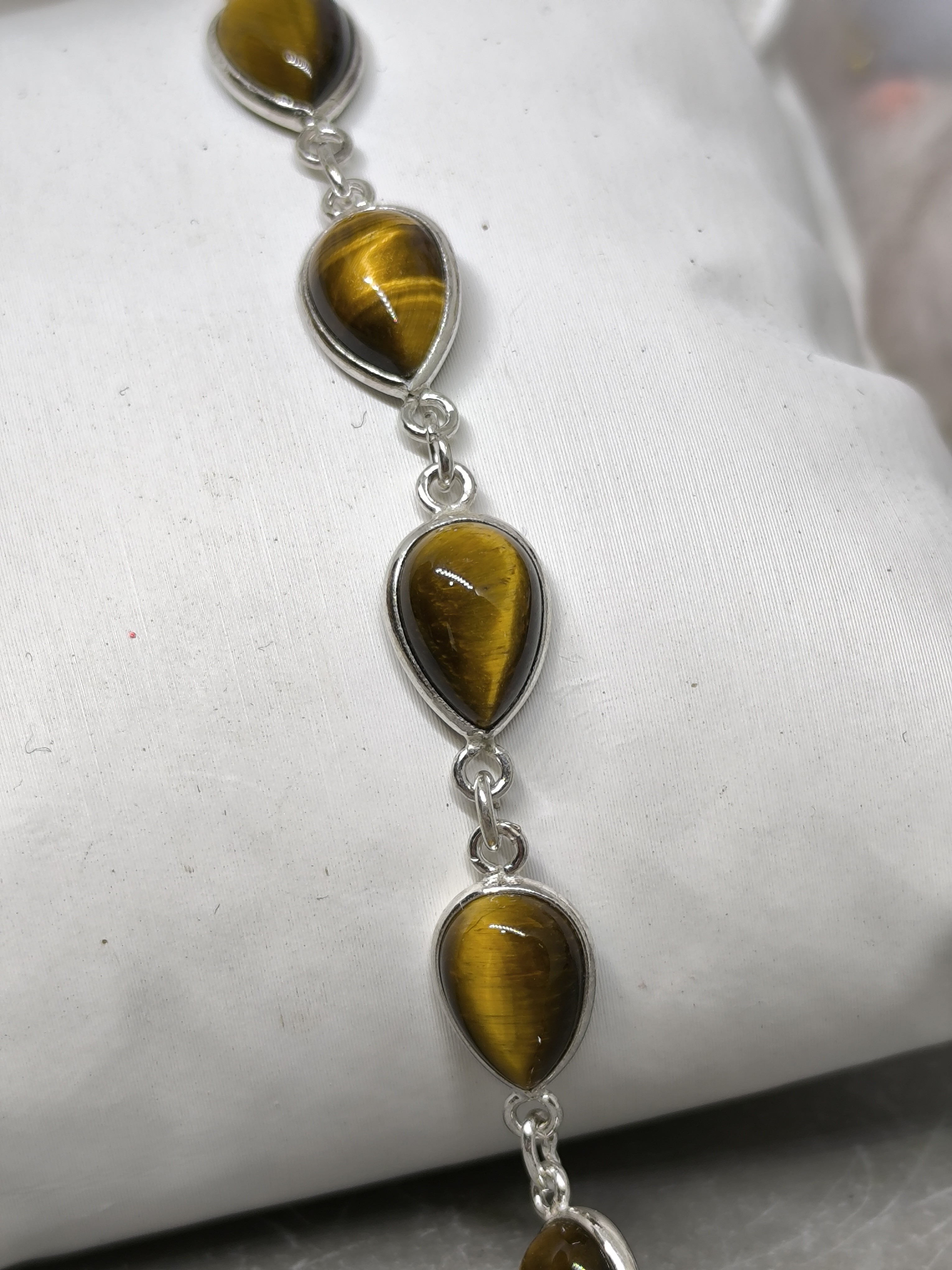 Ce bracelet en œil de tigre naturel, composé de pierres taillées en forme de larme et serties en argent sterling 925 (argent de 1ère loi), est un bijou élégant et intemporel. Chaque cabochon révèle les nuances caractéristiques de l’œil de tigre, avec un jeu de lumière unique à chaque pierre.
