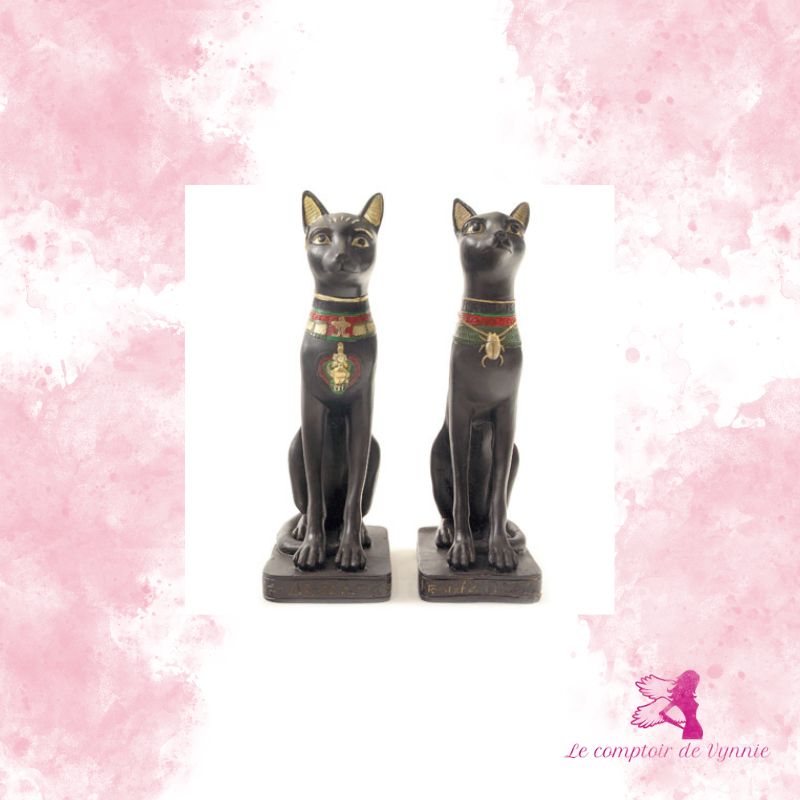 Ces statues représentent des chats égyptiens sacrés, assis, fiers et vigilants, inspirés de l’iconographie de l’Égypte antique. Leur posture droite et leur regard fixe traduisent la vigilance, la protection et la maîtrise intérieure.