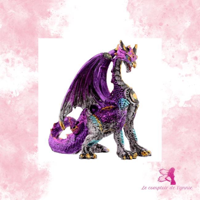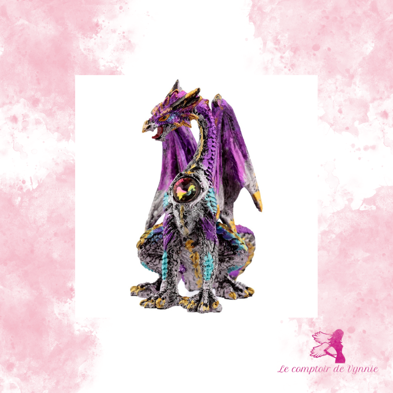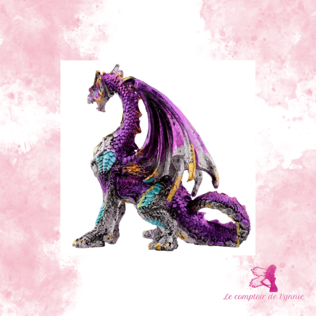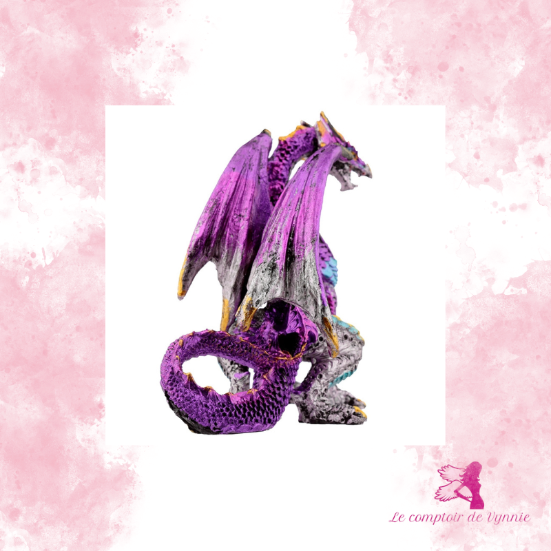 Cette statuette représente un dragon violet, dressé et vigilant, aux ailes déployées et au regard attentif. Sa posture traduit la maîtrise, la force contenue et la conscience de son pouvoir. Les nuances de violet, associées à des touches minérales et métalliques, renforcent son lien avec la spiritualité, l’intuition et les plans subtils.