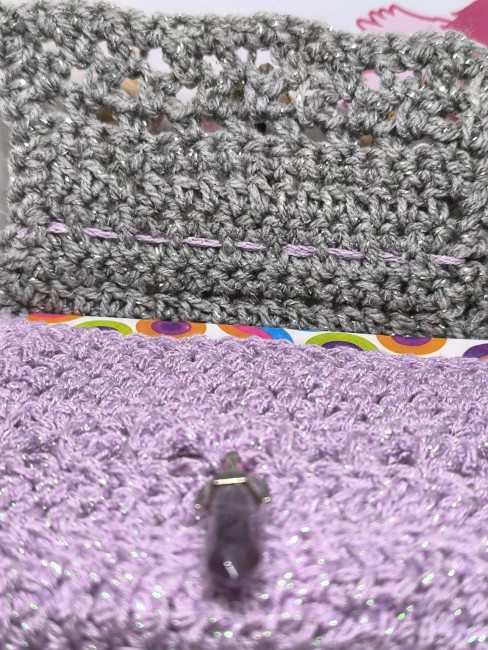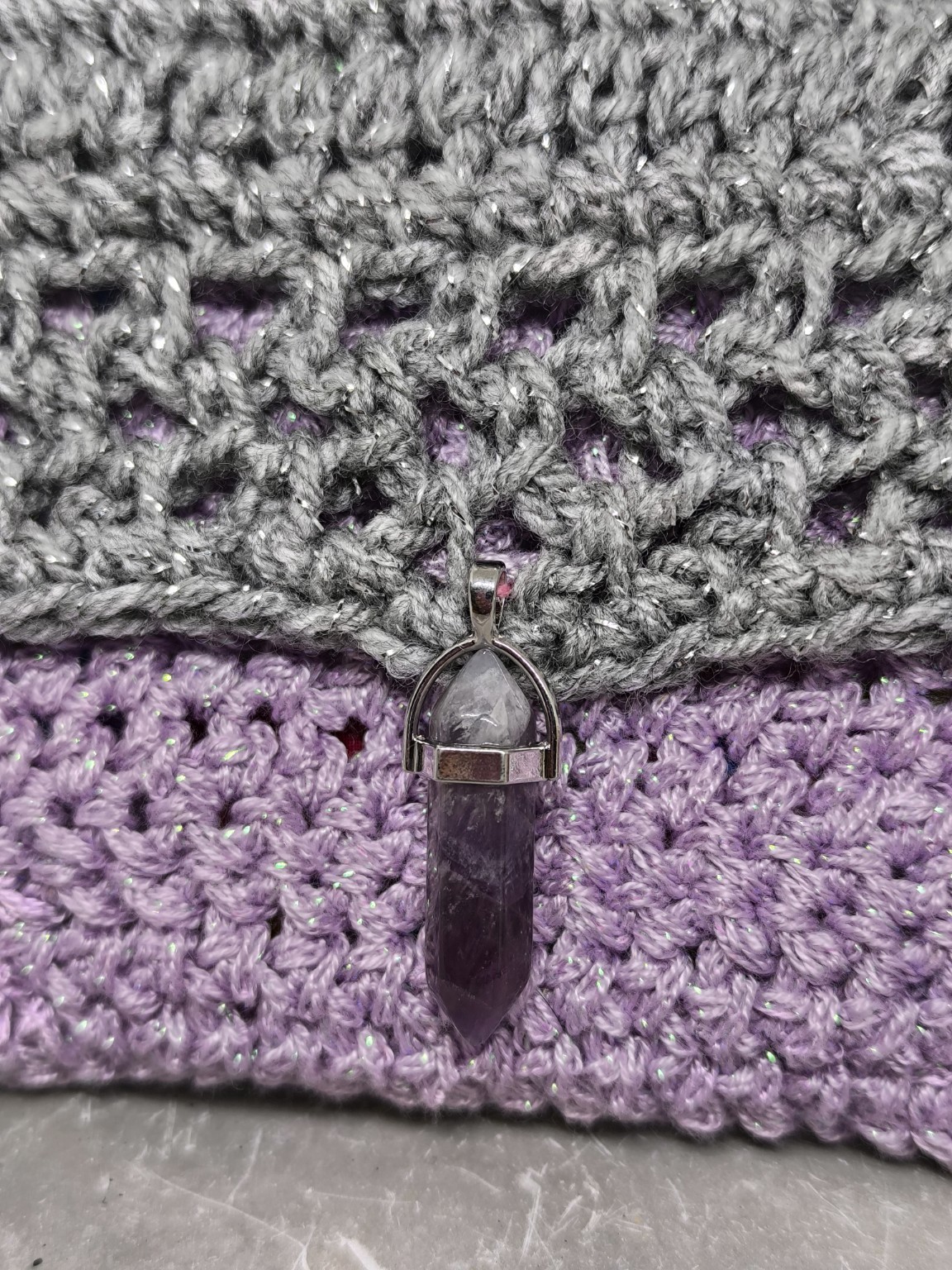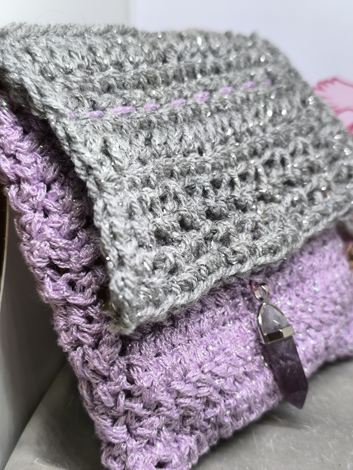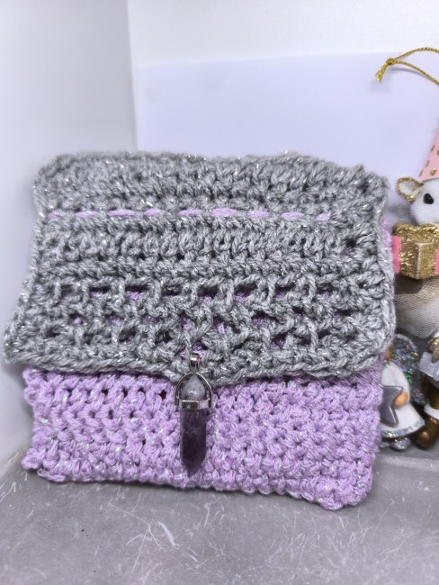 Une pochette élégante et lumineuse, crochetée entièrement à la main par Vynnie, mêlant un gris argenté scintillant et un violet doux, évoquant la sérénité, la sagesse et la magie hivernale.