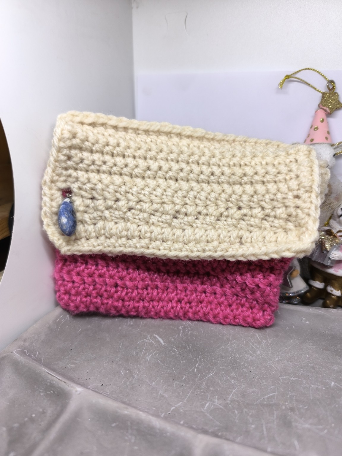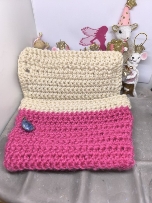 Une pochette chaleureuse et lumineuse, crochetée entièrement à la main par Vynnie, associant un écru doux et un rose framboise profond, pour une énergie de réconfort, de douceur et de joie de fin d’année.