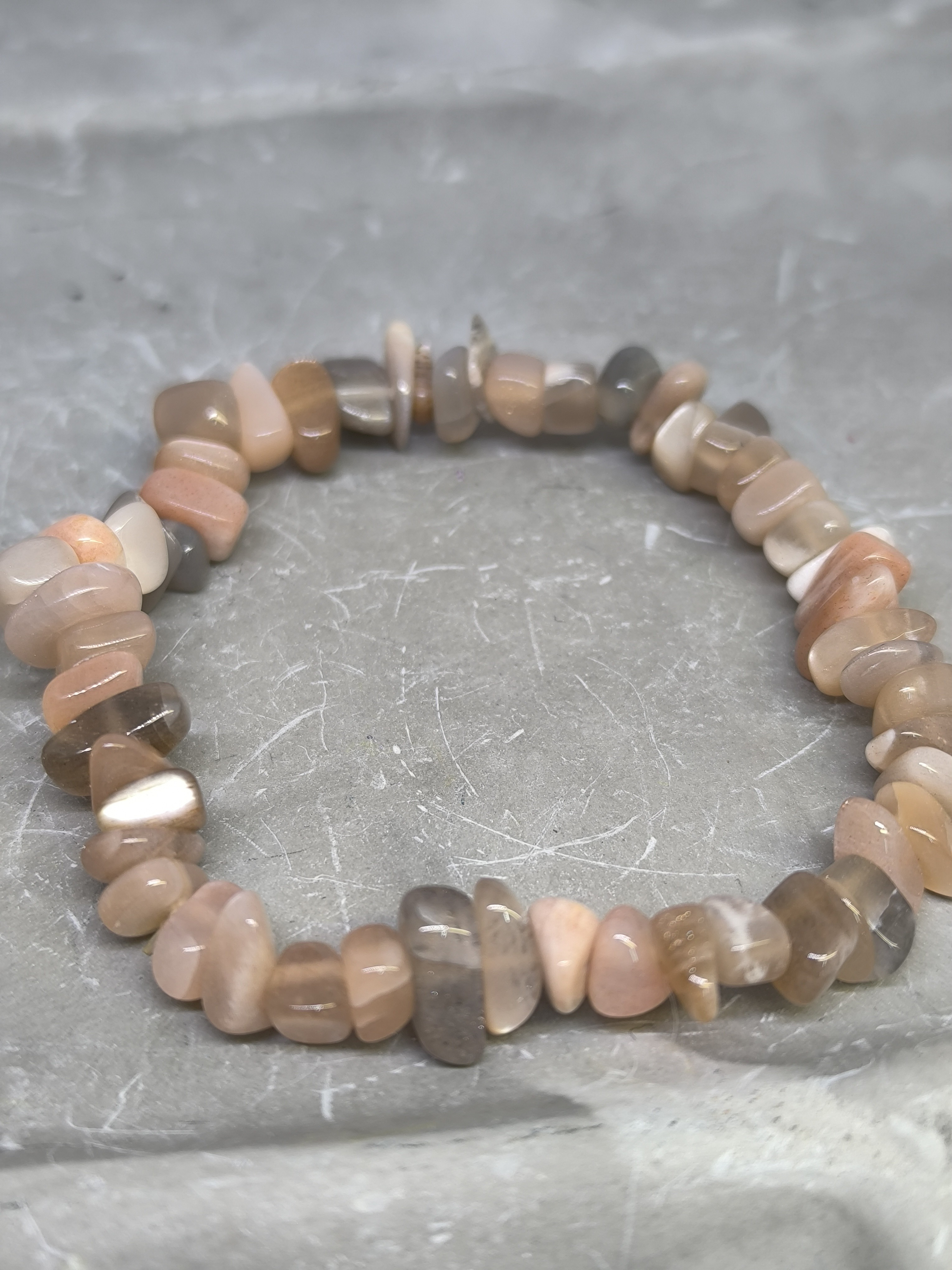 Les chips de Pierre de Lune Rose, volontairement assez grosses, polies et arrondies, offrent un contact très doux avec la peau. Leur forme irrégulière confère au bracelet un aspect authentique et organique. Chaque pièce est unique, avec ses nuances naturelles allant du rose pâle au beige lacté.