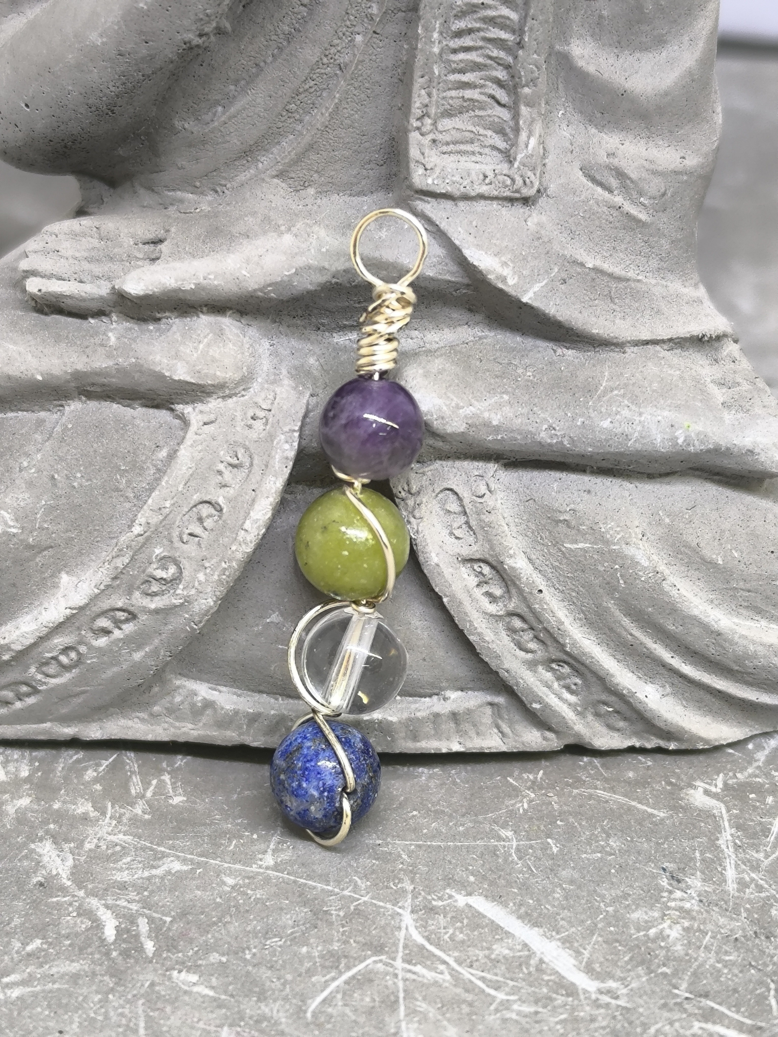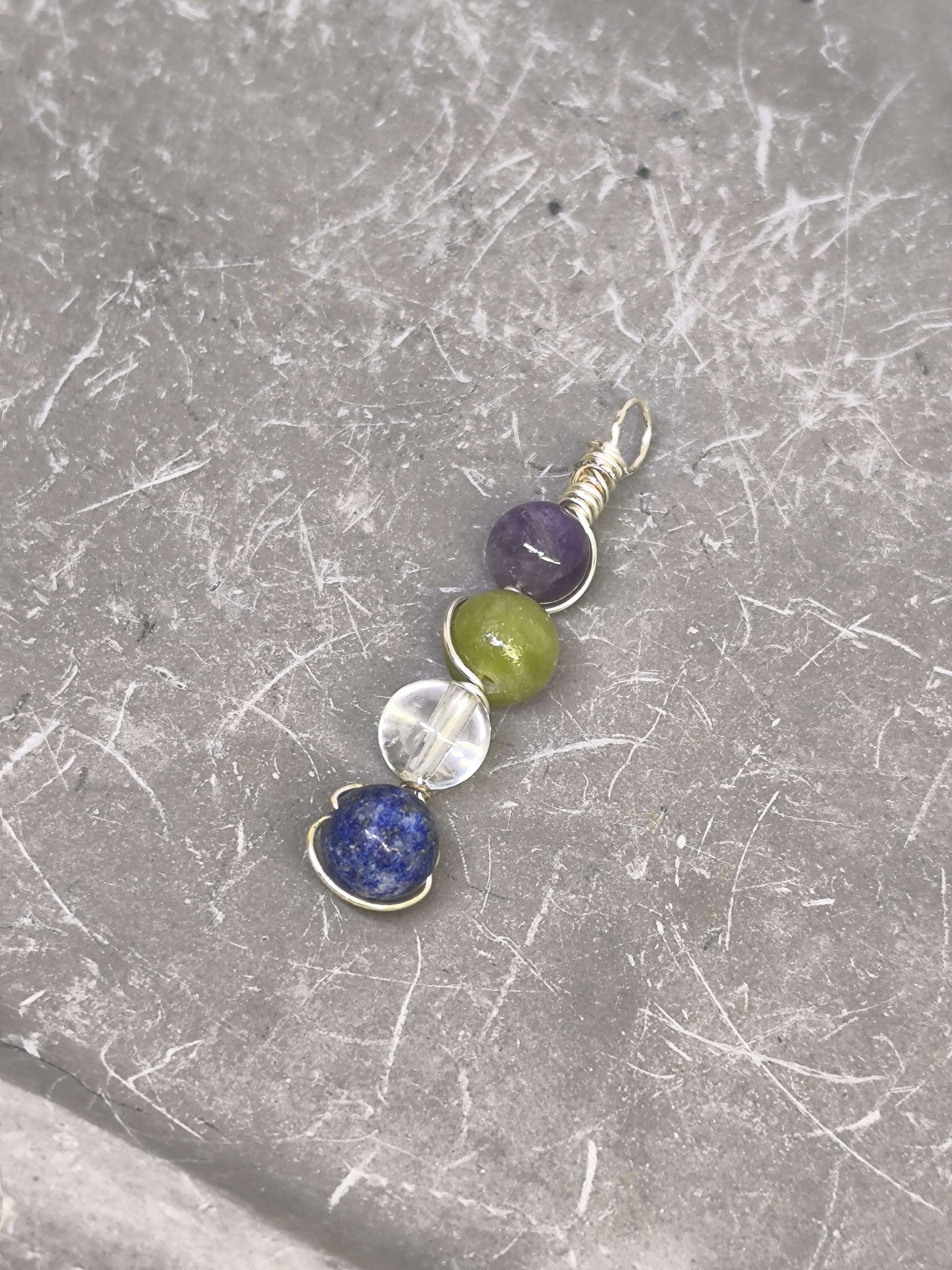 Pendentif Migraine en pierres naturelles – Améthyste, Jade, Cristal de Roche & Lapis-Lazuli – Perles 6 mm – Monté sur câble – Création artisanale