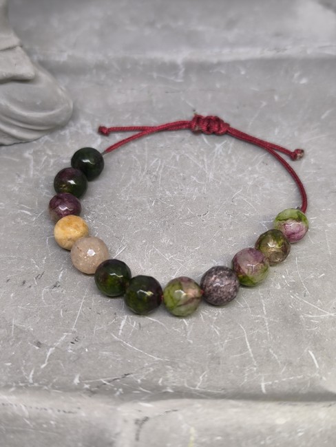 Ce bracelet en tourmaline multicolore facettée, composé de perles naturelles de 8 mm, est monté sur fil nylon résistant avec un nœud shamballa ajustable, permettant de s’adapter confortablement à la majorité des poignets.