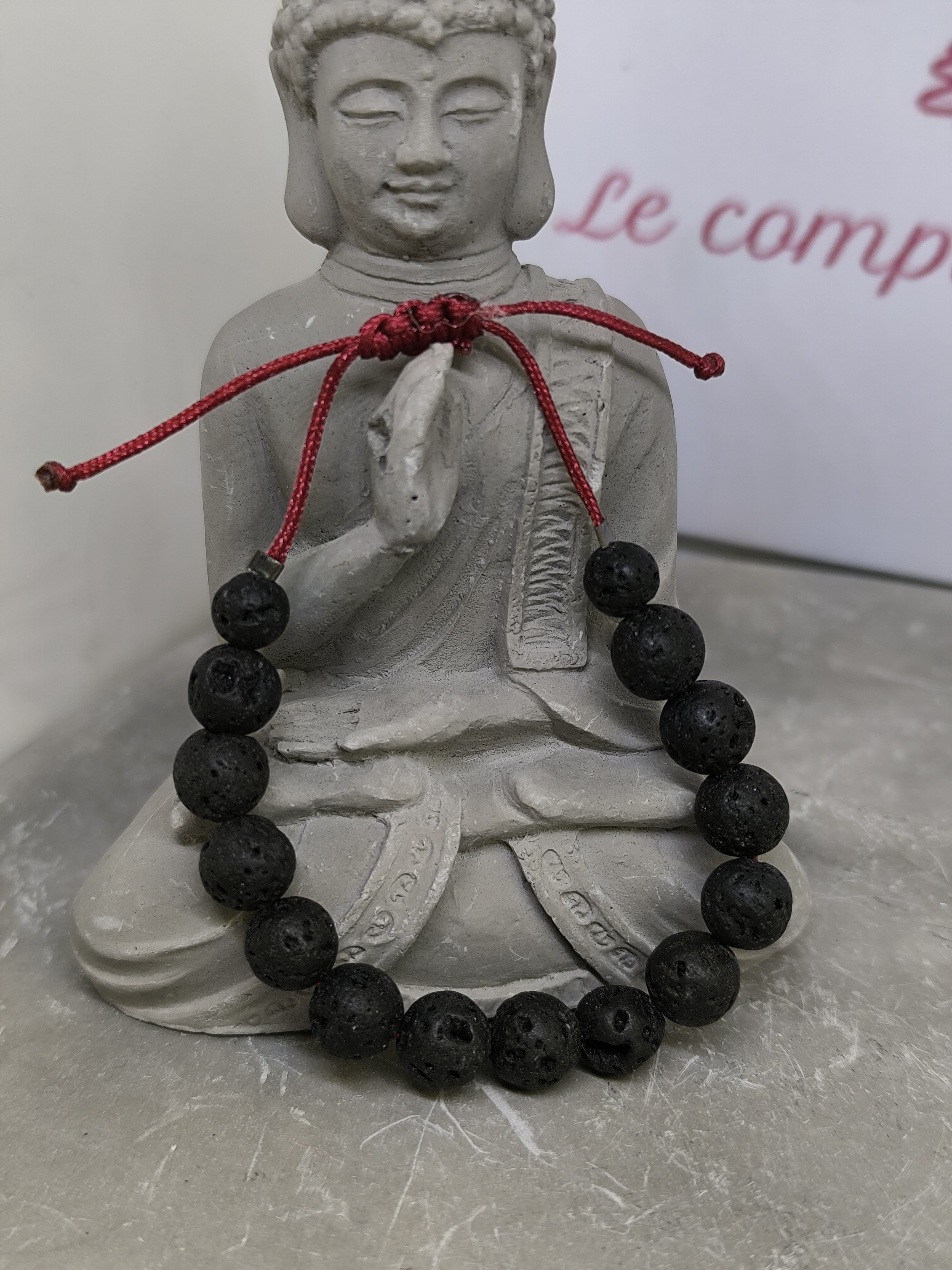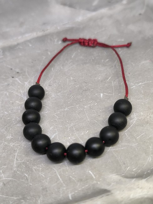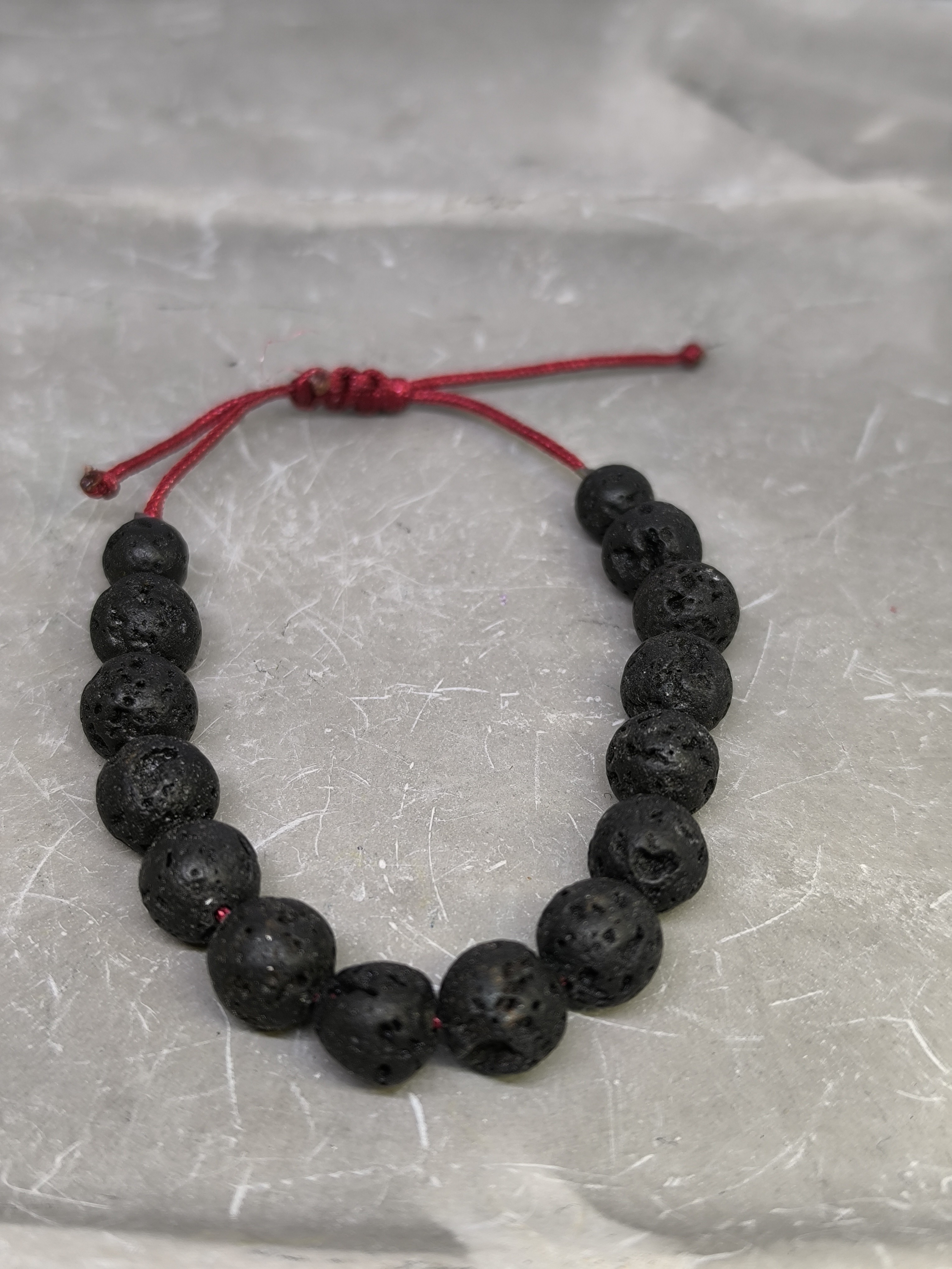 Ce bracelet en pierre de lave naturelle, composé de perles rondes de 8 mm, est monté sur un cordon rouge résistant avec un nœud shamballa ajustable, permettant un port confortable et adaptable à la majorité des poignets.