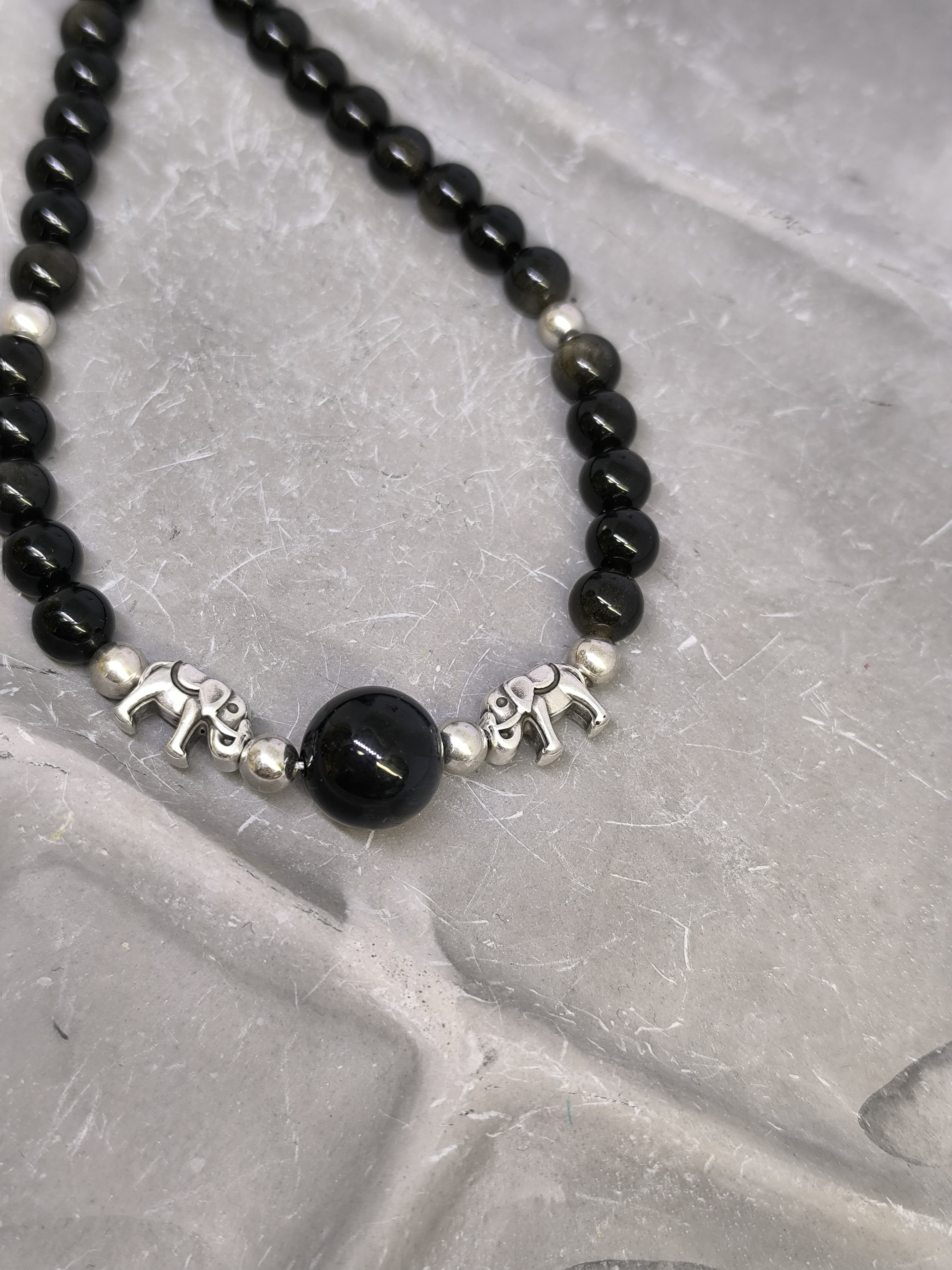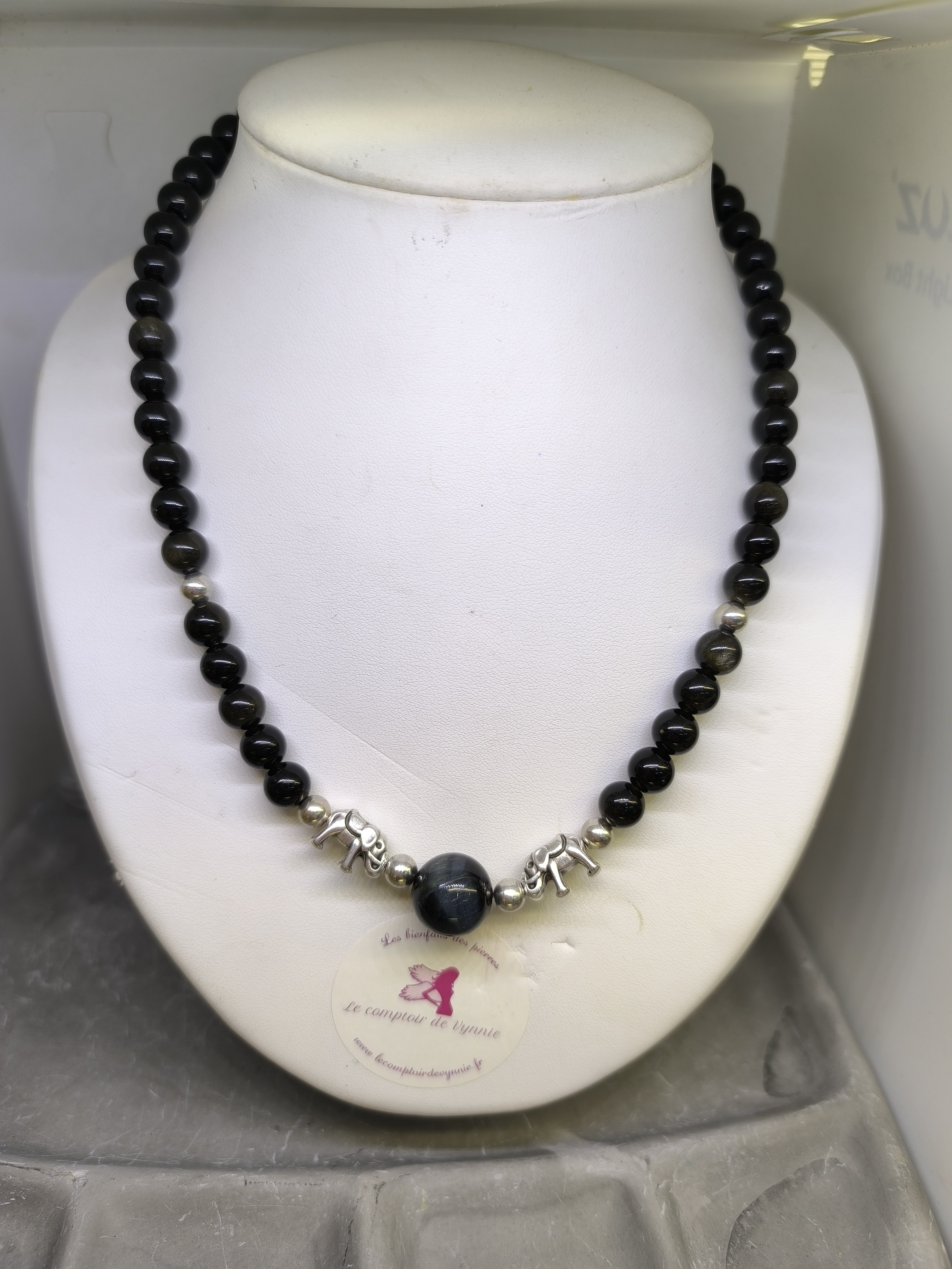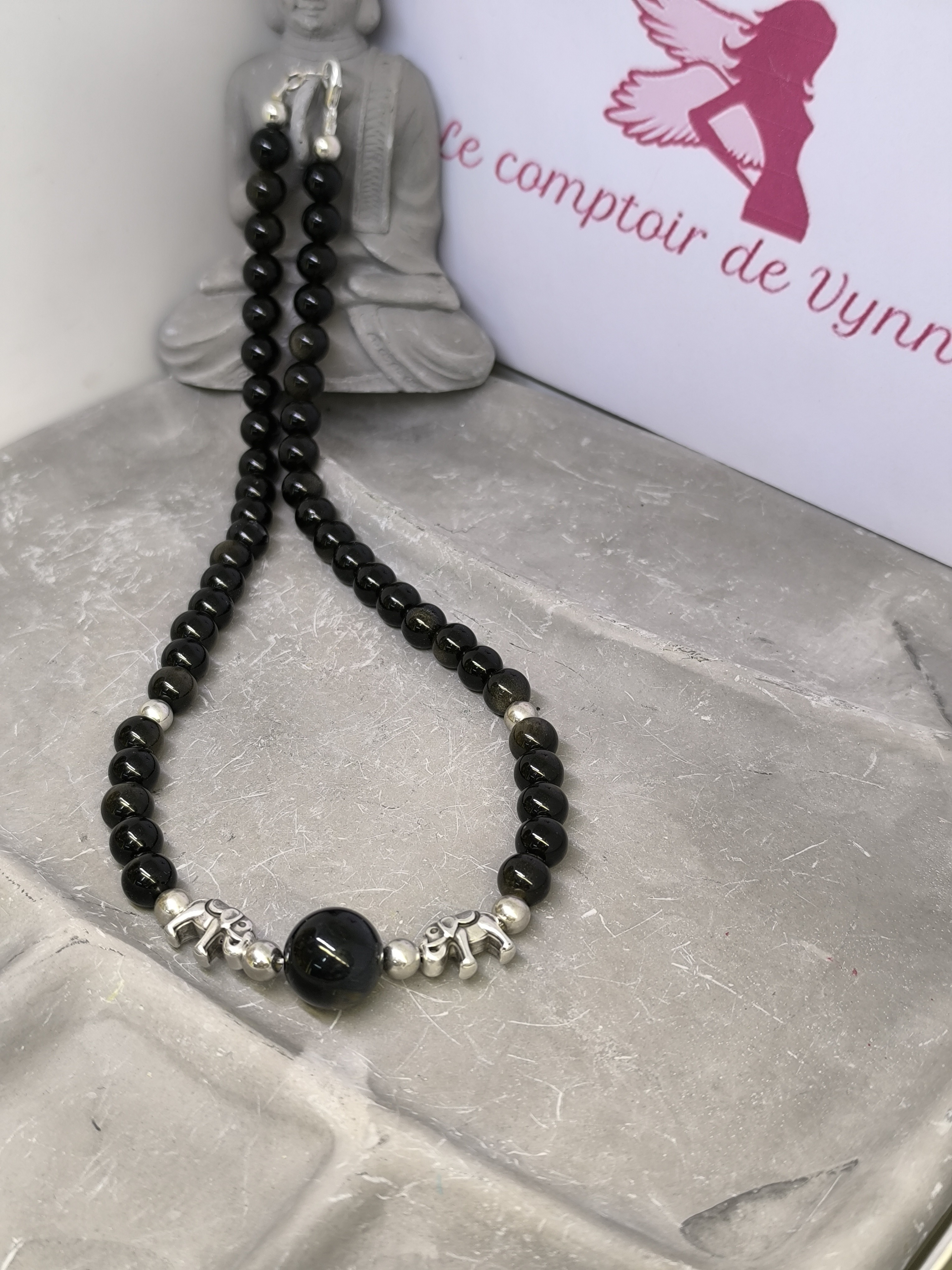 Collier en obsidienne dorée & œil de fer – Protection et ancrage