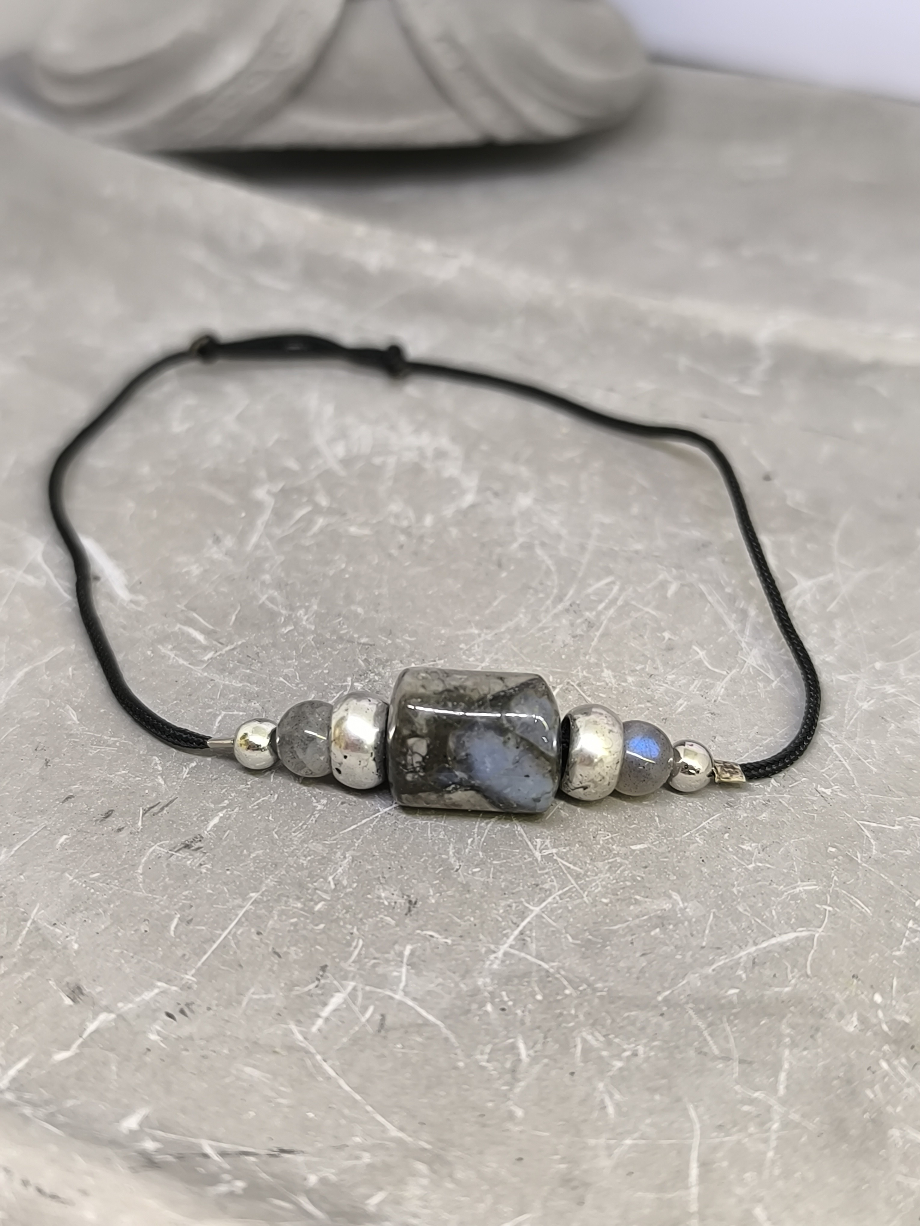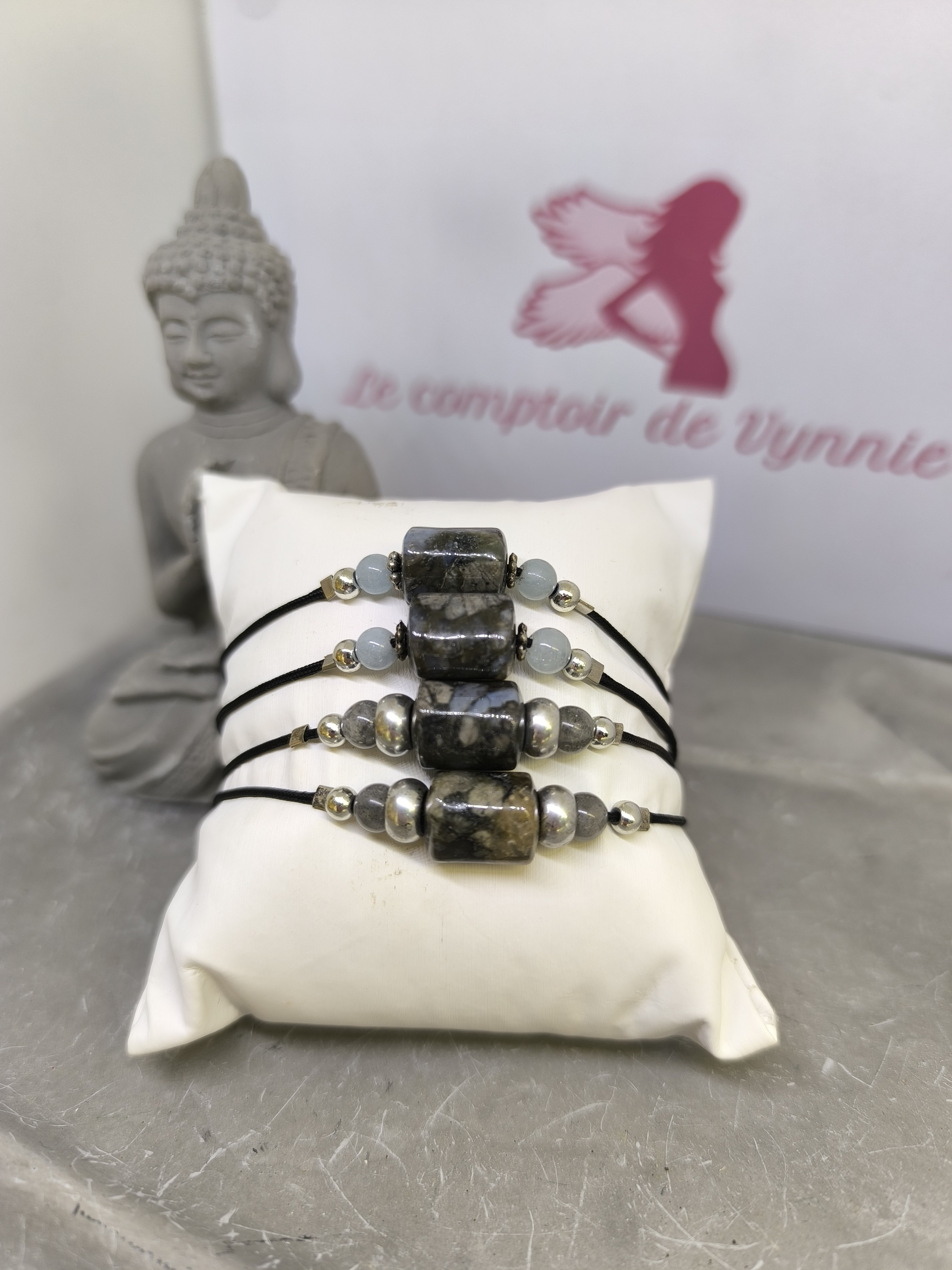 Monté à la main sur cordon textile argenté, ce bijou allie caractère brut et élégance contemporaine. Les pierres centrales en forme de tonneau donnent à chaque bracelet une identité forte et authentique.