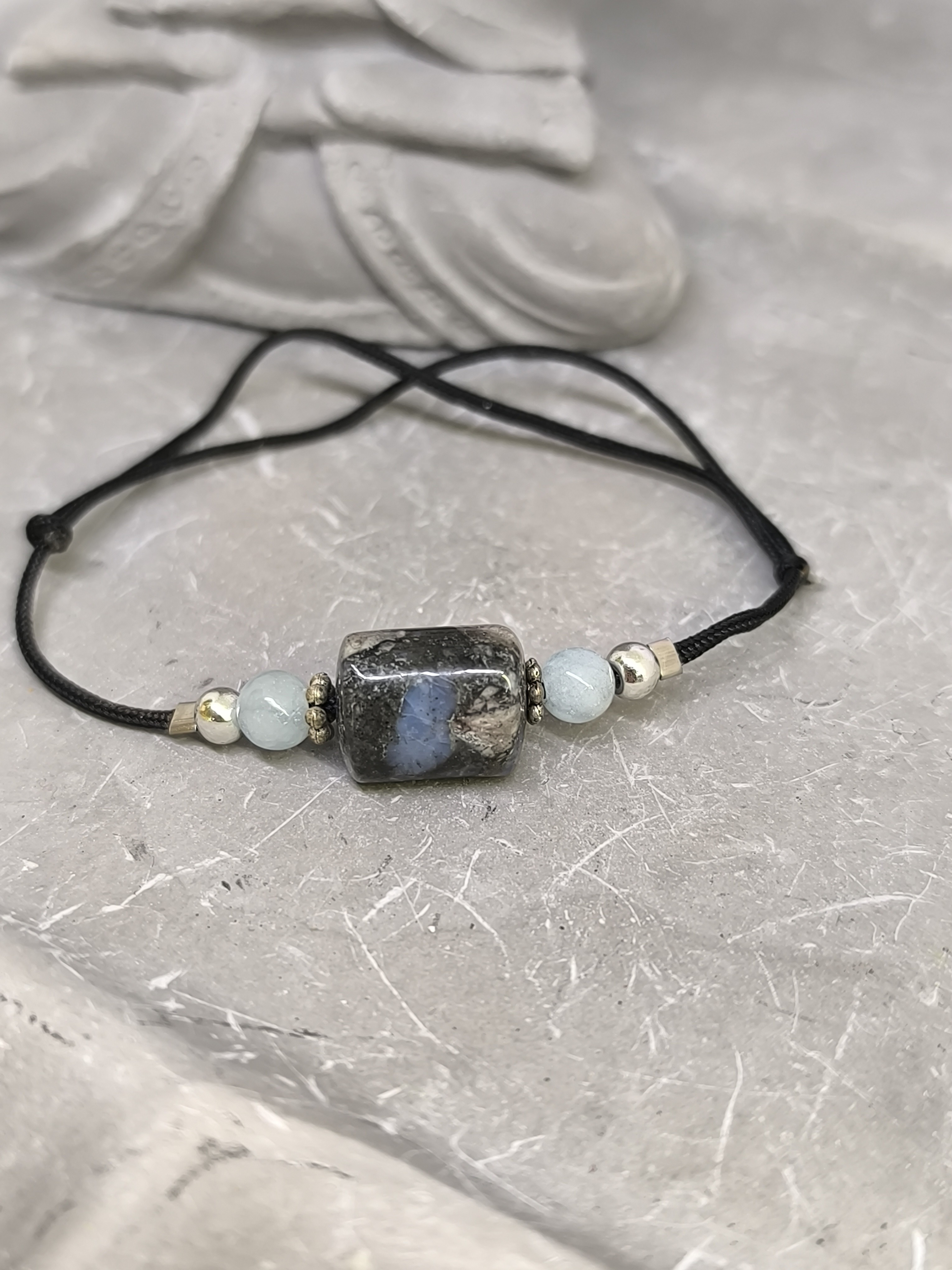 Ce bracelet en pierres naturelles associe l’opale boulder, l’aigue-marine et la labradorite, trois pierres complémentaires connues pour leur action symbolique sur l’équilibre émotionnel, la protection et la sérénité intérieure.