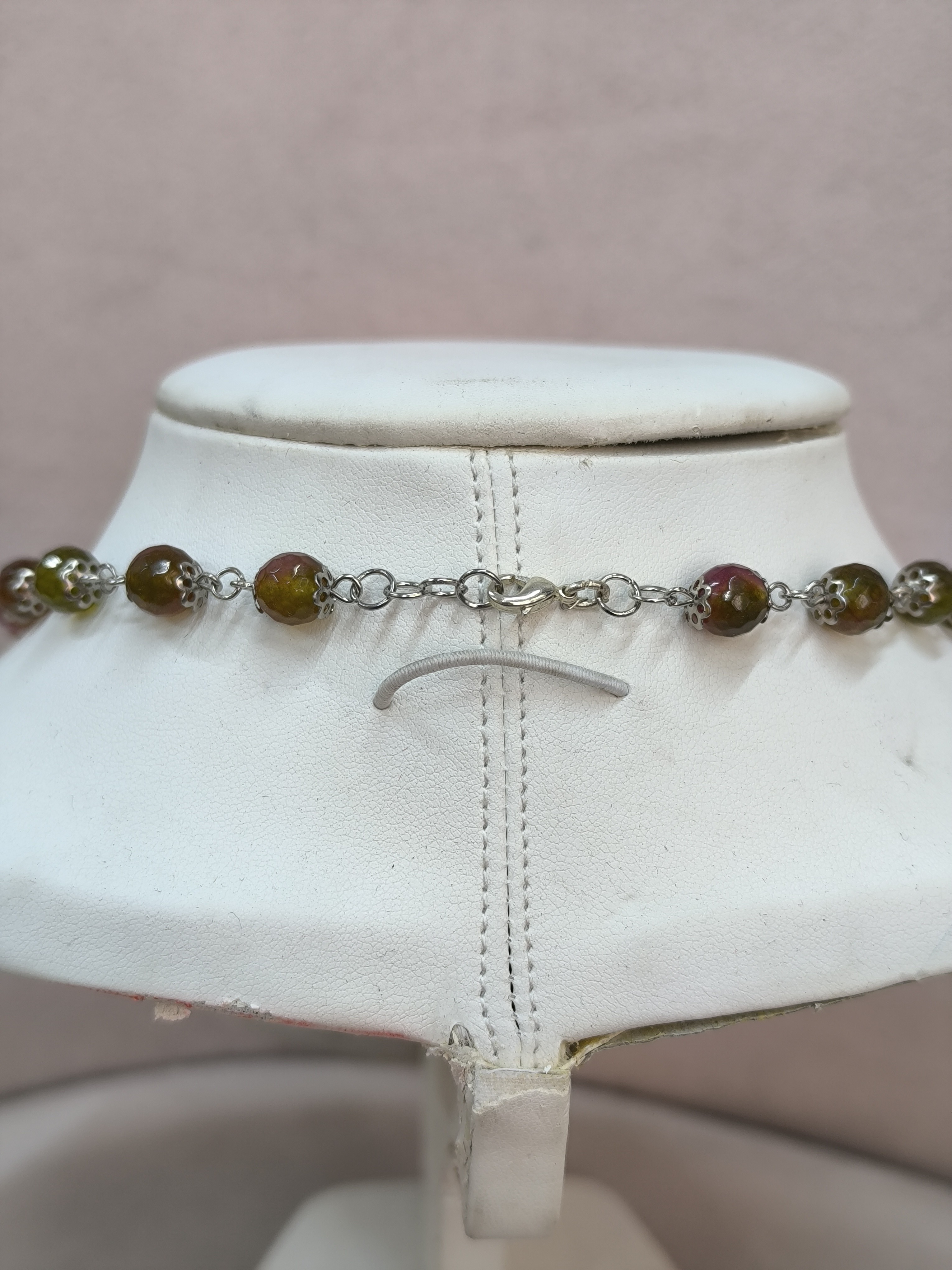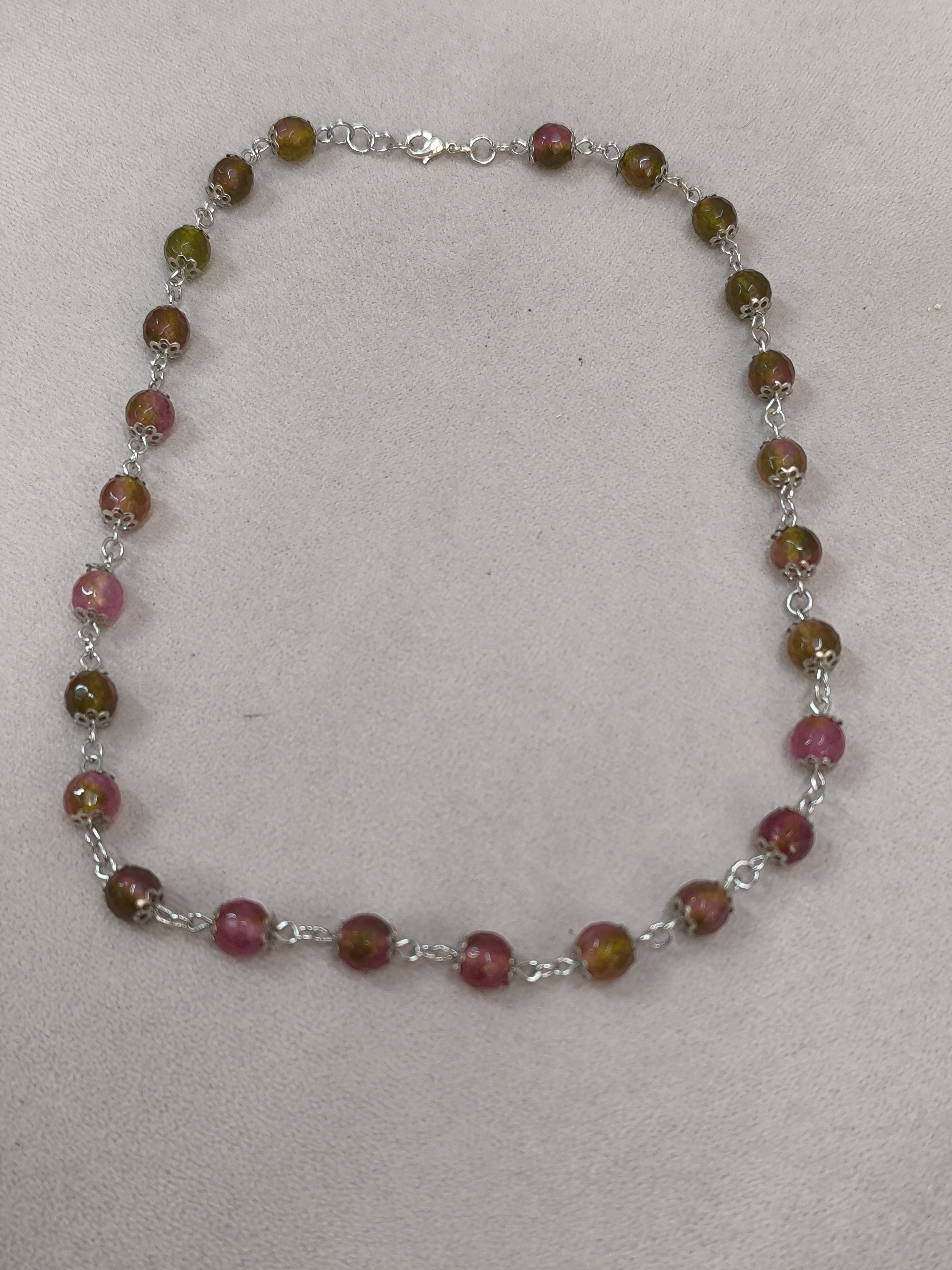 Ce collier en tourmaline melon d’eau est monté à la main avec des anneaux en zamak, élégante et résistante, et se ferme grâce à un fermoir homard, pratique et sécurisé.