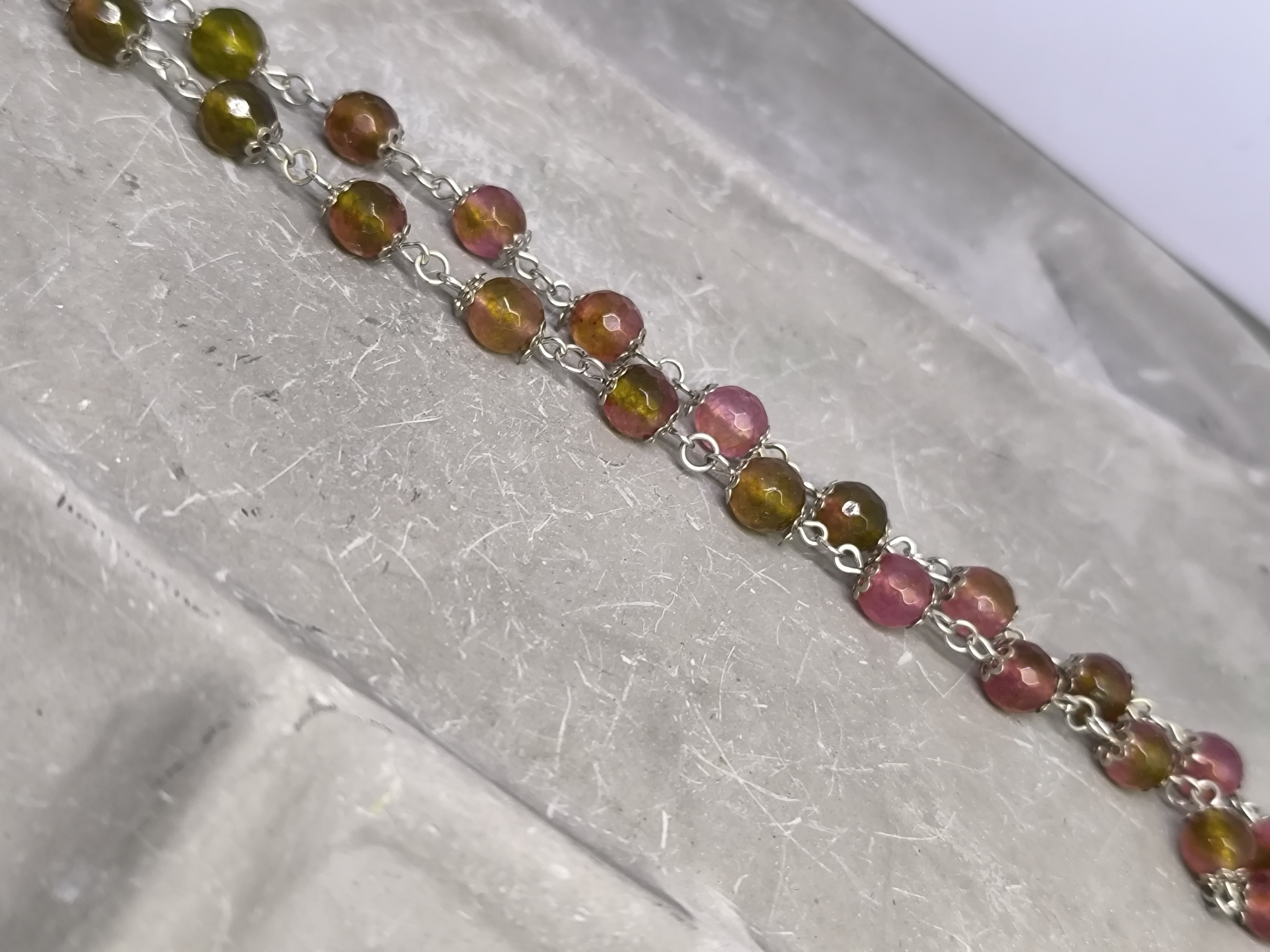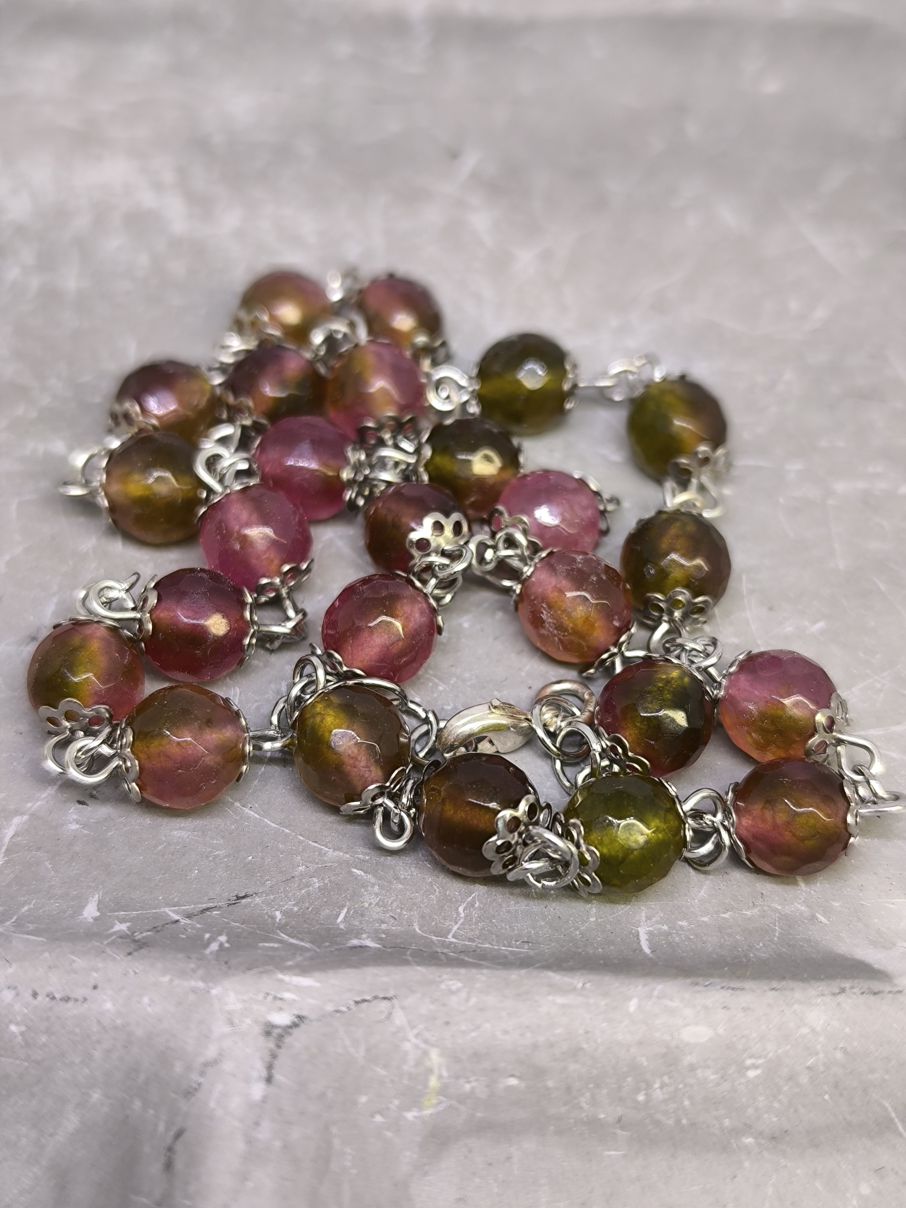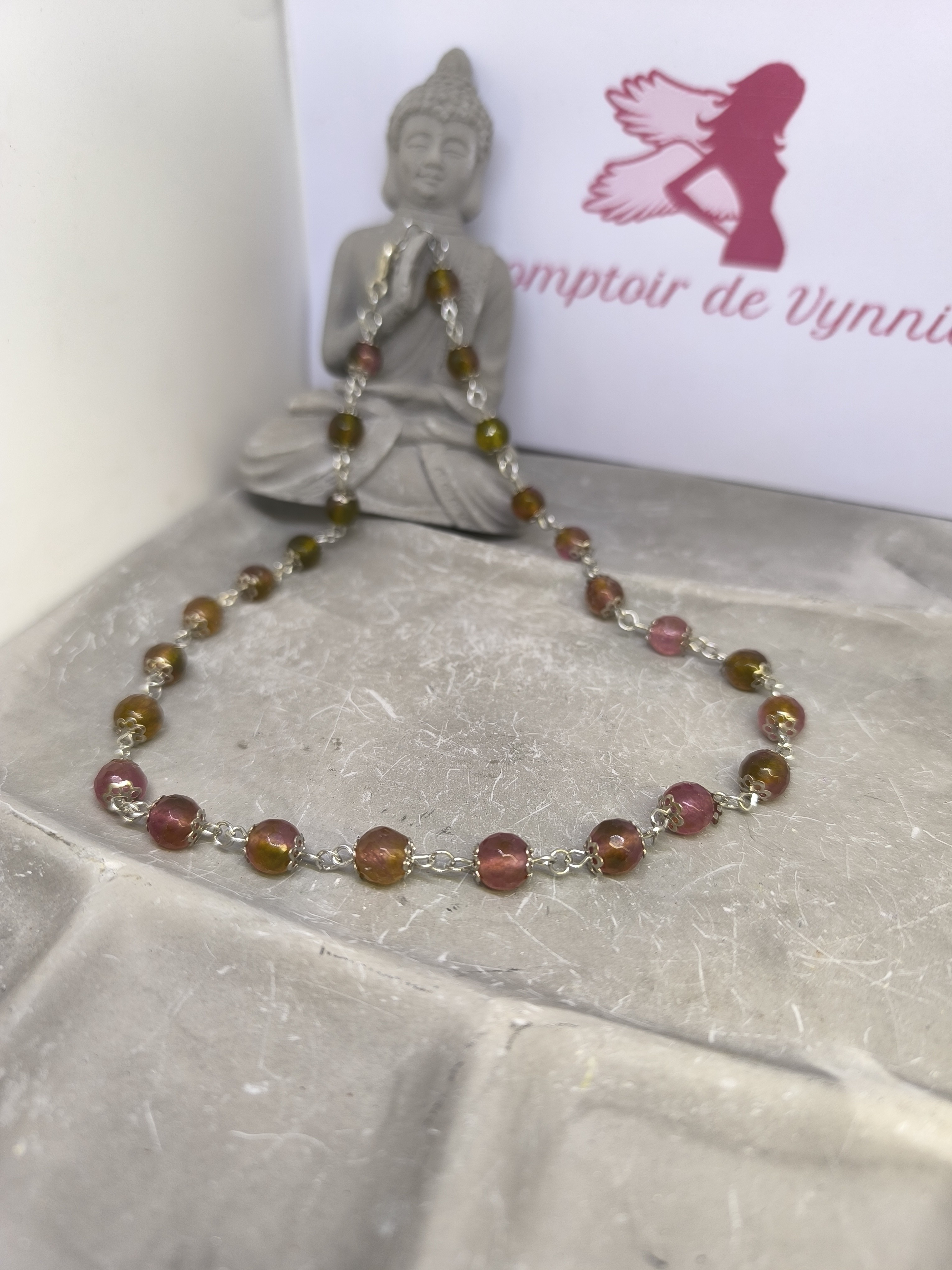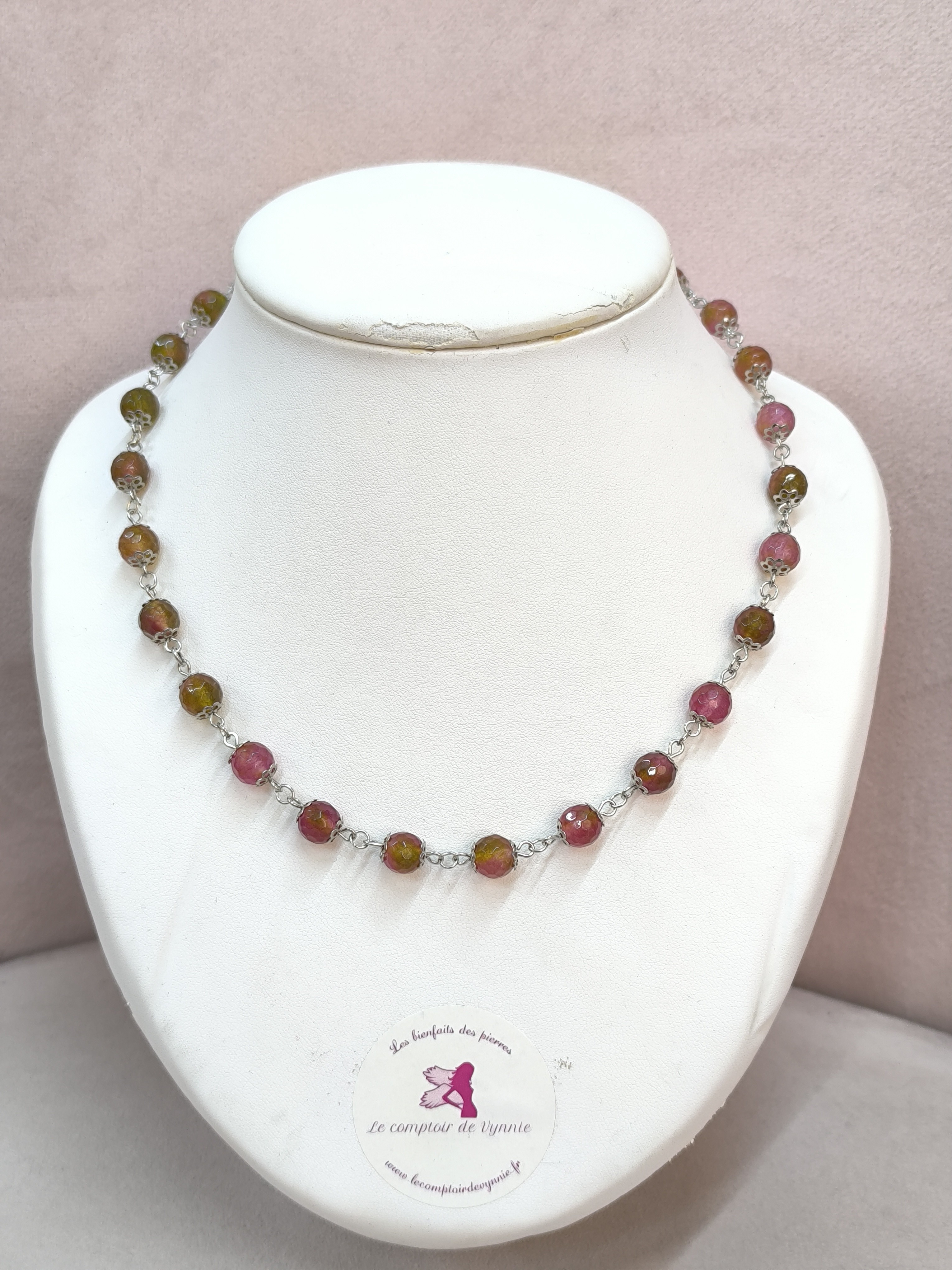 Les perles de tourmaline melon d’eau facettées offrent un jeu subtil de couleurs allant du rose au vert, symbole d’équilibre et d’harmonie. Chaque pierre étant naturelle, chaque collier est unique, avec ses propres nuances et reflets.