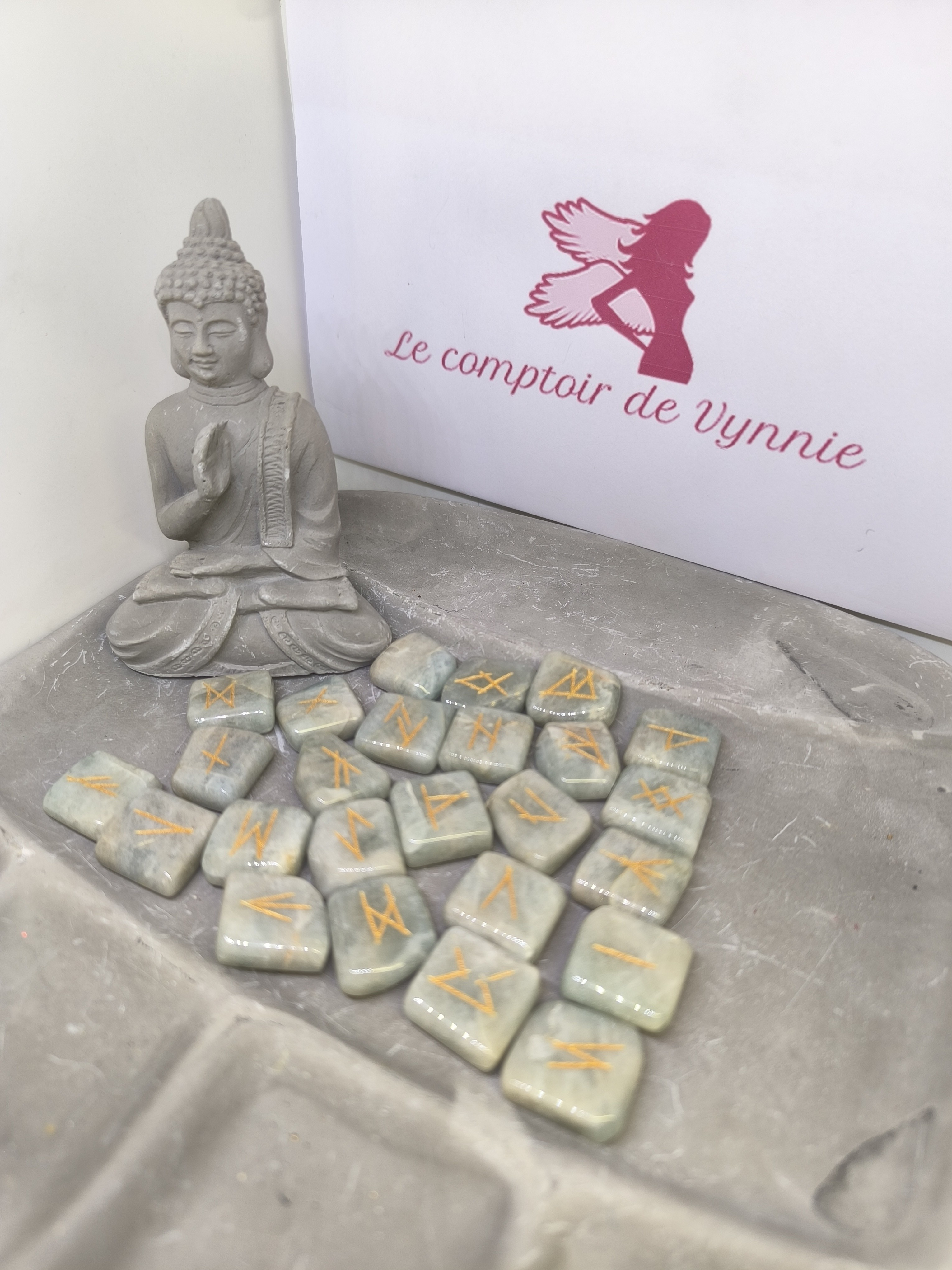 Ce jeu de runes en aigue-marine naturelle, délicatement gravées de symboles dorés, est un outil de divination à la fois élégant, apaisant et symbolique. Chaque rune est taillée dans une pierre naturelle d’aigue-marine, puis marquée d’une écriture dorée qui met en valeur la symbolique ancestrale des runes.