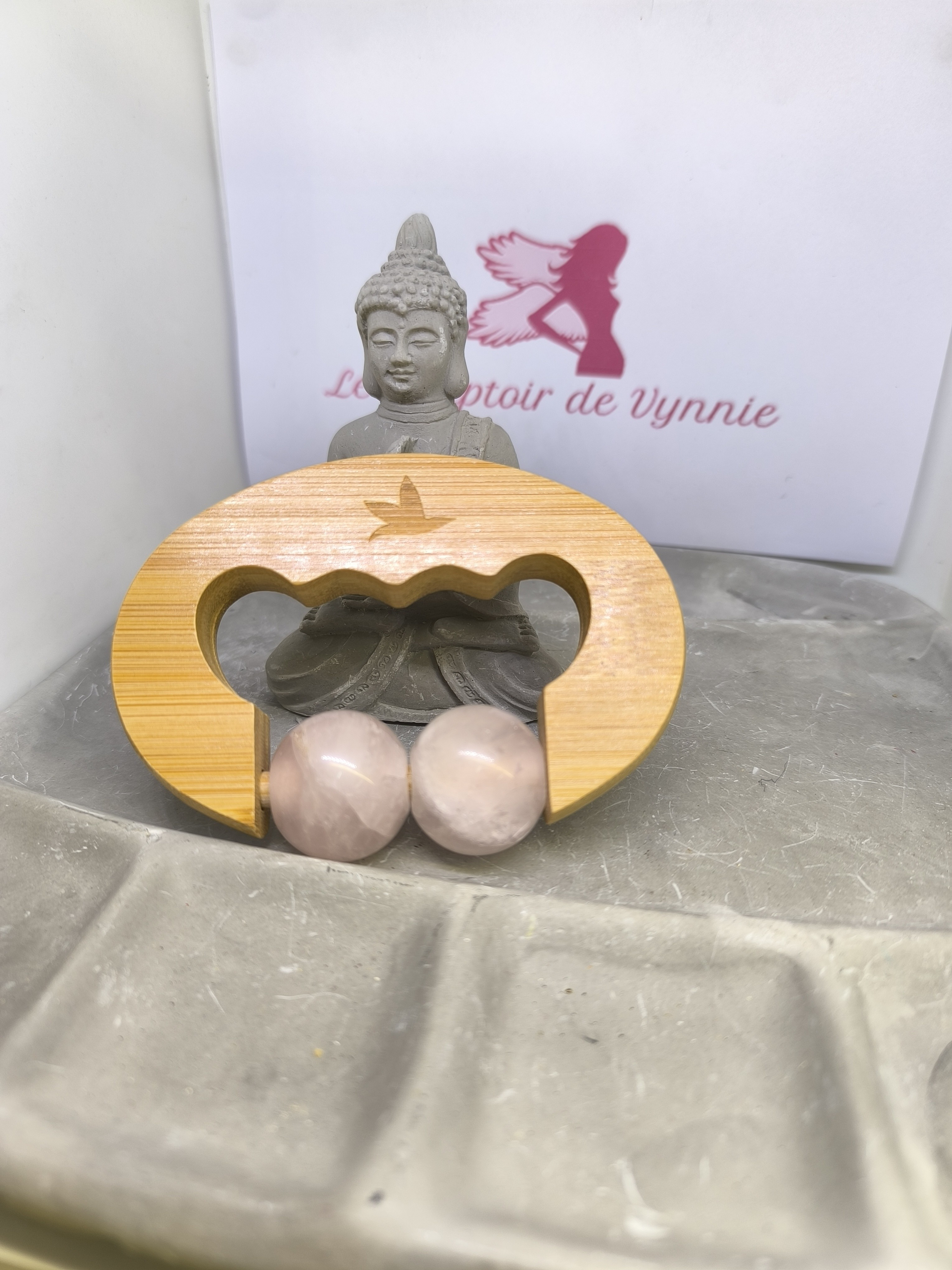 Ce boulier de massage en quartz rose naturel est un accessoire de bien-être conçu pour offrir un massage doux, apaisant et enveloppant. Il se compose de deux sphères en quartz rose lisse, montées sur une structure ergonomique en bois, facilitant la prise en main et les mouvements de massage.