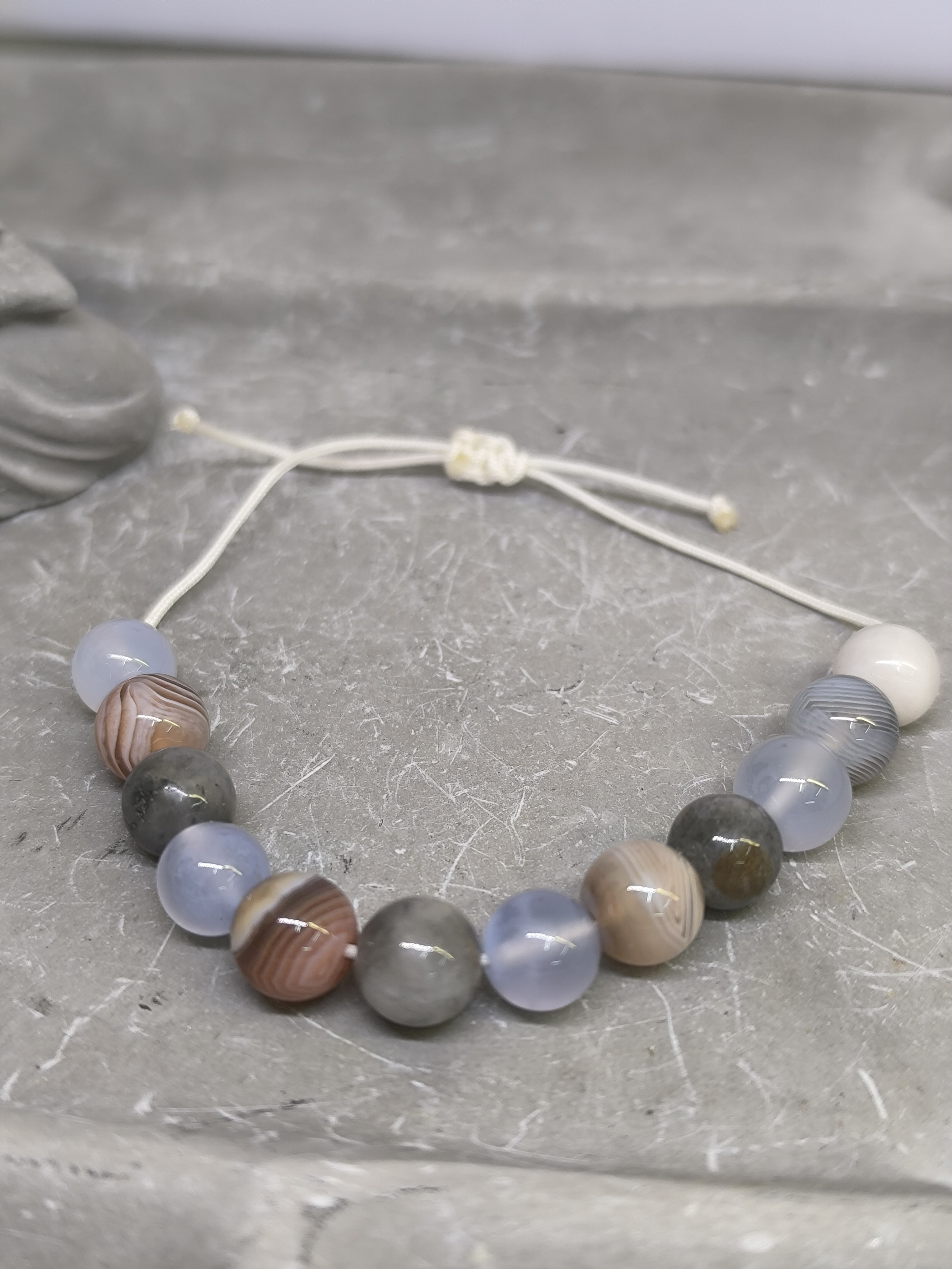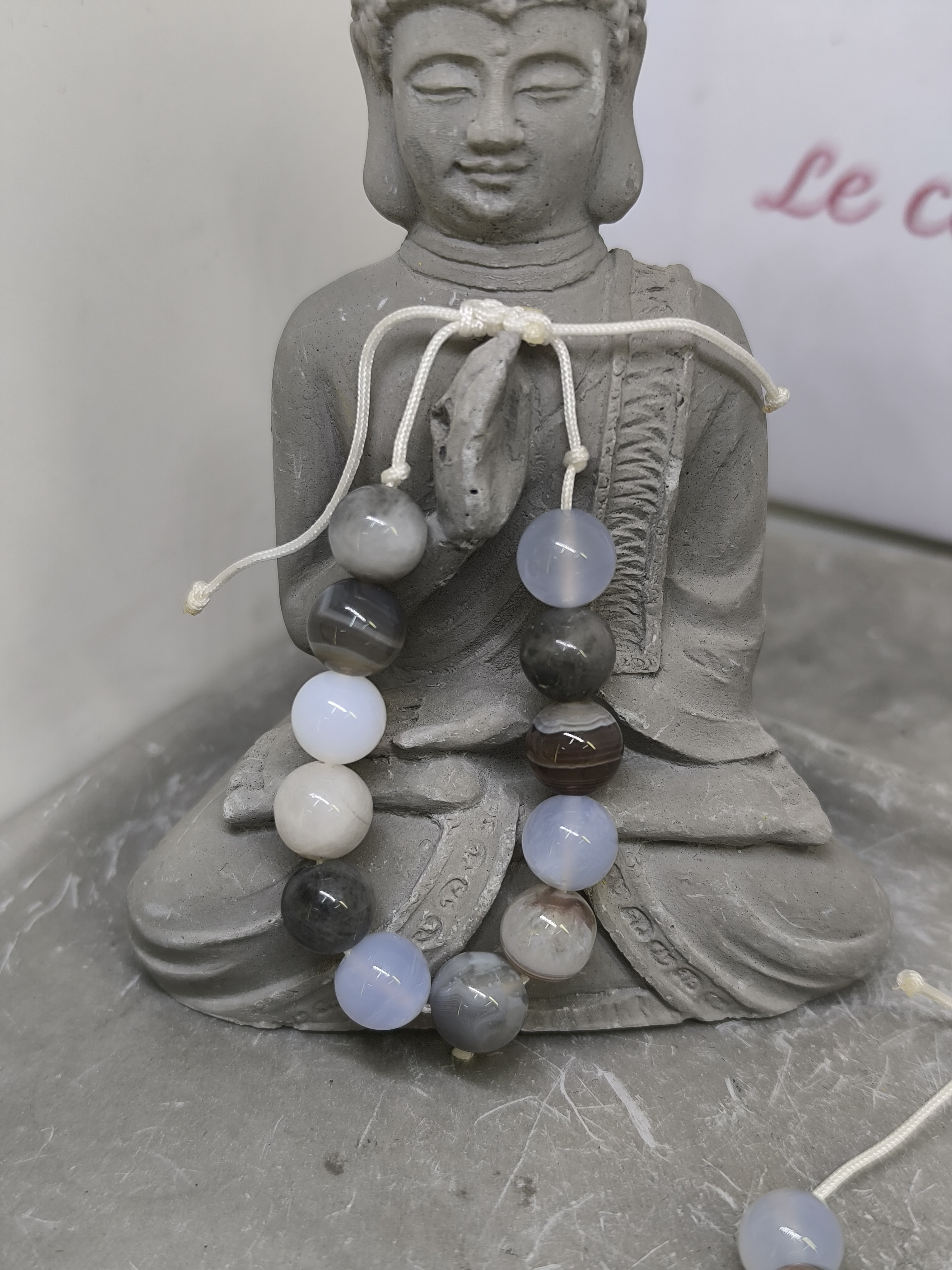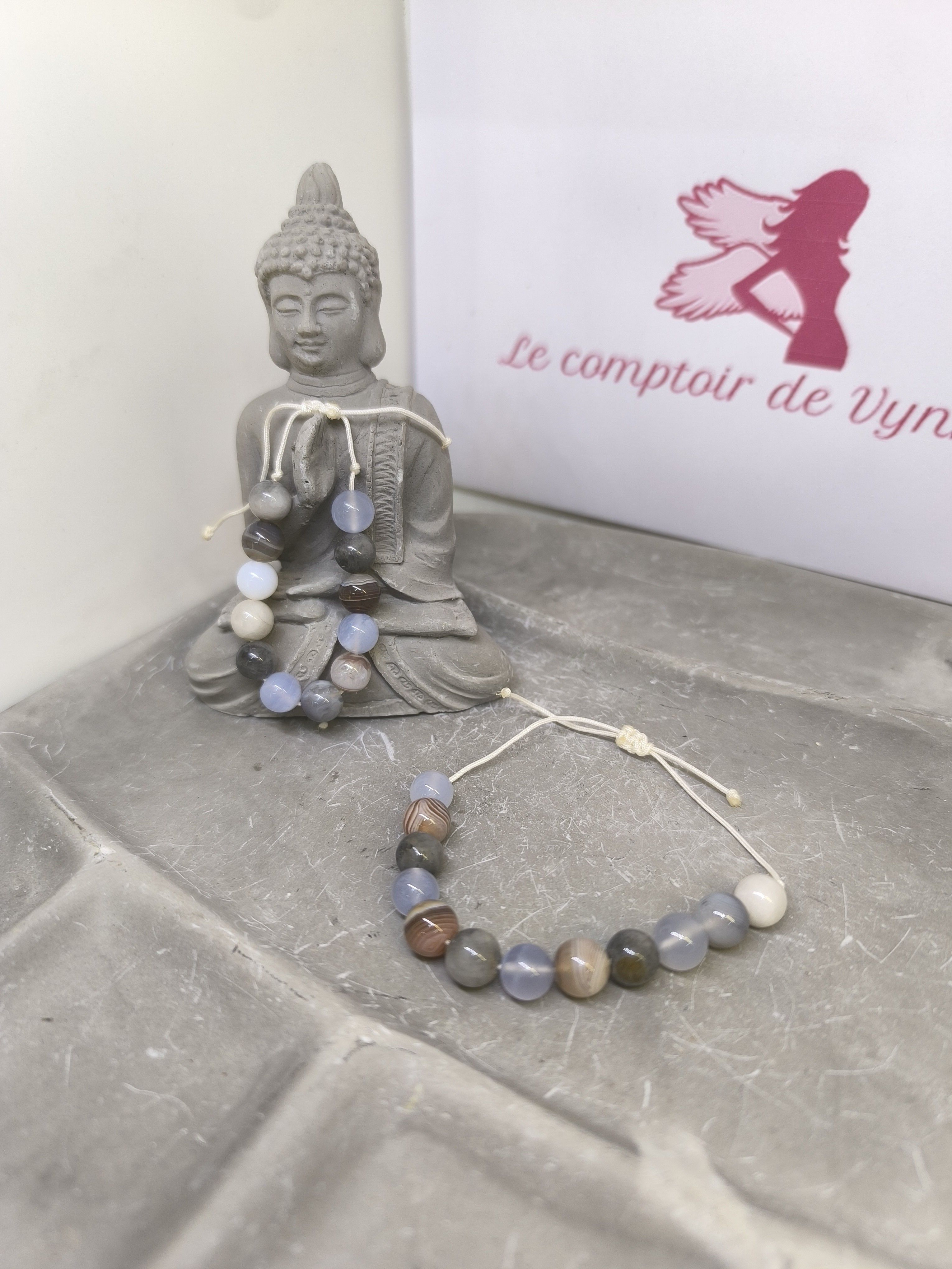 Il associe la douceur apaisante de la calcédoine bleue à l’action rééquilibrante de l’agate du Botswana, deux pierres traditionnellement reliées à la respiration, à l’air et au souffle.