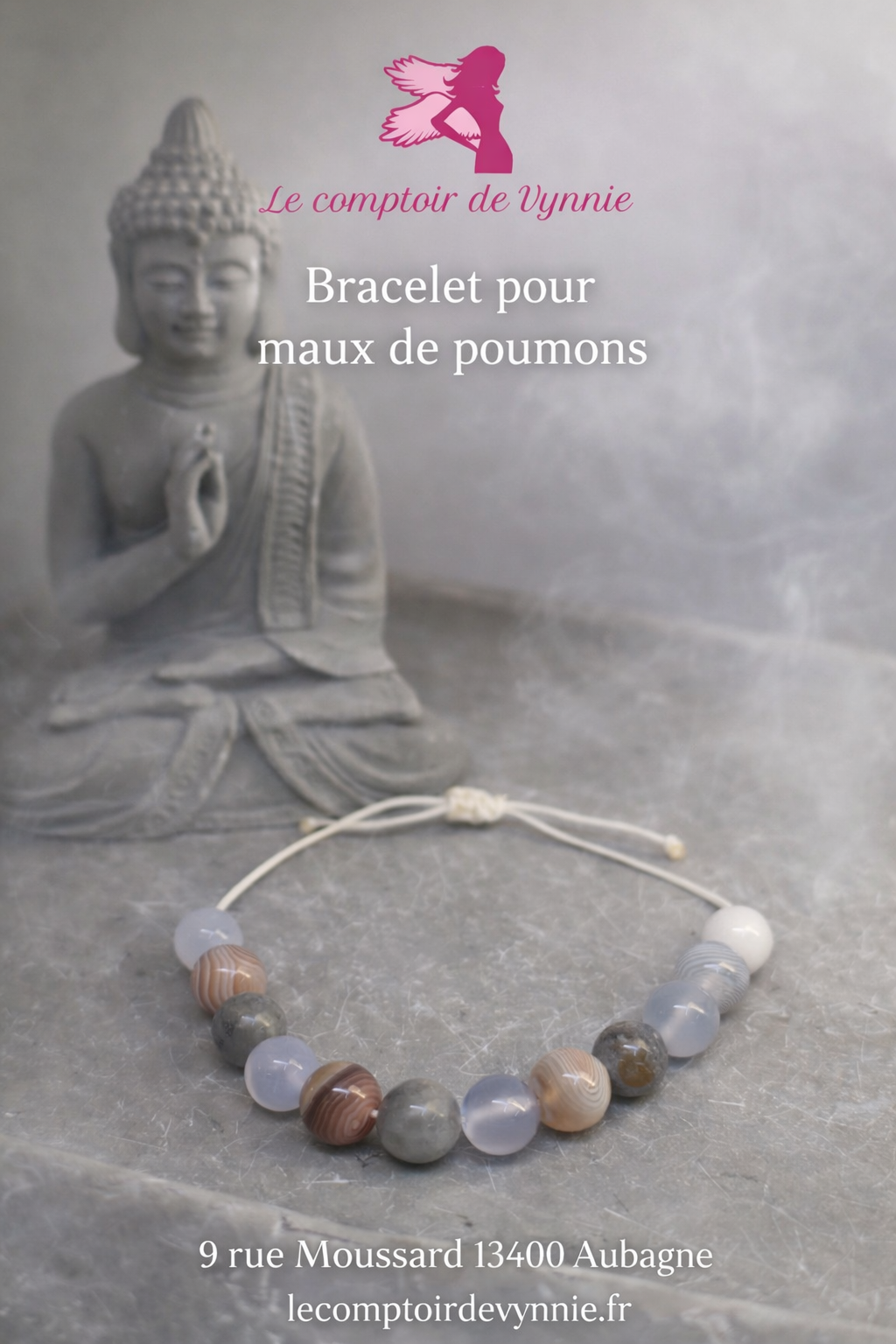 Ce bracelet a été conçu pour accompagner les personnes ressentant des inconforts liés à la sphère respiratoire, en particulier les poumons, sur le plan du bien-être physique et énergétique.