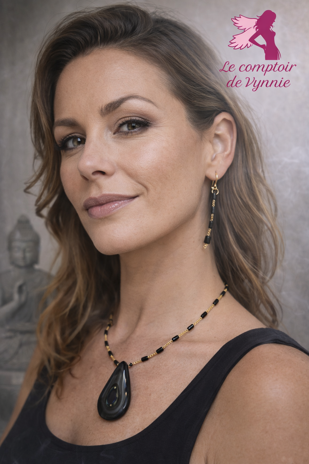 La chaîne est ponctuée de perles d’onyx, tandis que le pendentif central est une obsidienne œil céleste, taillée en forme goutte, aux reflets profonds et mystérieux.