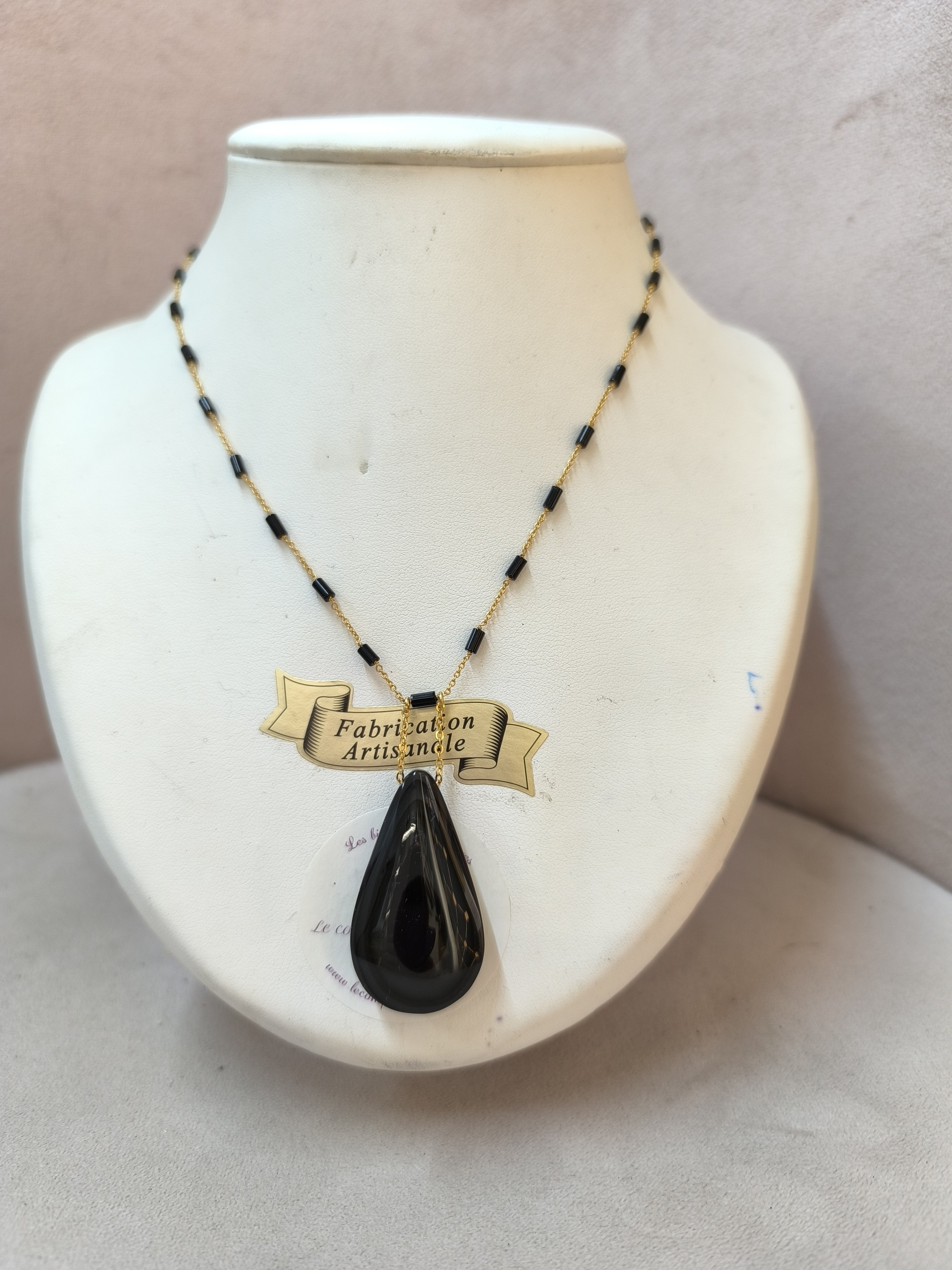 Ce collier pièce unique est monté sur une chaîne plaqué or 5 microns, élégante et résistante, d’une longueur de 60 cm, offrant un porté fluide et équilibré.