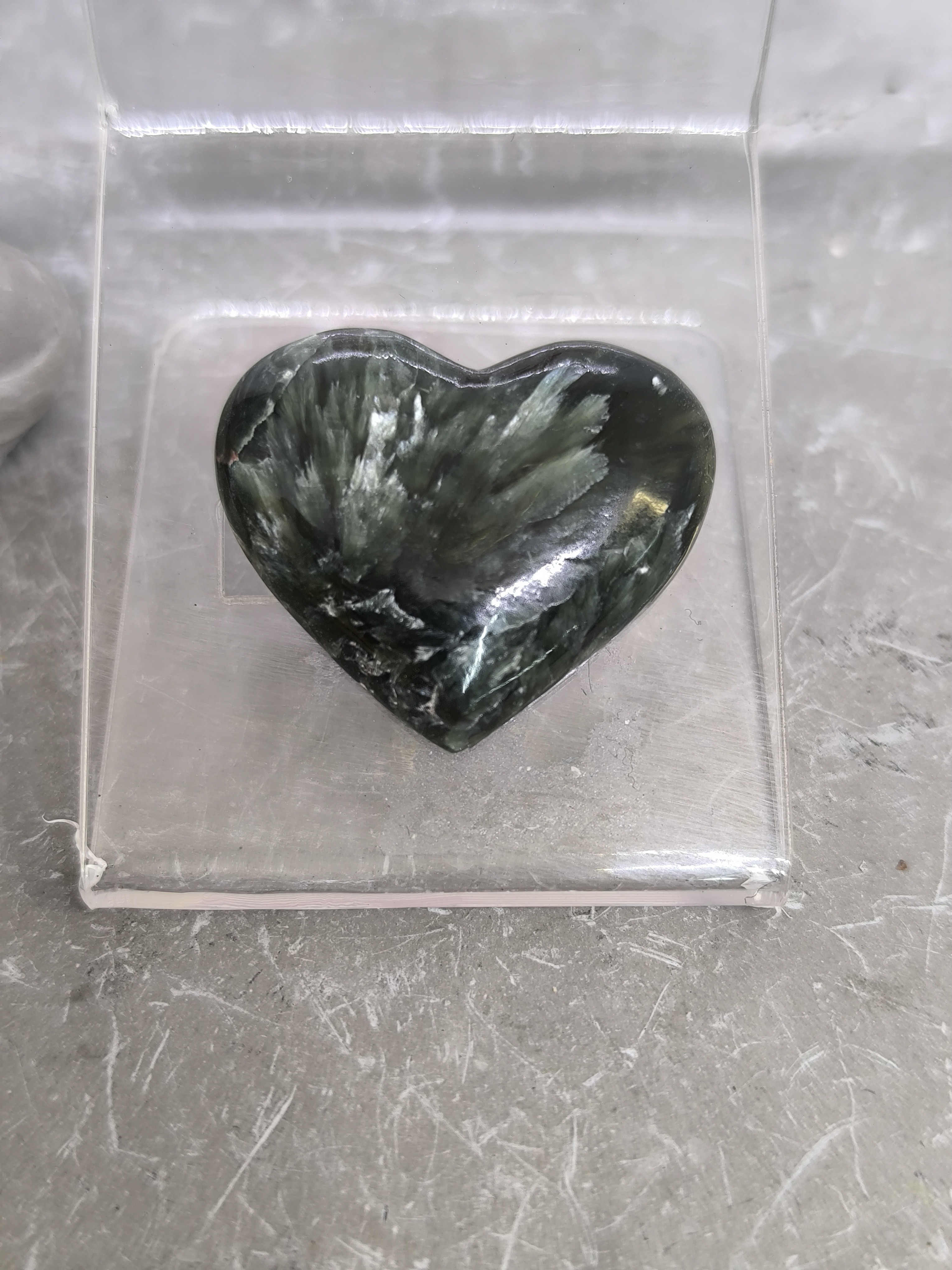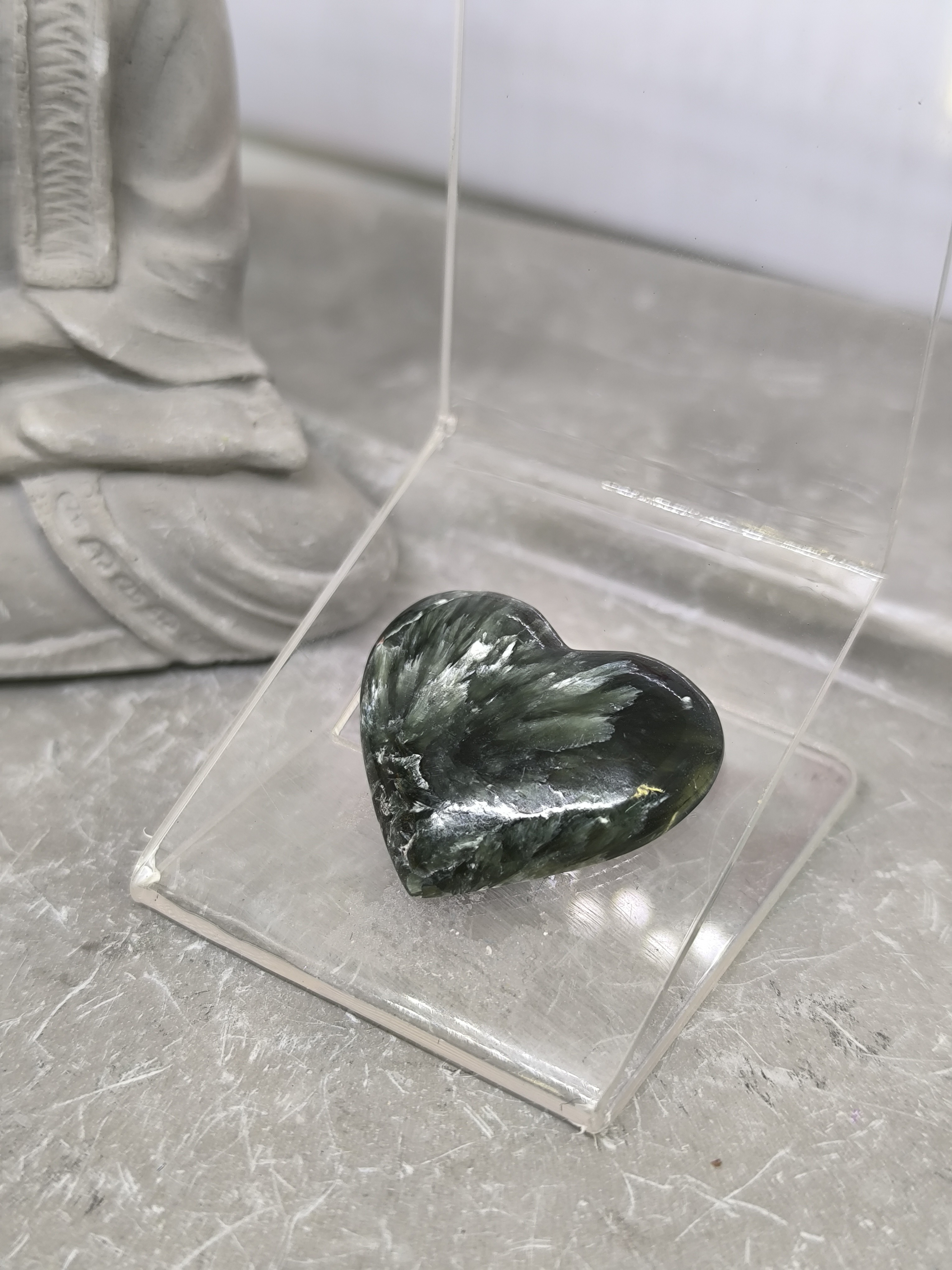 Polie en forme de cœur, cette pierre révèle une texture chatoyante évoquant des ailes ou des plumes, signature naturelle de la séraphinite.