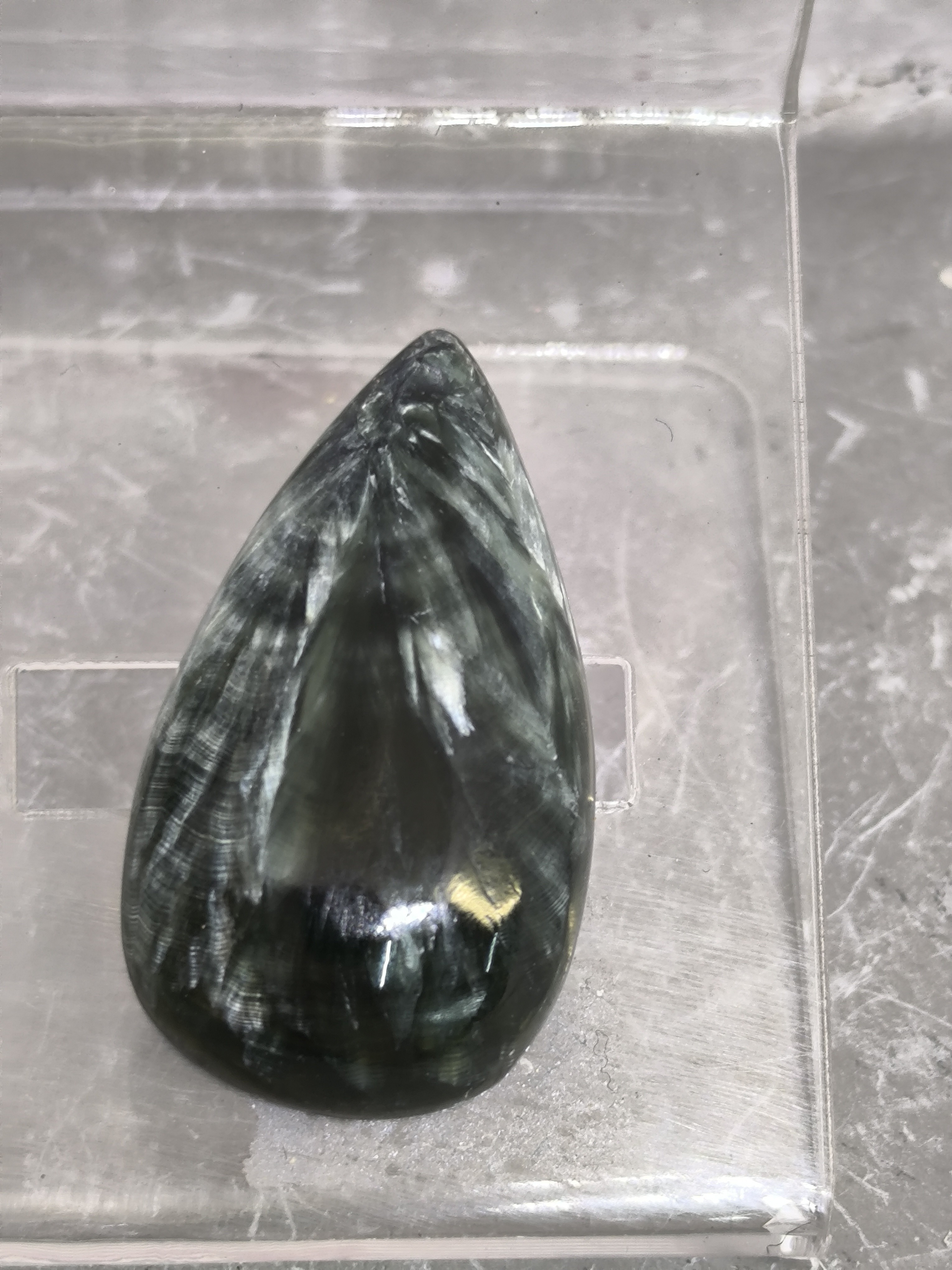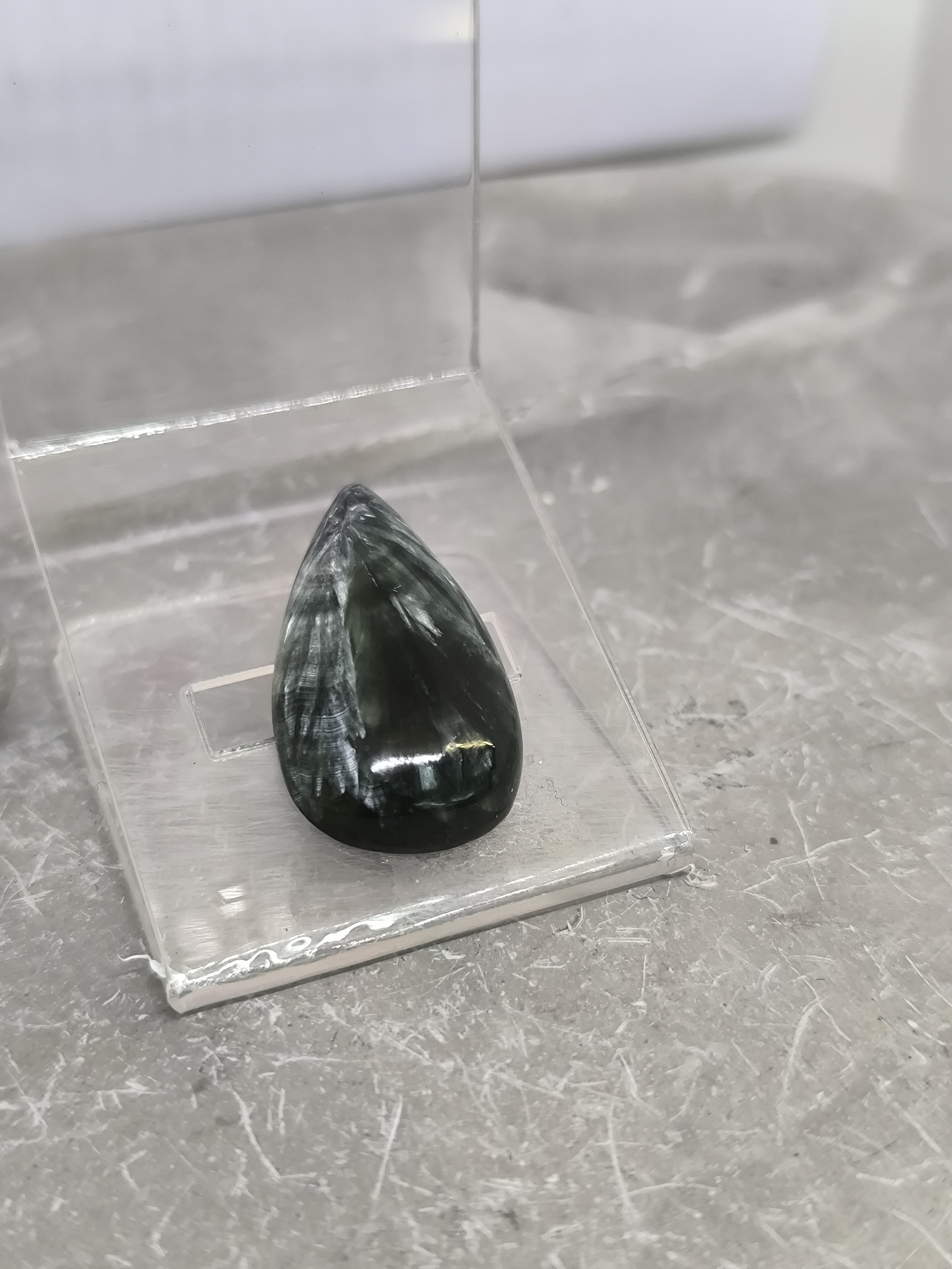 Ses motifs internes en forme de plumes soyeuses, typiques de cette pierre rare, lui donnent un aspect vivant et presque lumineux selon l’angle de la lumière.