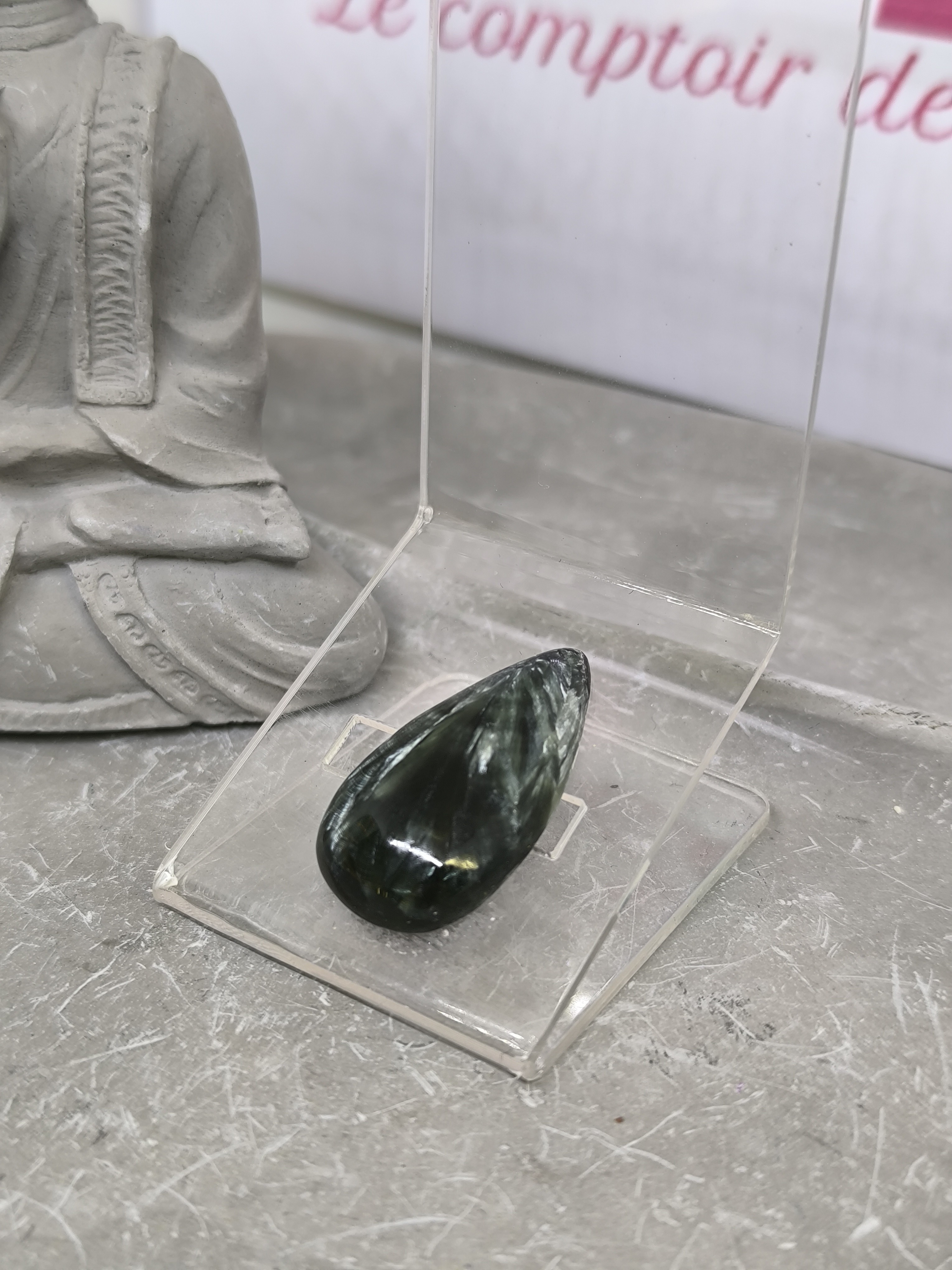 La forme goutte est une forme profondément symbolique. Elle évoque à la fois l’eau, la vie, la purification et le lâcher-prise. Associée à la séraphinite, pierre déjà réputée pour sa vibration apaisante, cette forme renforce son message de douceur et de transformation intérieure.