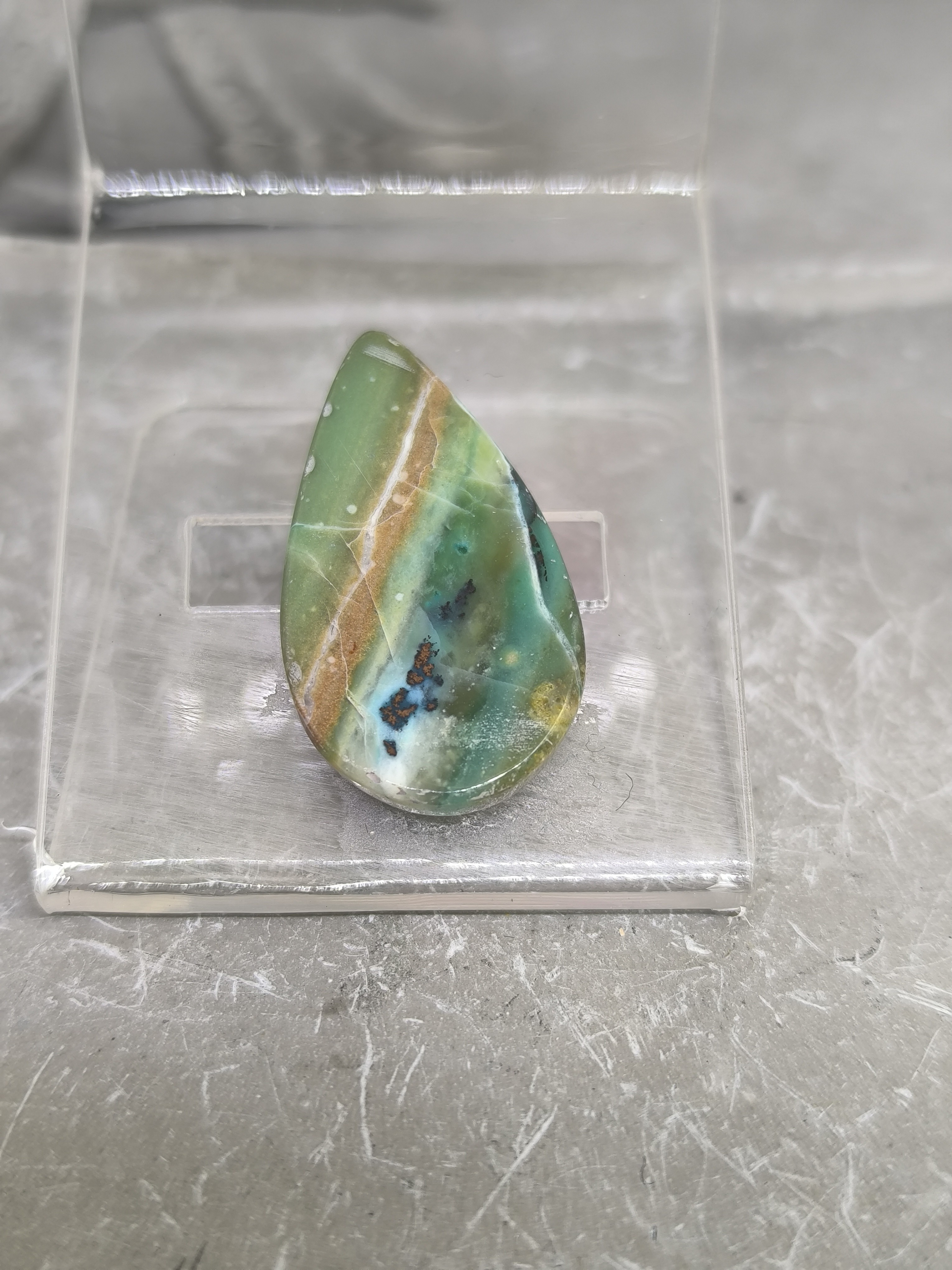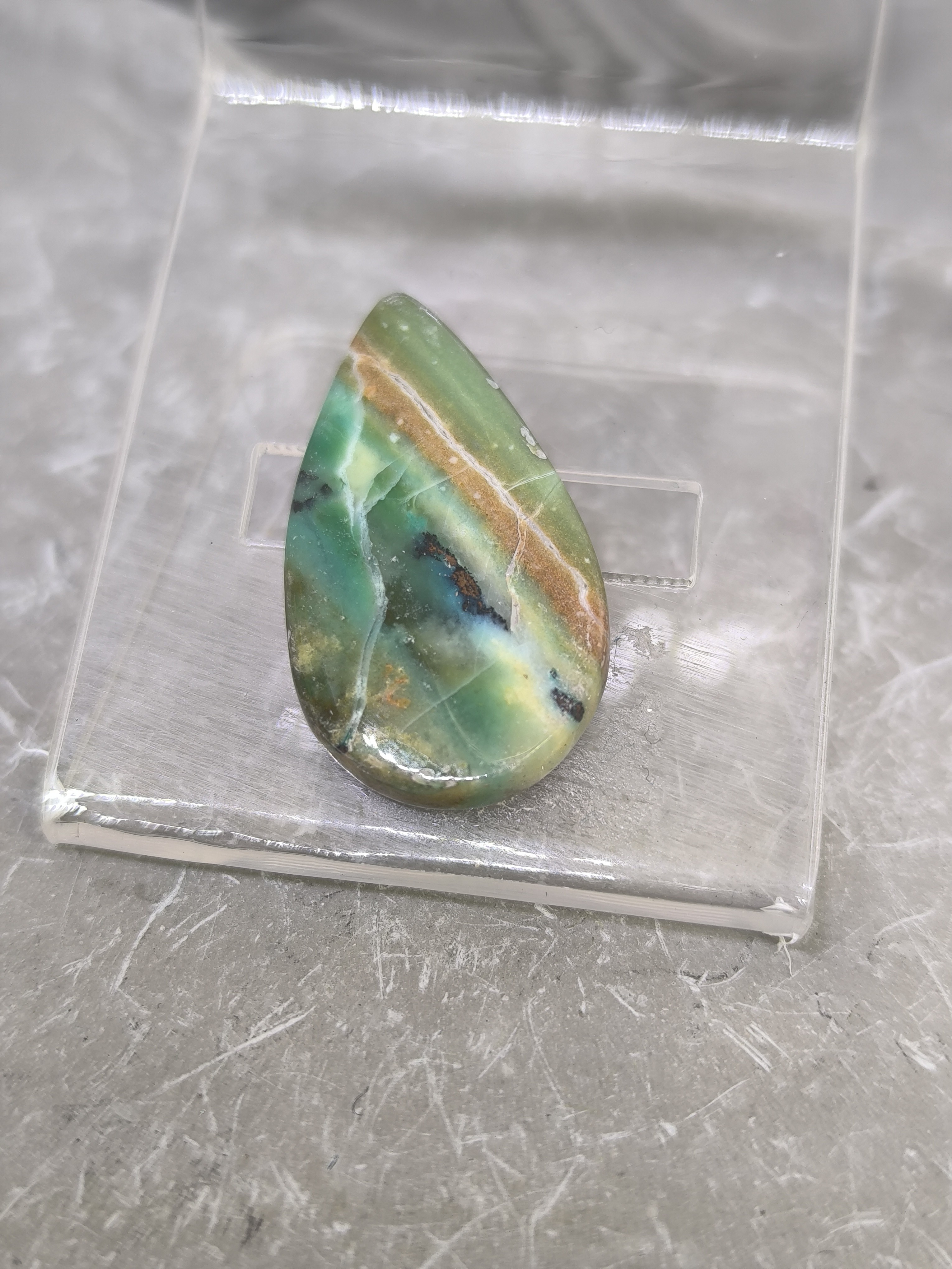 Ses teintes harmonieuses de bleu, vert et marron évoquent la nature, la terre et l’eau, créant une pierre à la fois apaisante et profondément enracinée.