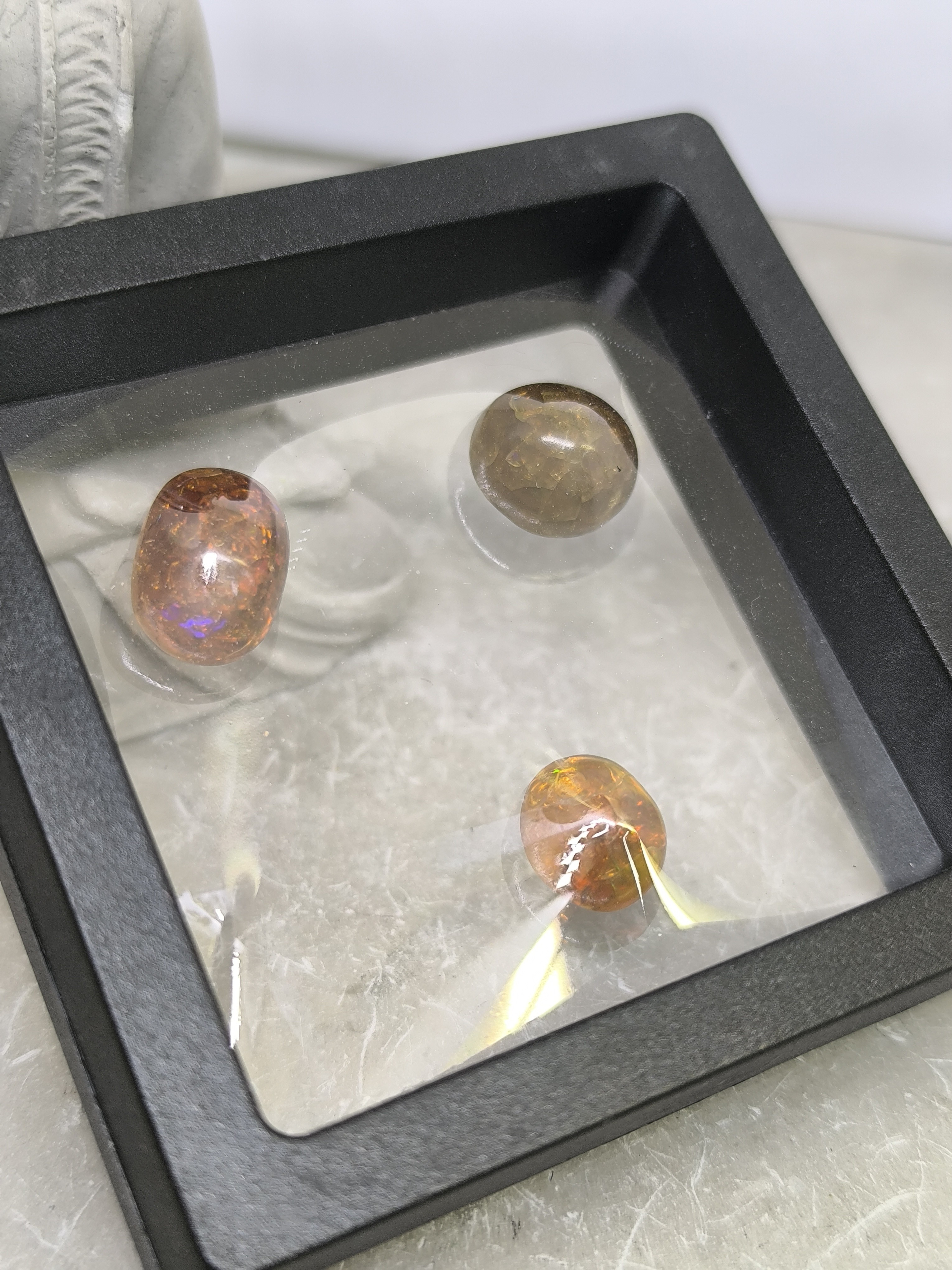 Ce lot de 3 opales de feu naturelles est composé de pièces uniques, soigneusement sélectionnées pour leur brillance exceptionnelle, leurs jeux de lumière intenses et leurs teintes chaudes et profondes.