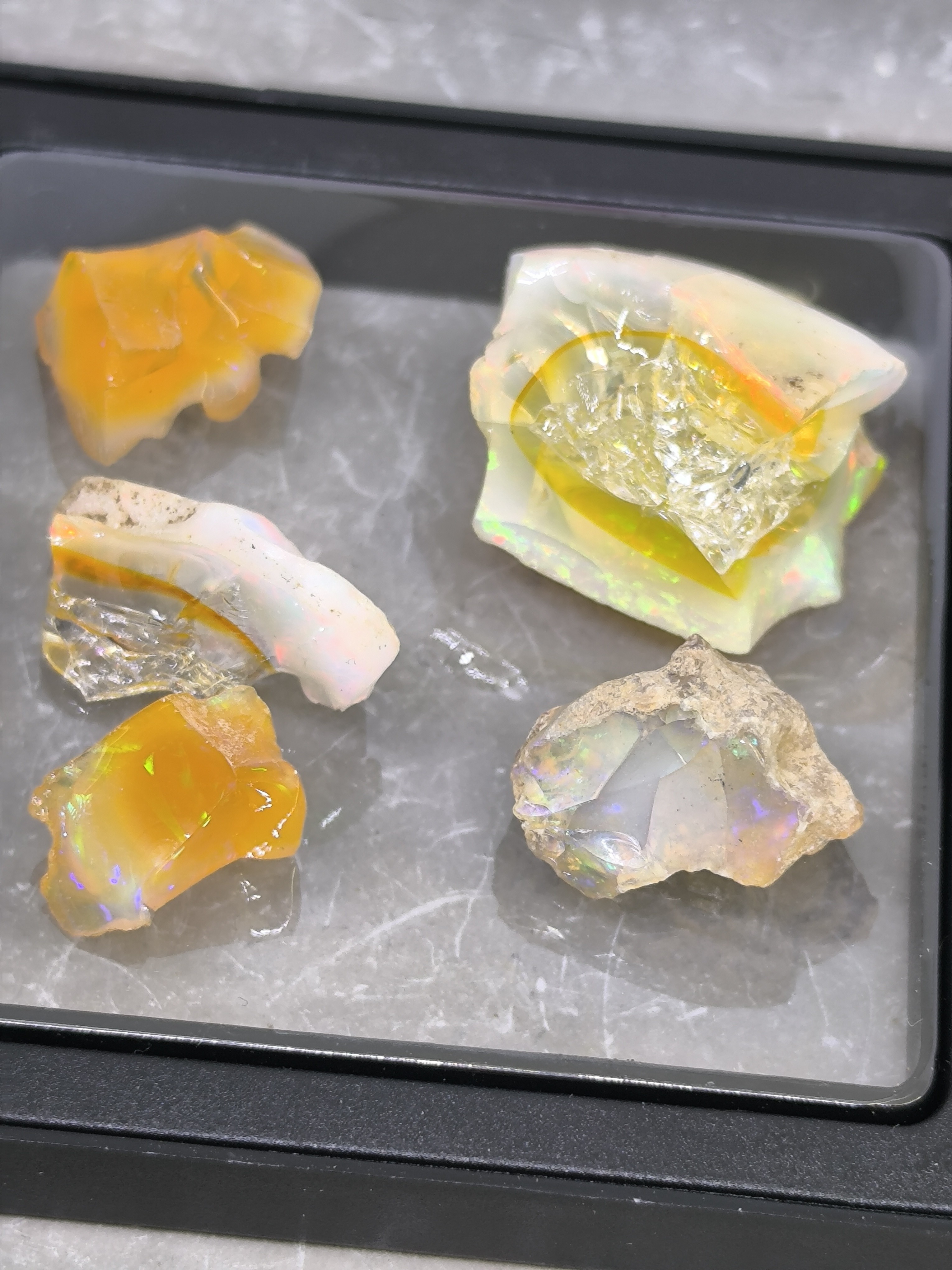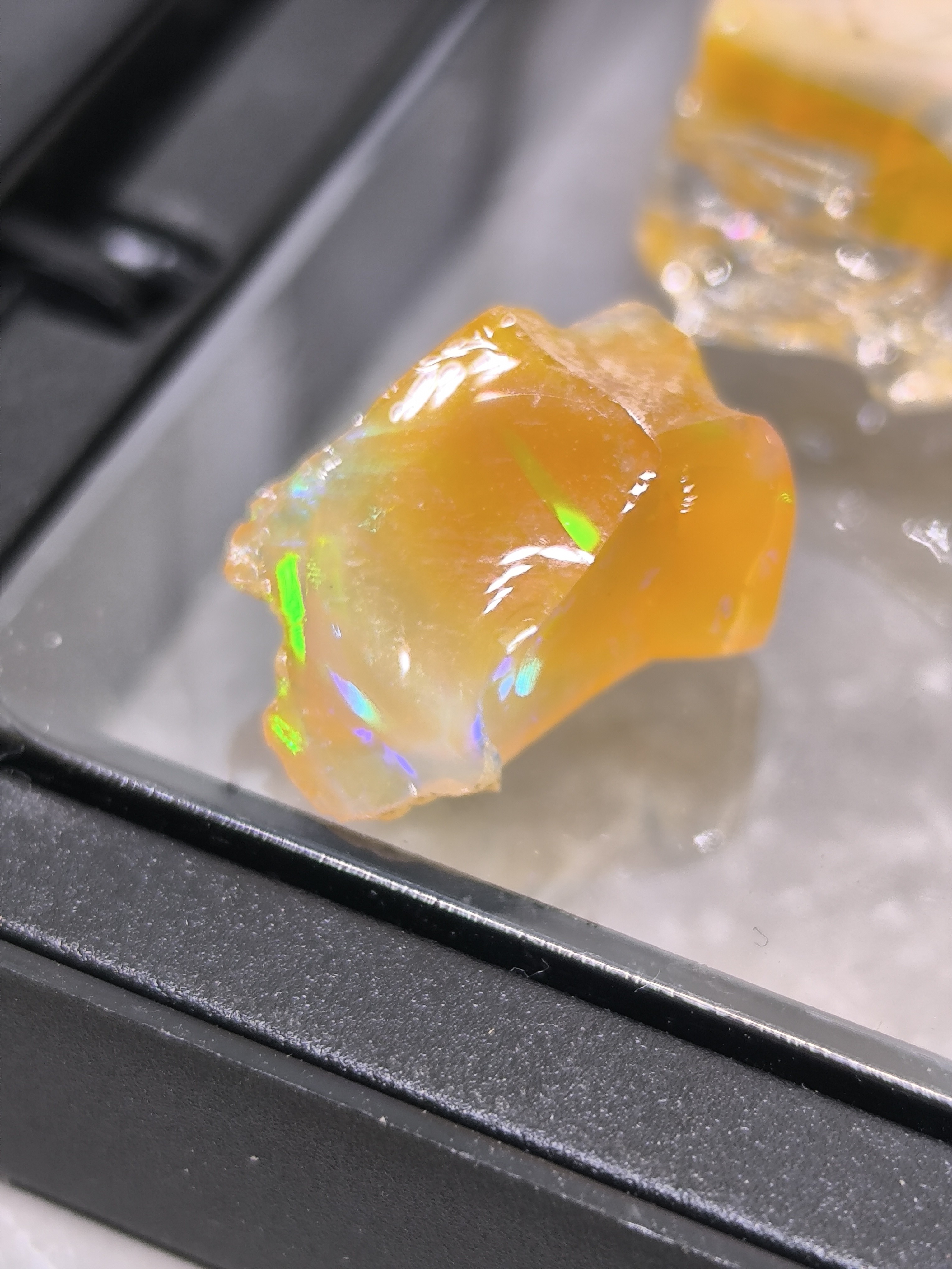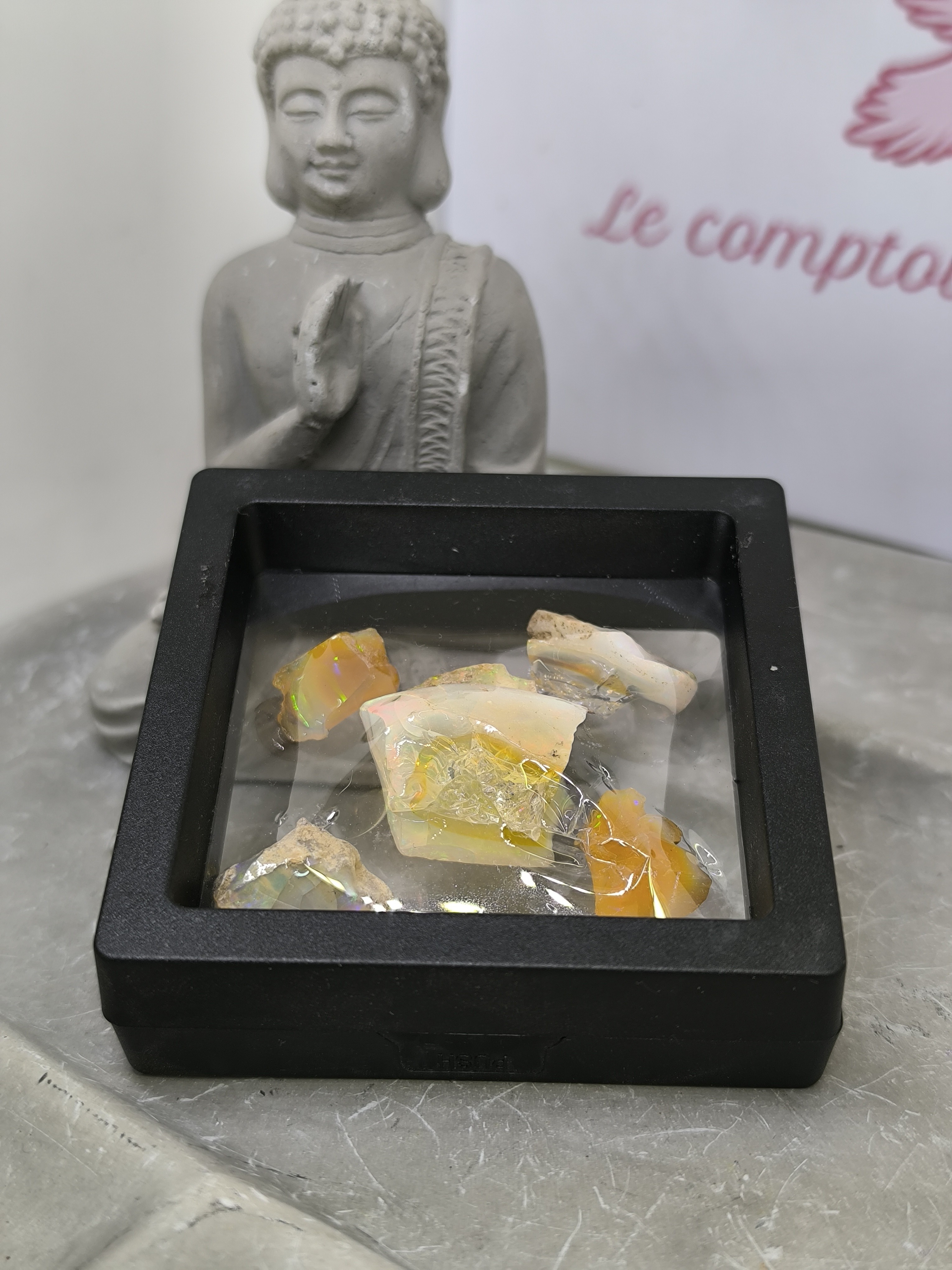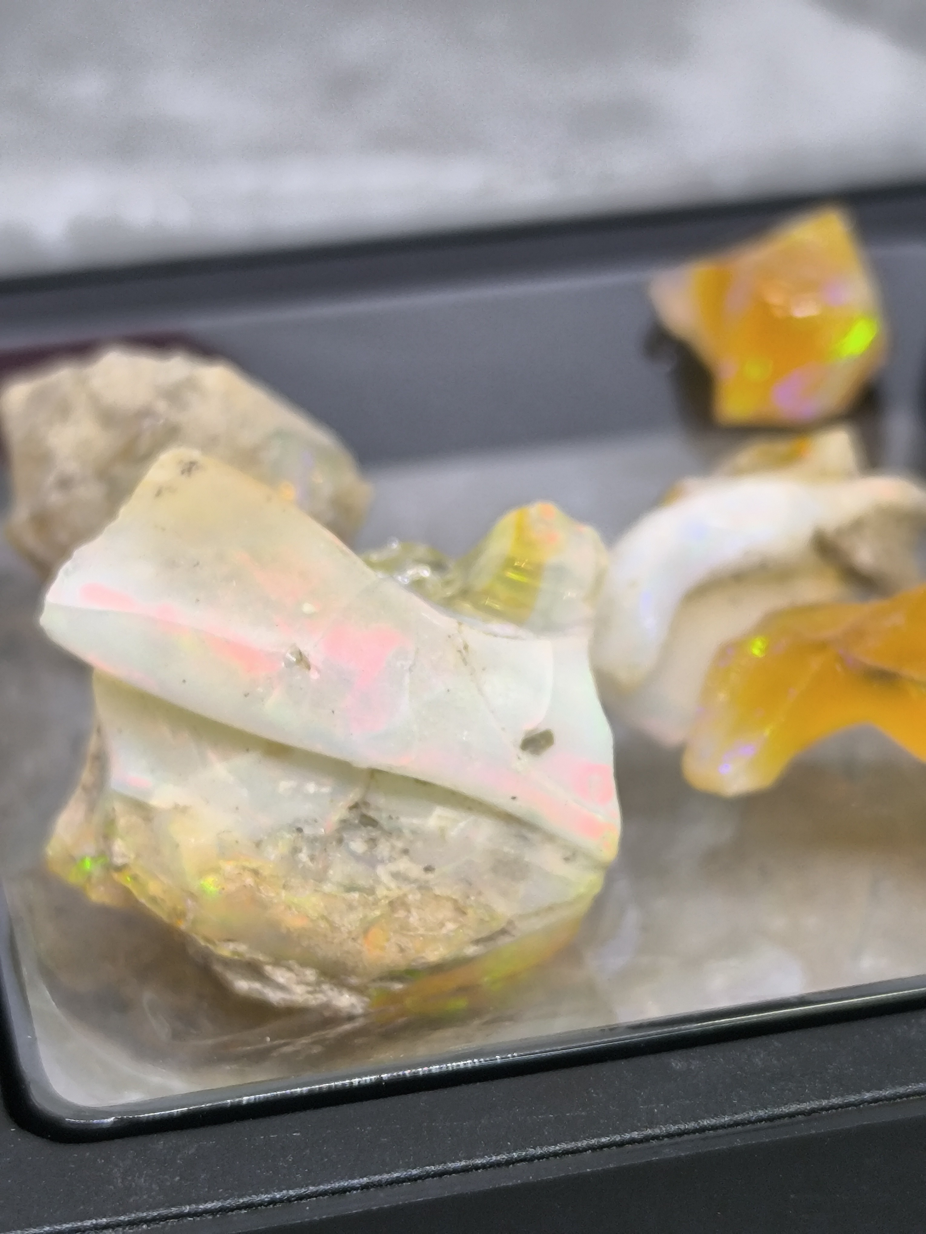 Ces opales se distinguent par leur brillance remarquable et leurs reflets multicolores spectaculaires. Selon l’angle et la lumière, elles dévoilent une palette riche et vivante : blanc lacté, rouge, orange, jaune, vert, violet, bleu, ainsi que des zones translucides à transparentes, caractéristiques des opales éthiopiennes de qualité.