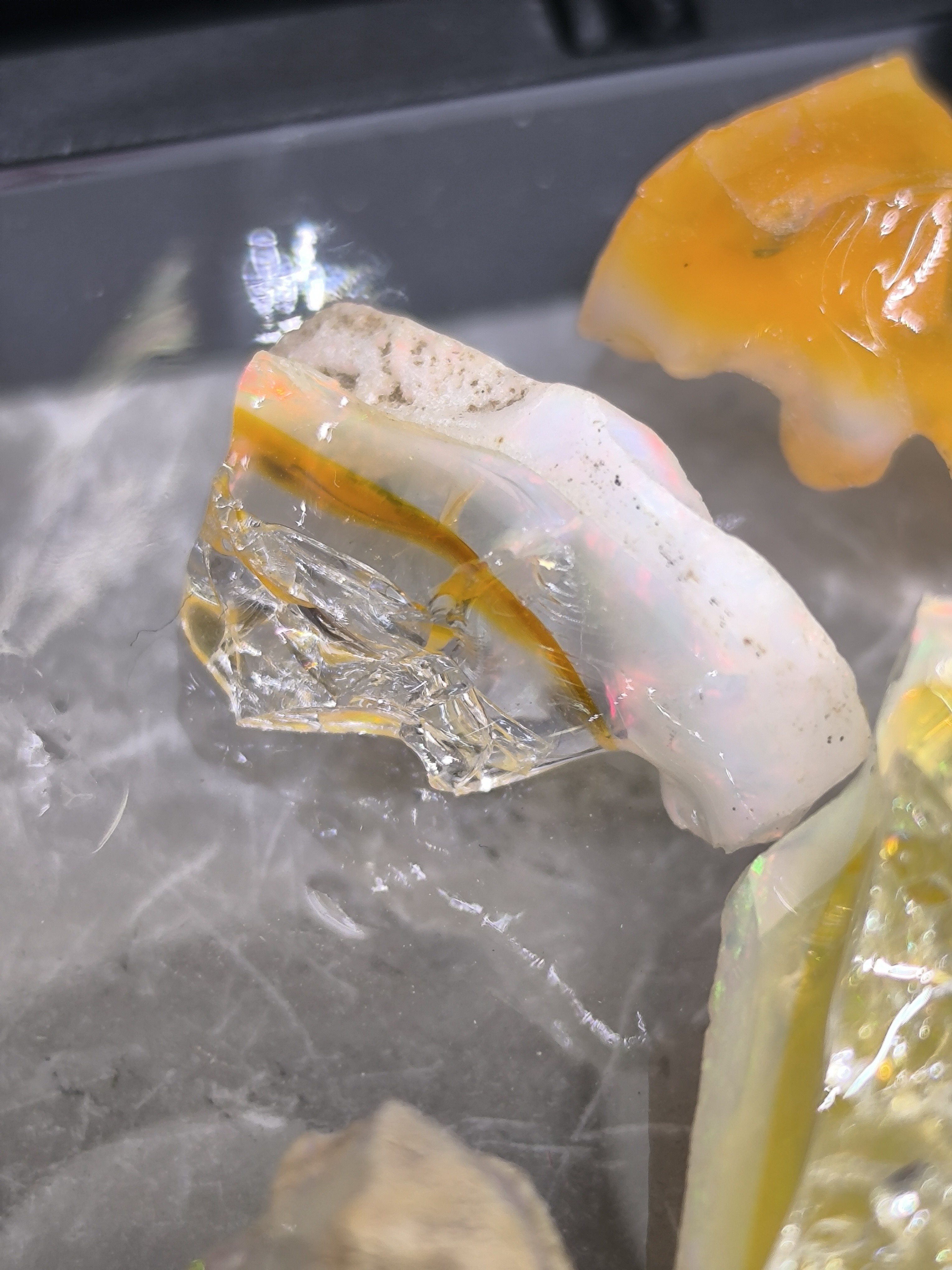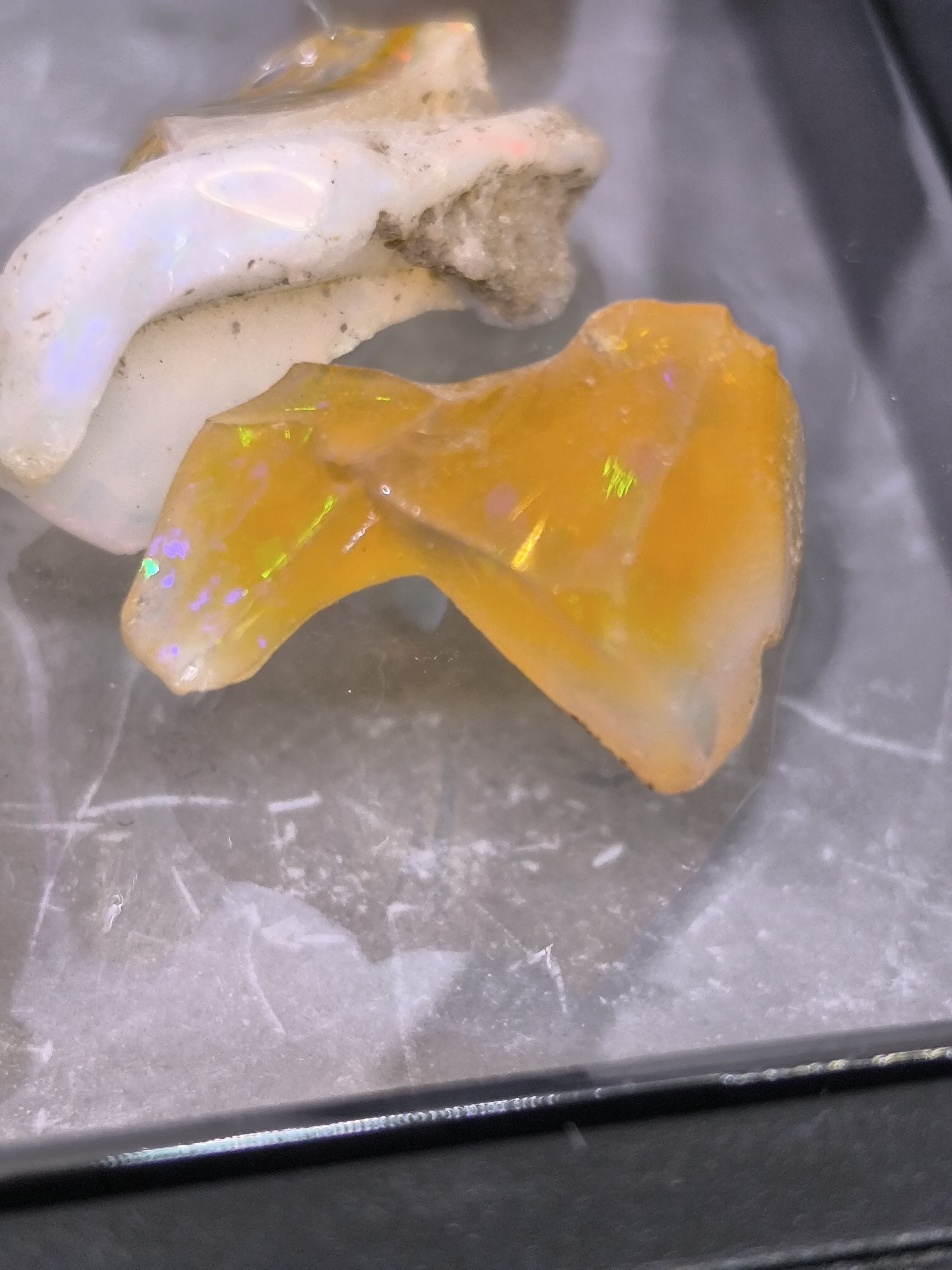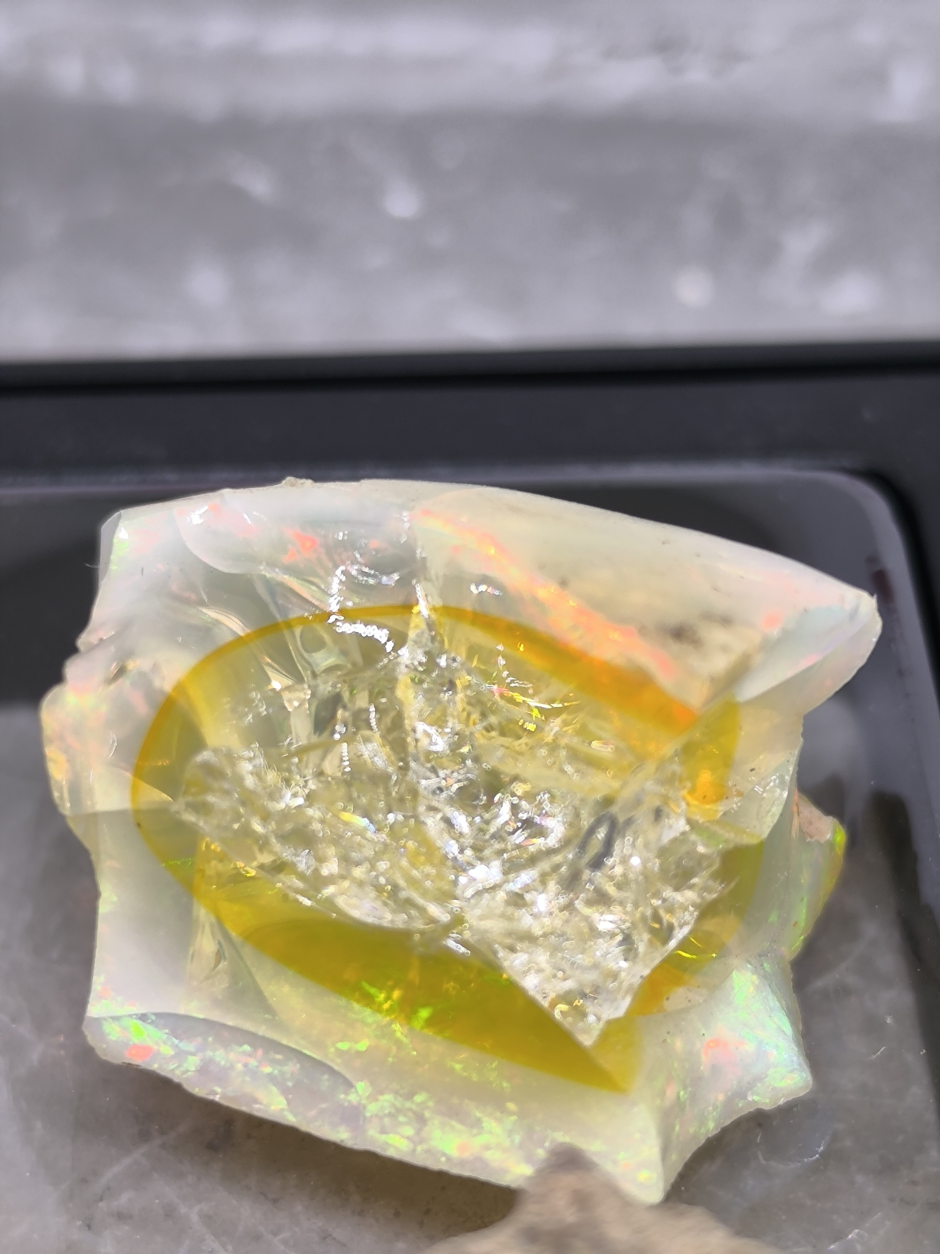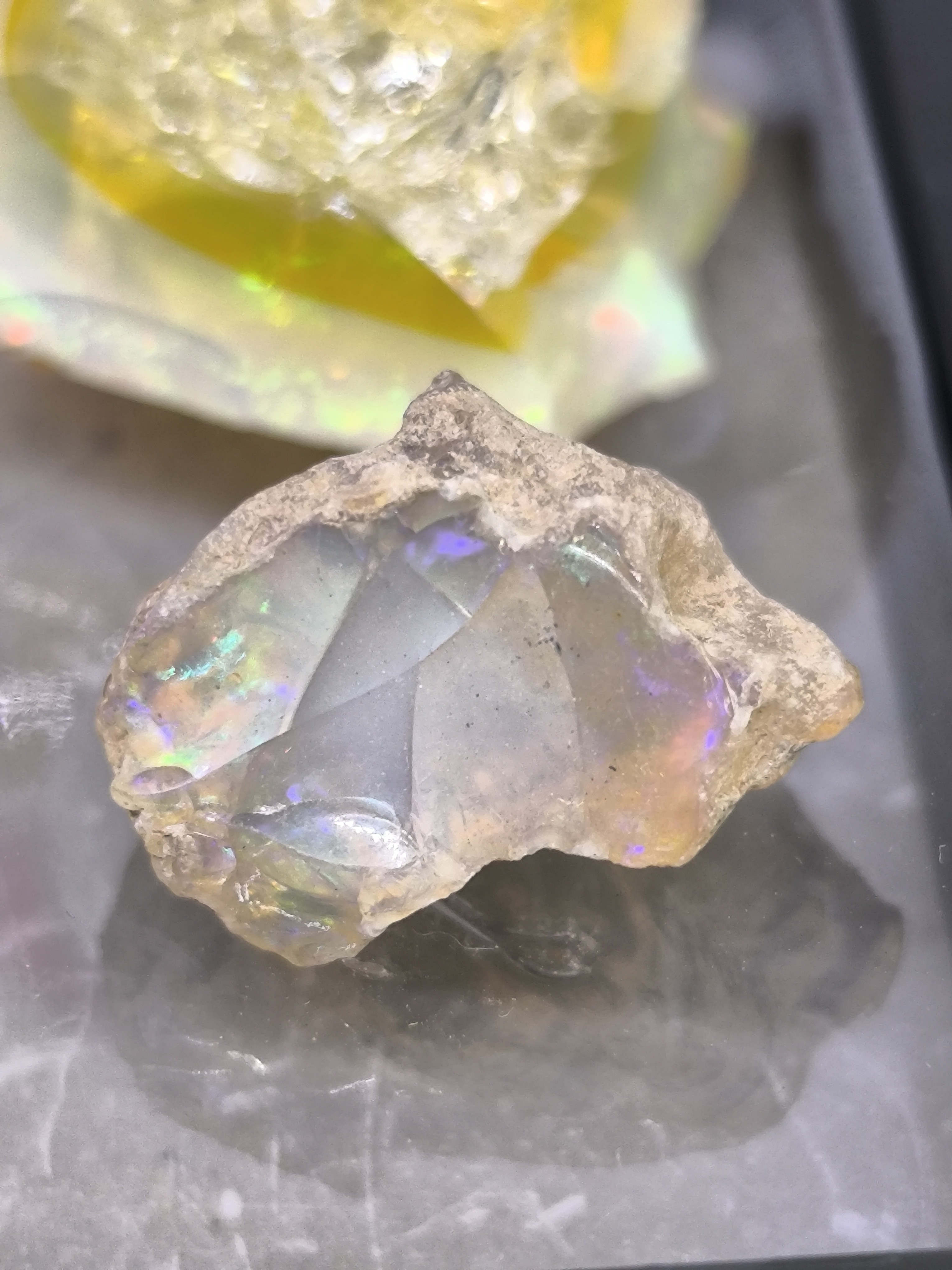 Ces opales se distinguent par leur brillance remarquable et leurs reflets multicolores spectaculaires. Selon l’angle et la lumière, elles dévoilent une palette riche et vivante : blanc lacté, rouge, orange, jaune, vert, violet, bleu, ainsi que des zones translucides à transparentes, caractéristiques des opales éthiopiennes de qualité.