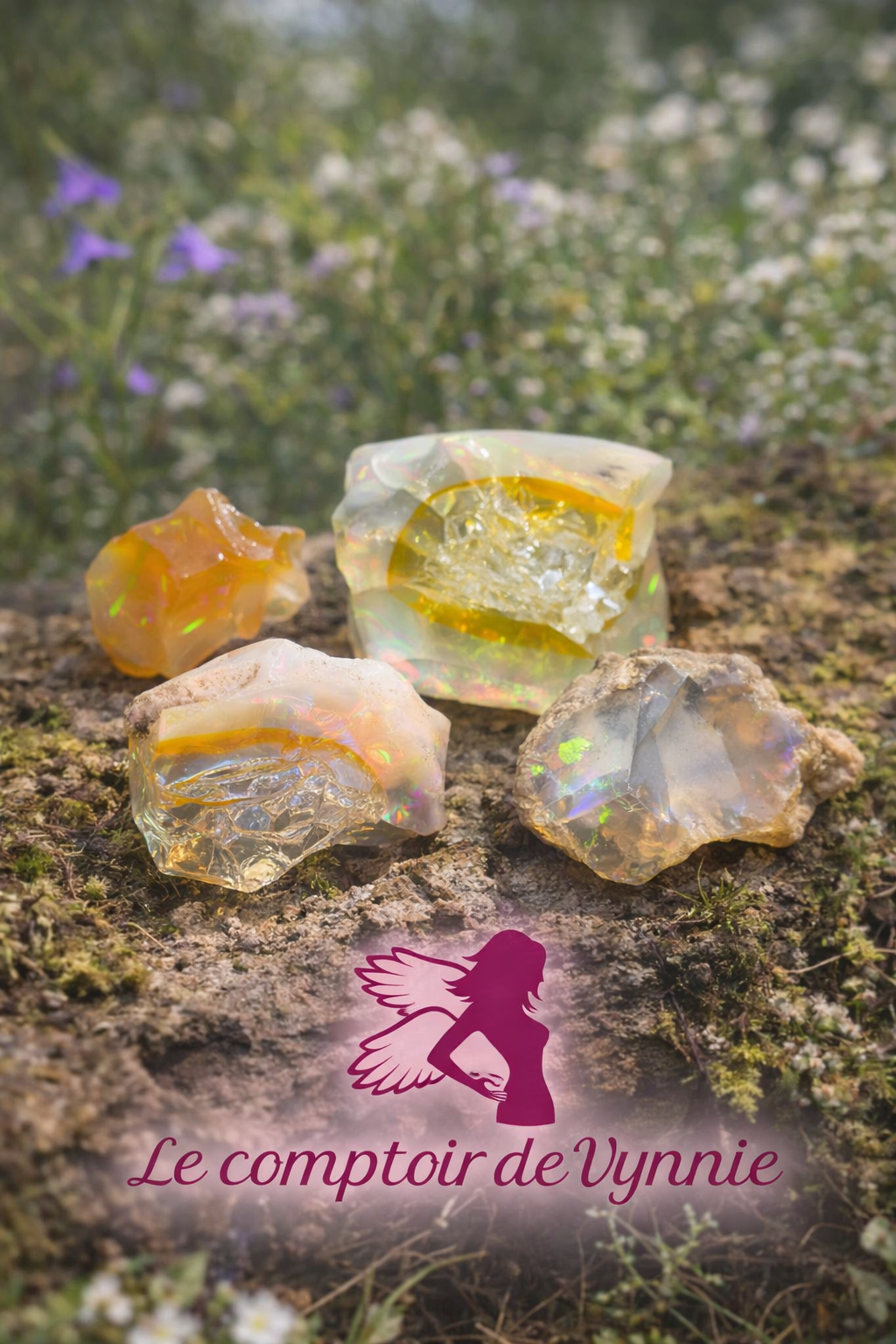 Ce lot de 5 opales d’Éthiopie naturelles est composé de pièces uniques, laissées en forme brute, afin de préserver toute la magie de leurs jeux de lumière et leur structure naturelle.