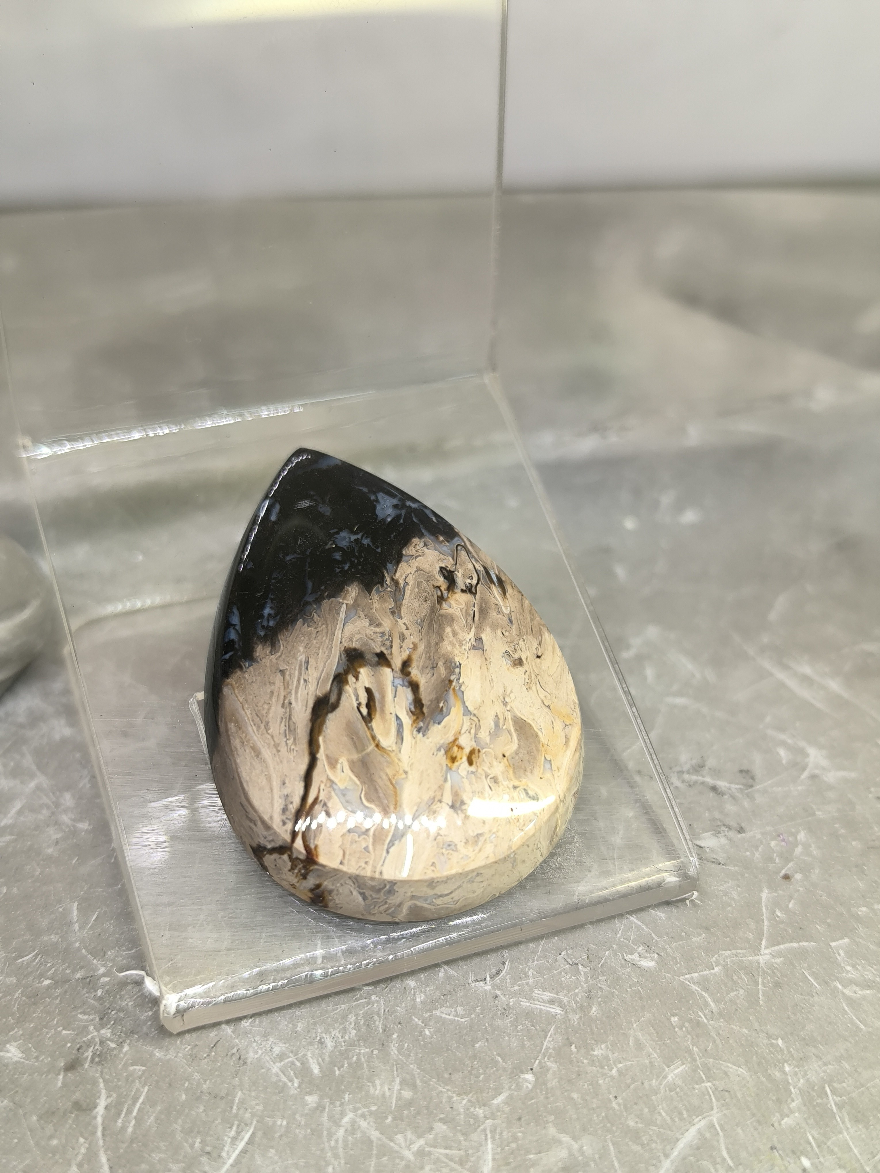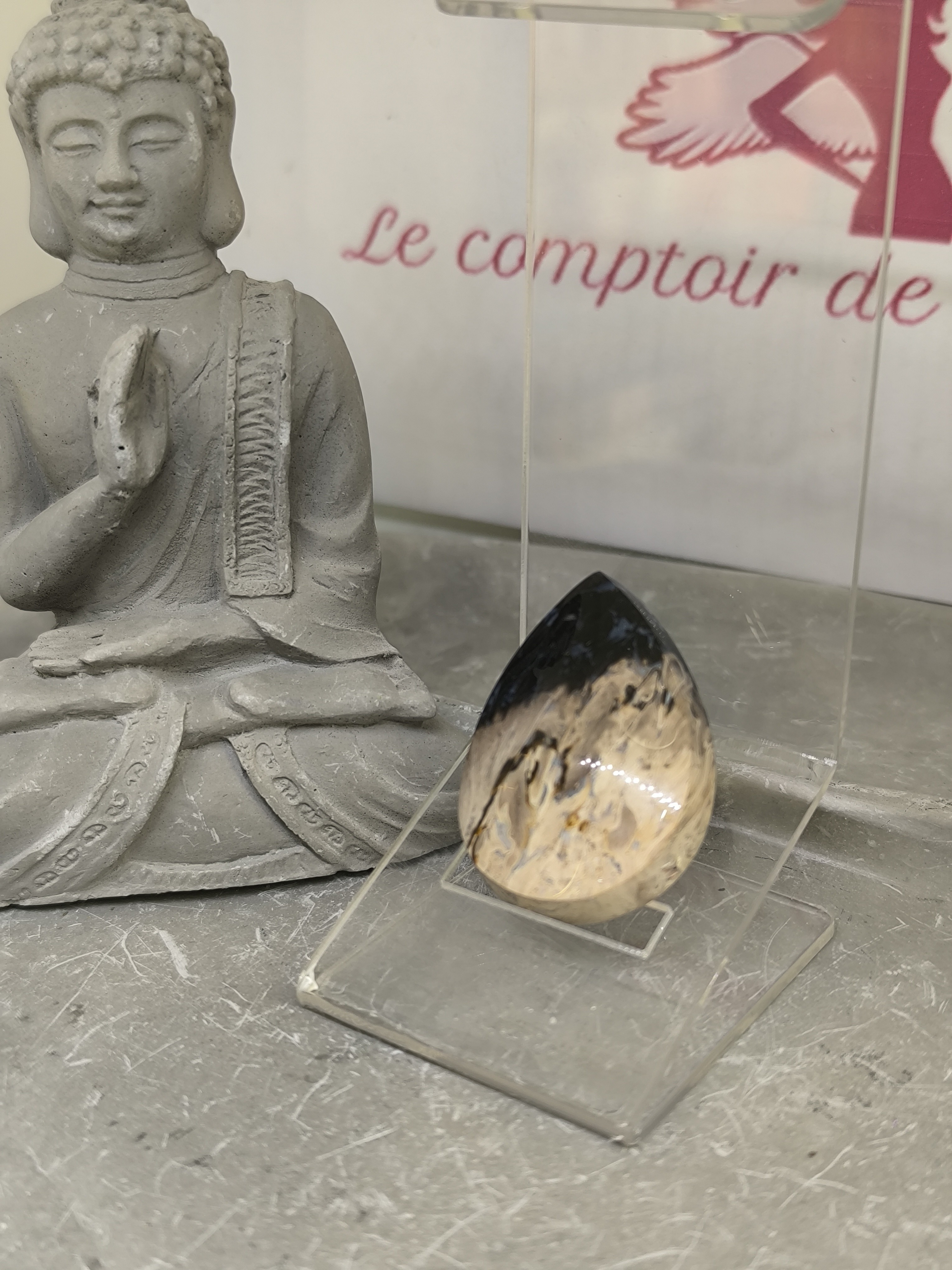 Issue d’un lent processus de fossilisation, cette pierre présente par endroits une opalescence naturelle, apportant de subtils reflets lumineux qui contrastent magnifiquement avec ses teintes profondes et minérales.