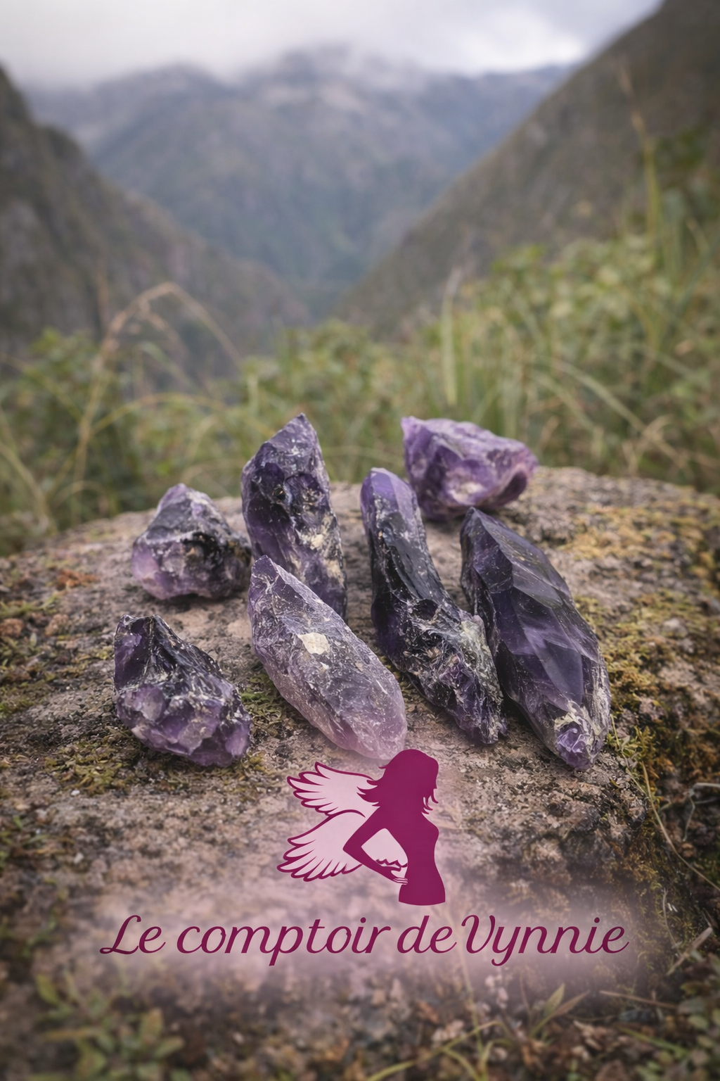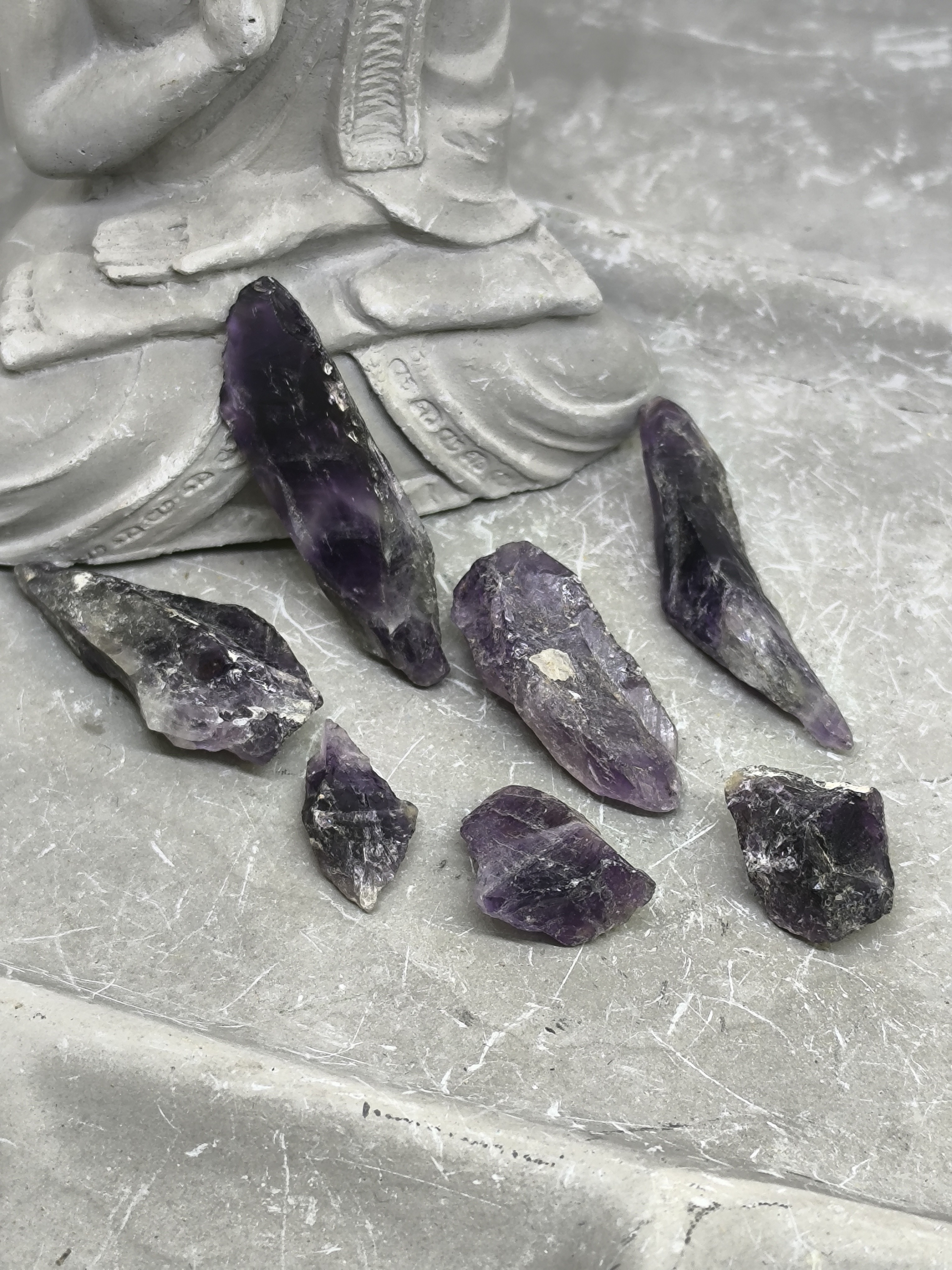 Ce lot de 7 améthystes naturelles se compose de pierres brutes en forme libre, sélectionnées pour la profondeur et l’intensité de leur couleur violette, allant du violet foncé profond à des nuances de violet plus clair, typiques des améthystes de belle qualité.