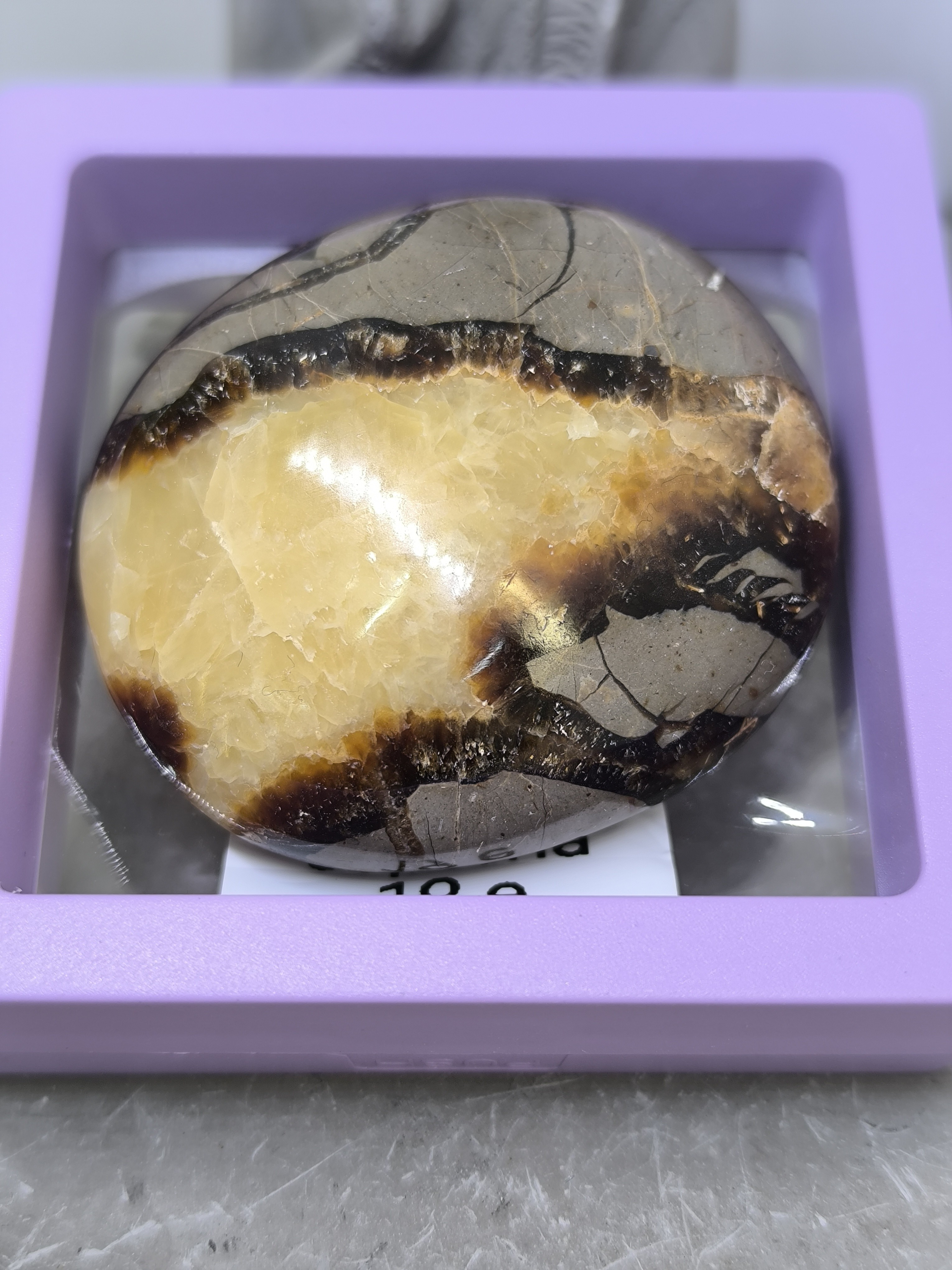 Cette septaria roulée naturelle est une pièce unique de très belle qualité, soigneusement polie afin de révéler toute la richesse de ses motifs géologiques spectaculaires.