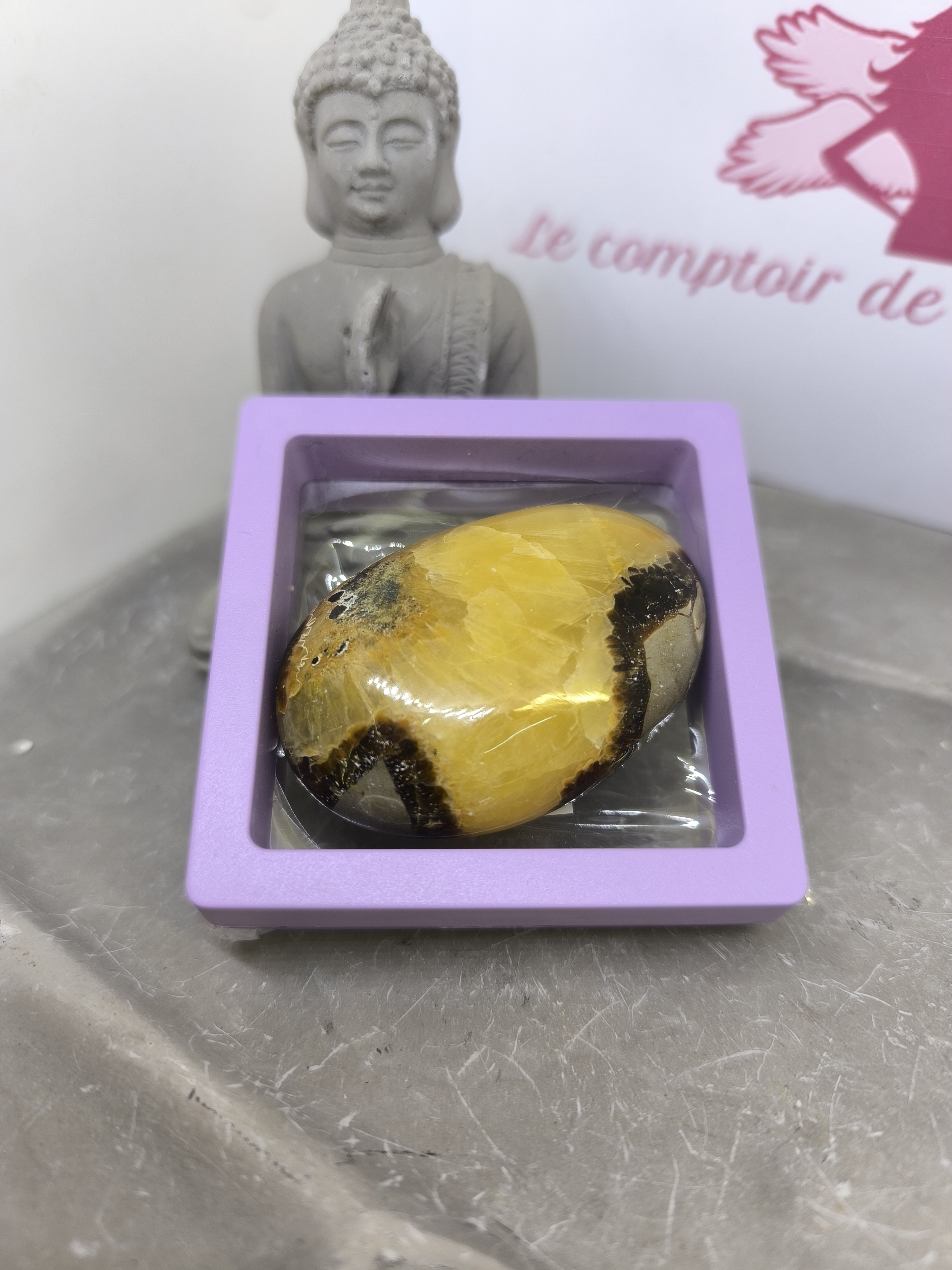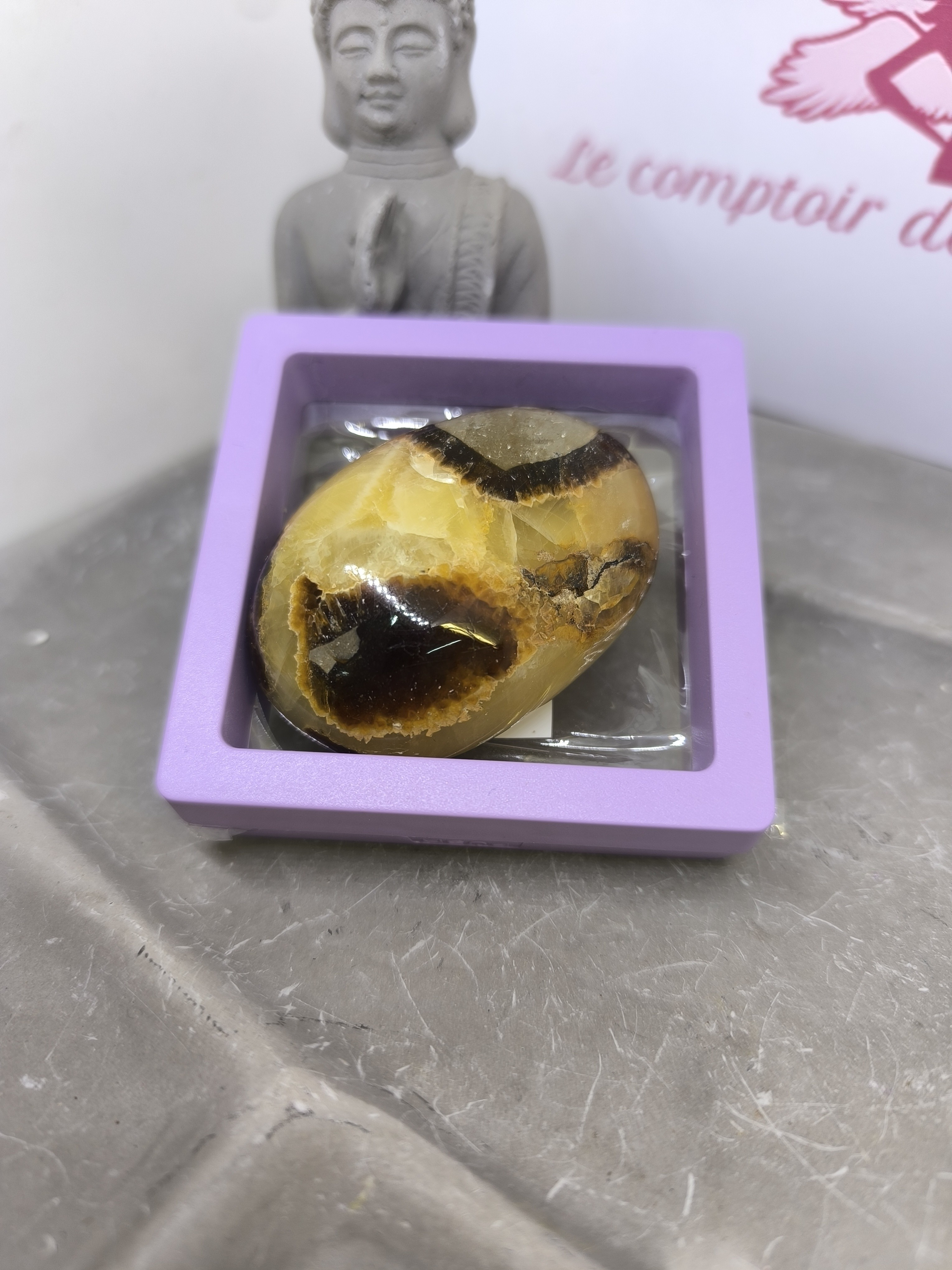 Cette septaria roulée naturelle est une pièce unique de très belle qualité, soigneusement polie afin de révéler toute la richesse de ses motifs géologiques spectaculaires.