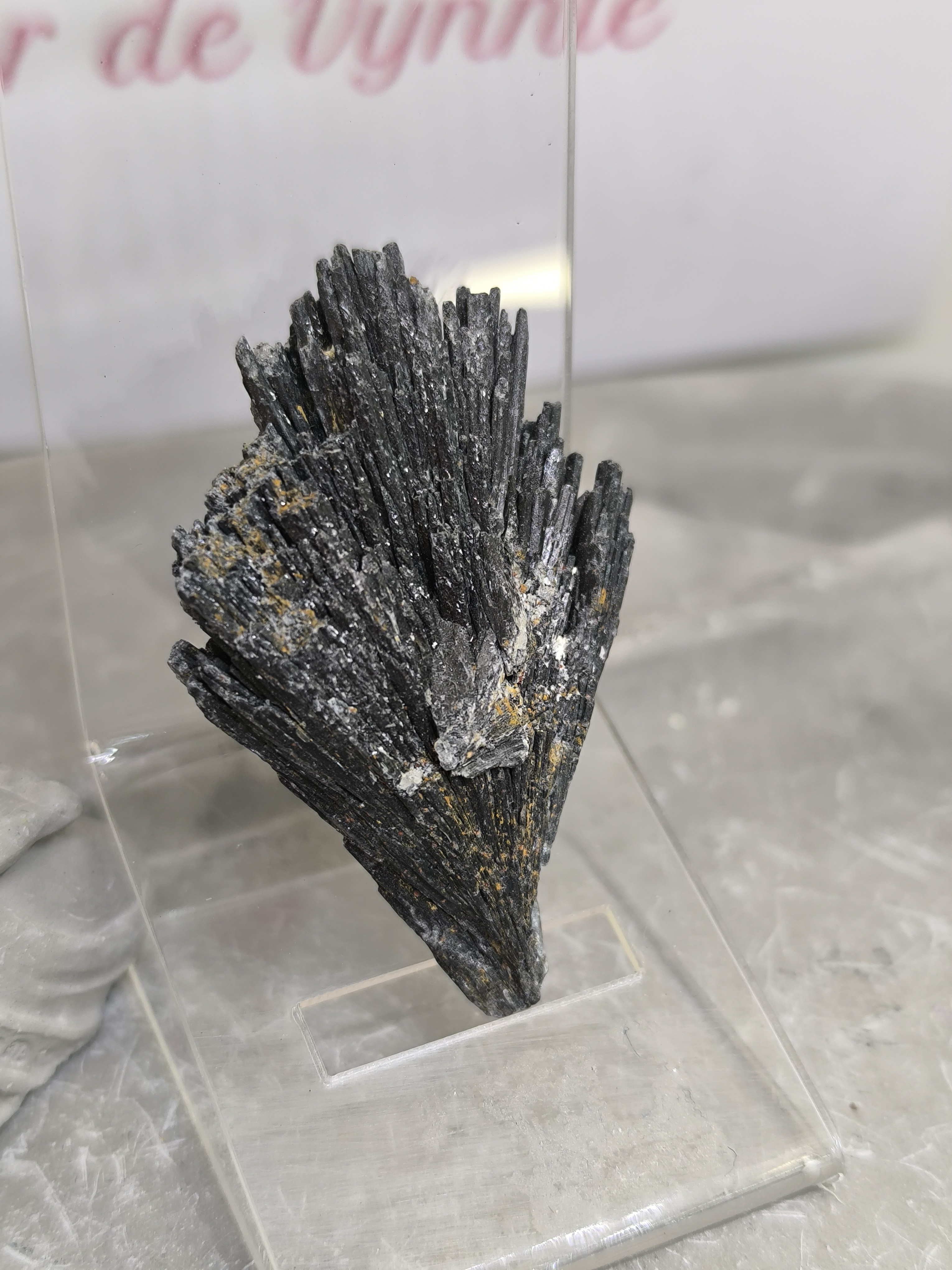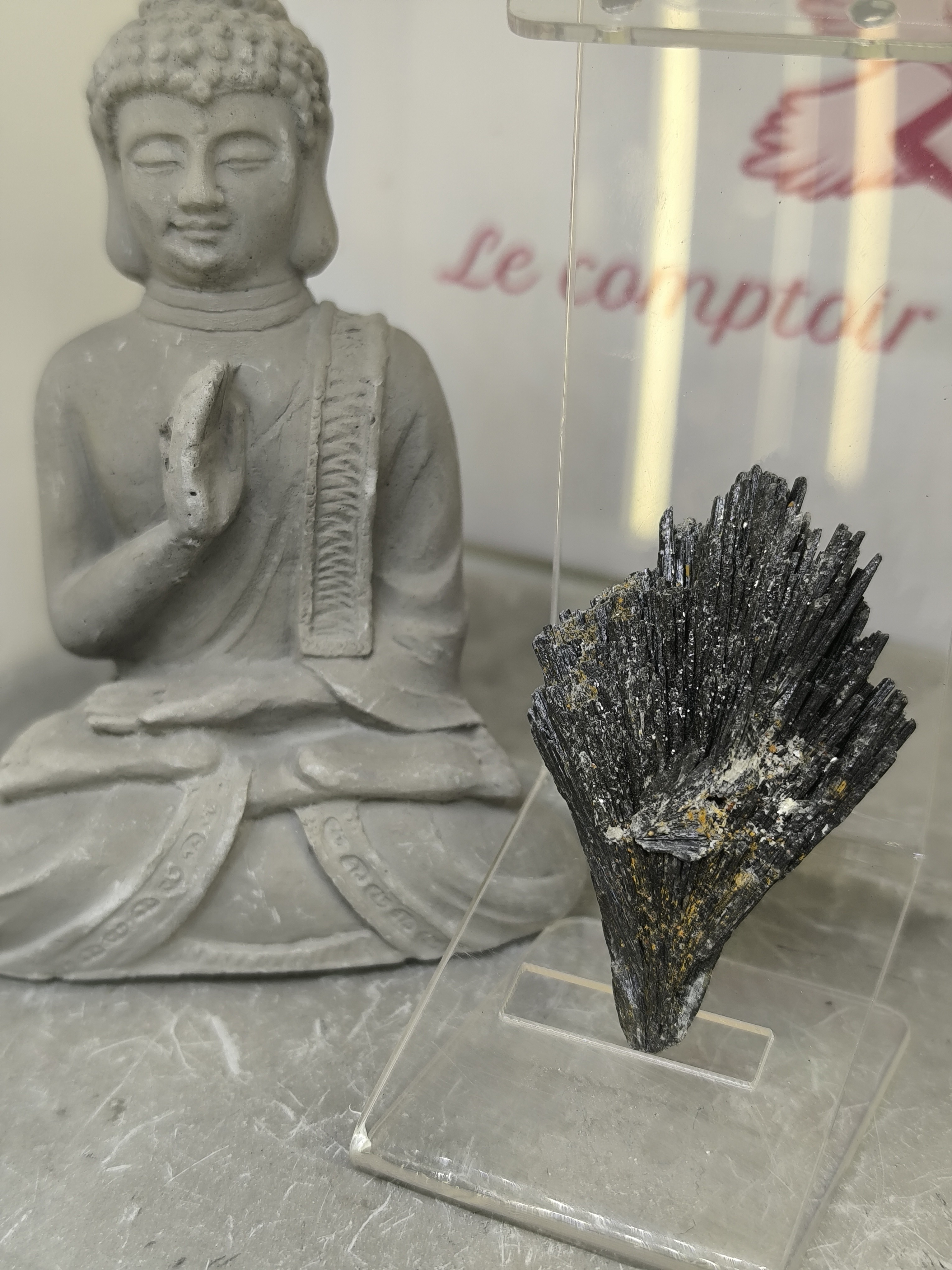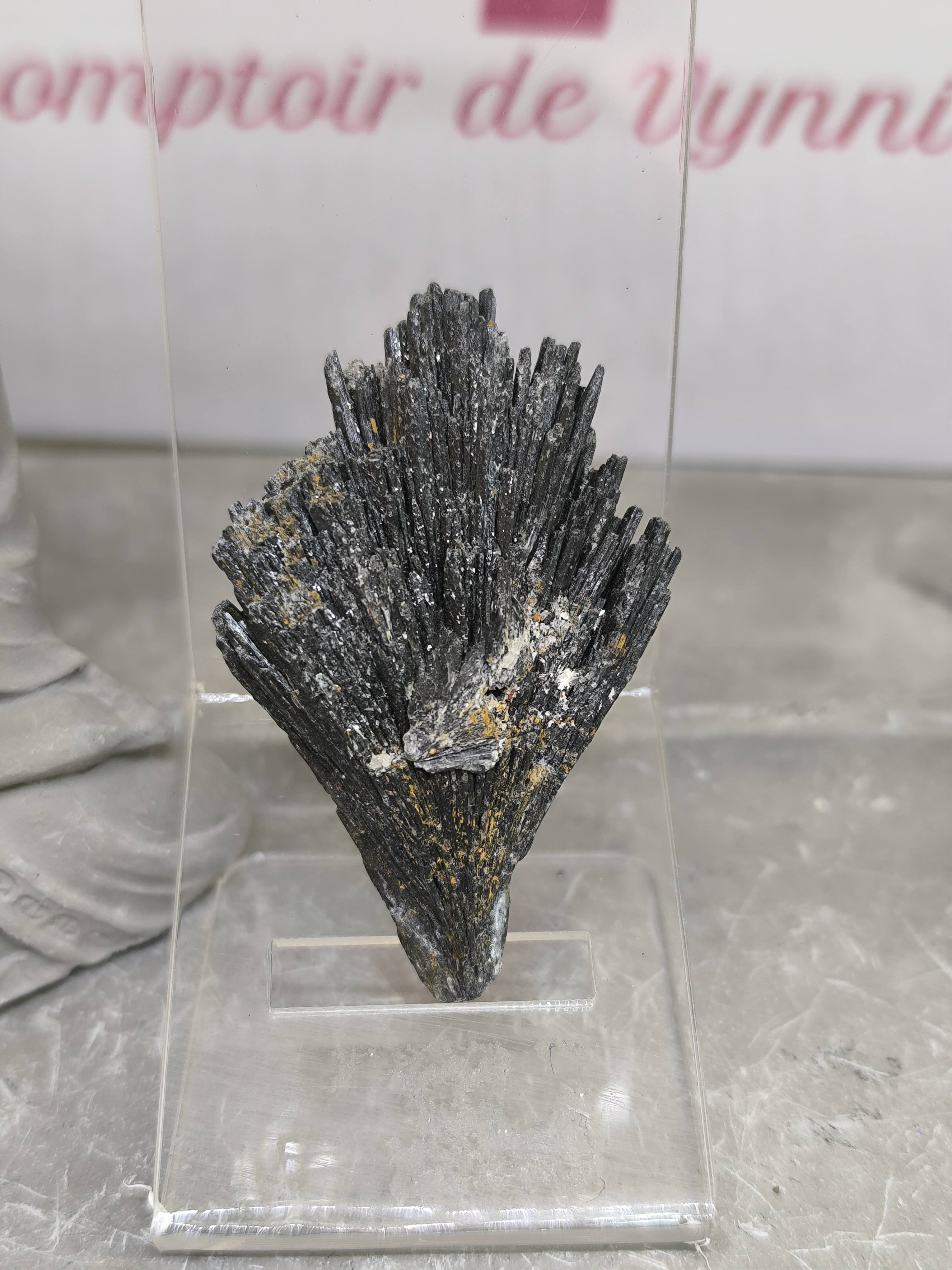 La stibine présente ici une structure cristalline bien formée, aux reflets gris métallisé à noir profond, typiques de cette espèce minérale très appréciée des collectionneurs. Sa morphologie élancée, presque graphique, lui confère une présence forte et élégante, idéale pour une collection minéralogique, une vitrine, ou une pièce décorative minérale de caractère.