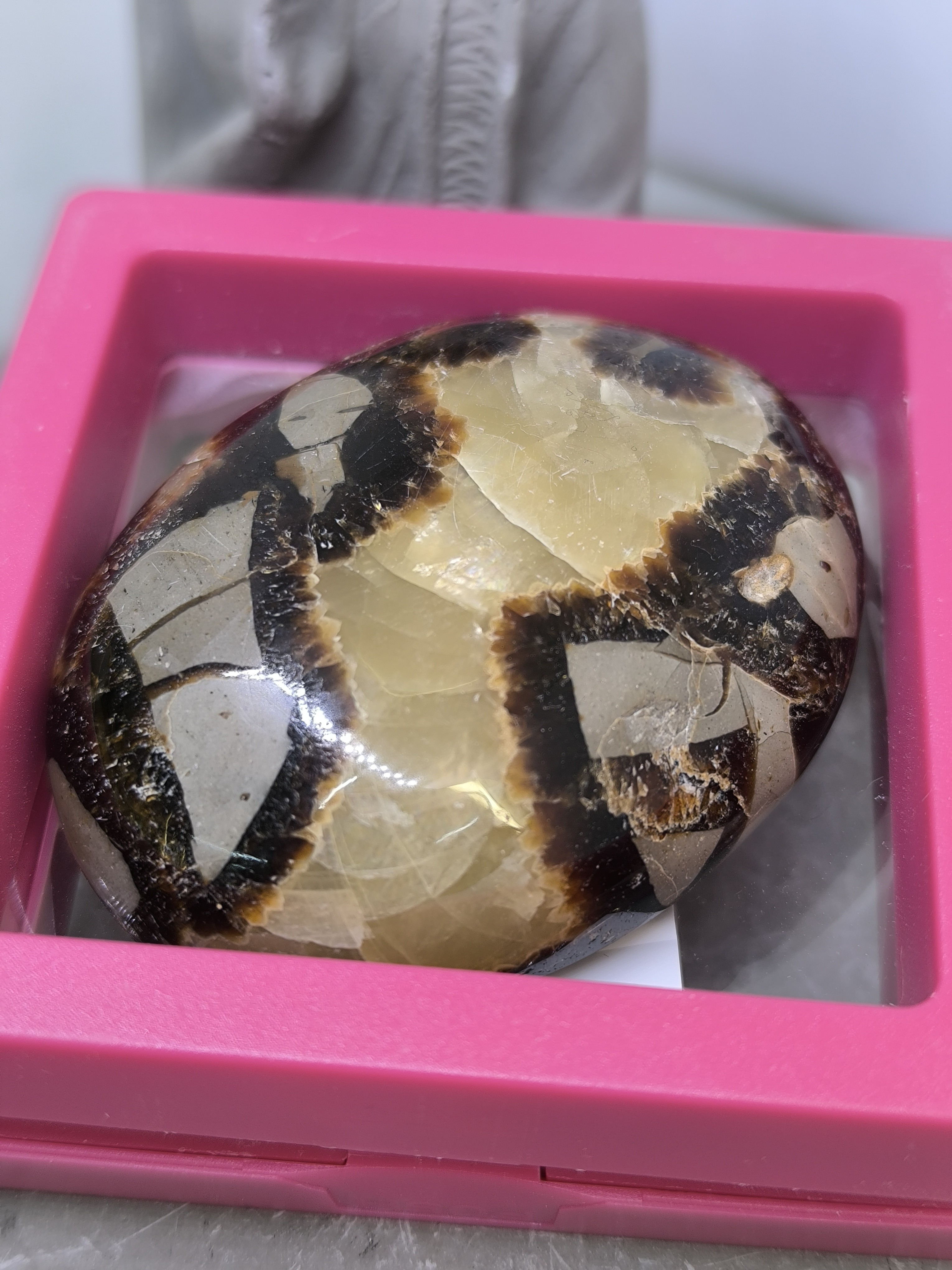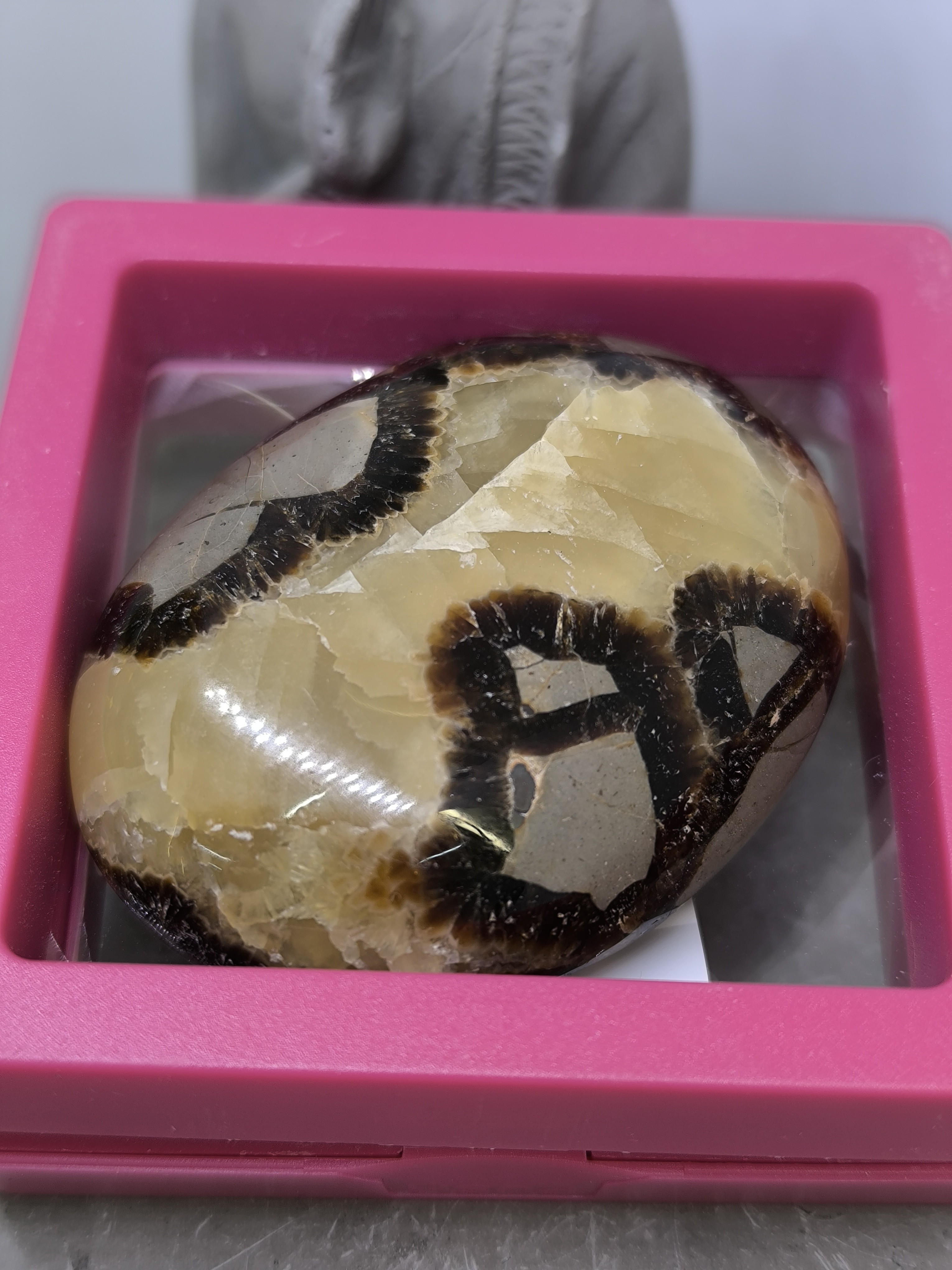 Cette septaria roulée naturelle est une pièce unique de très belle qualité, soigneusement polie afin de révéler toute la richesse de ses motifs géologiques spectaculaires.