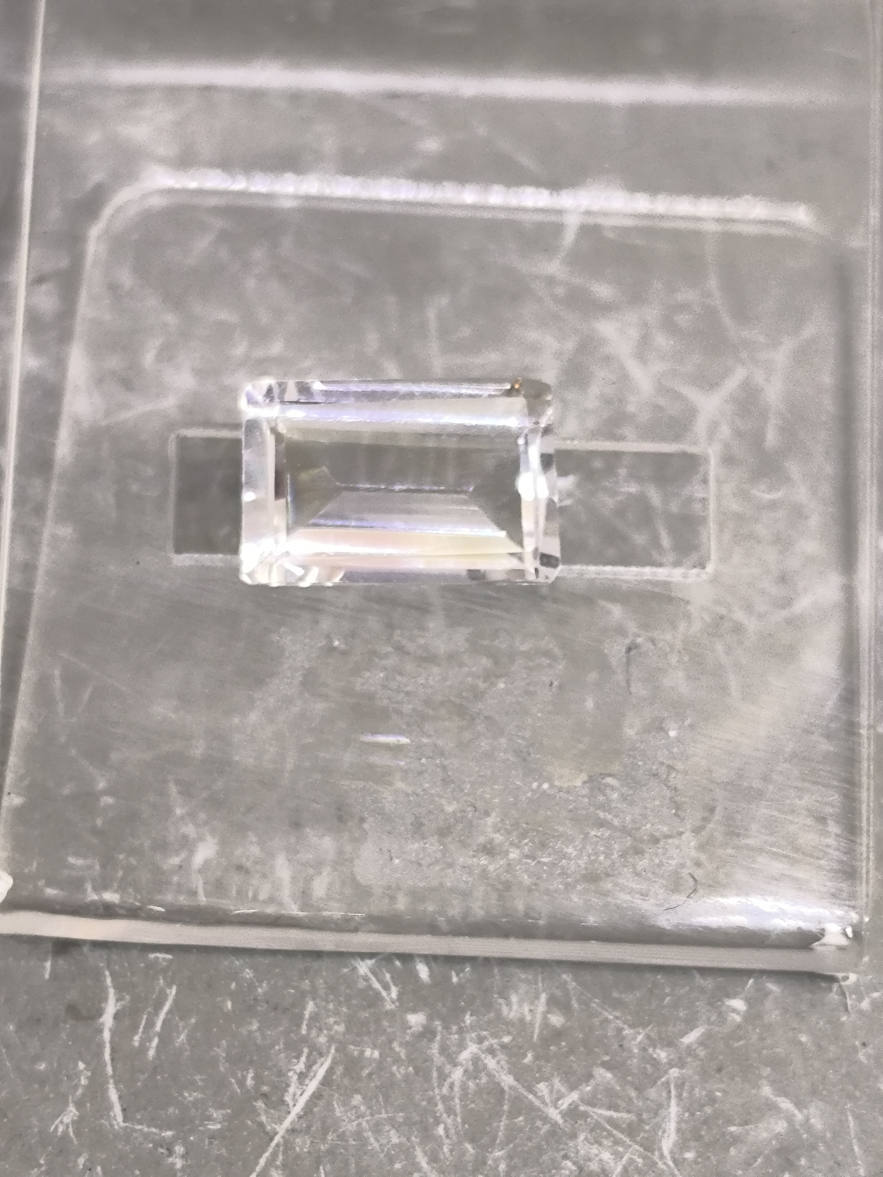 La taille émeraude, avec ses lignes nettes et ses facettes larges, sublime la transparence, la pureté et la luminosité de la pierre. Elle permet à la lumière de circuler harmonieusement, révélant de subtils reflets rosés et légèrement lilas selon l’angle.