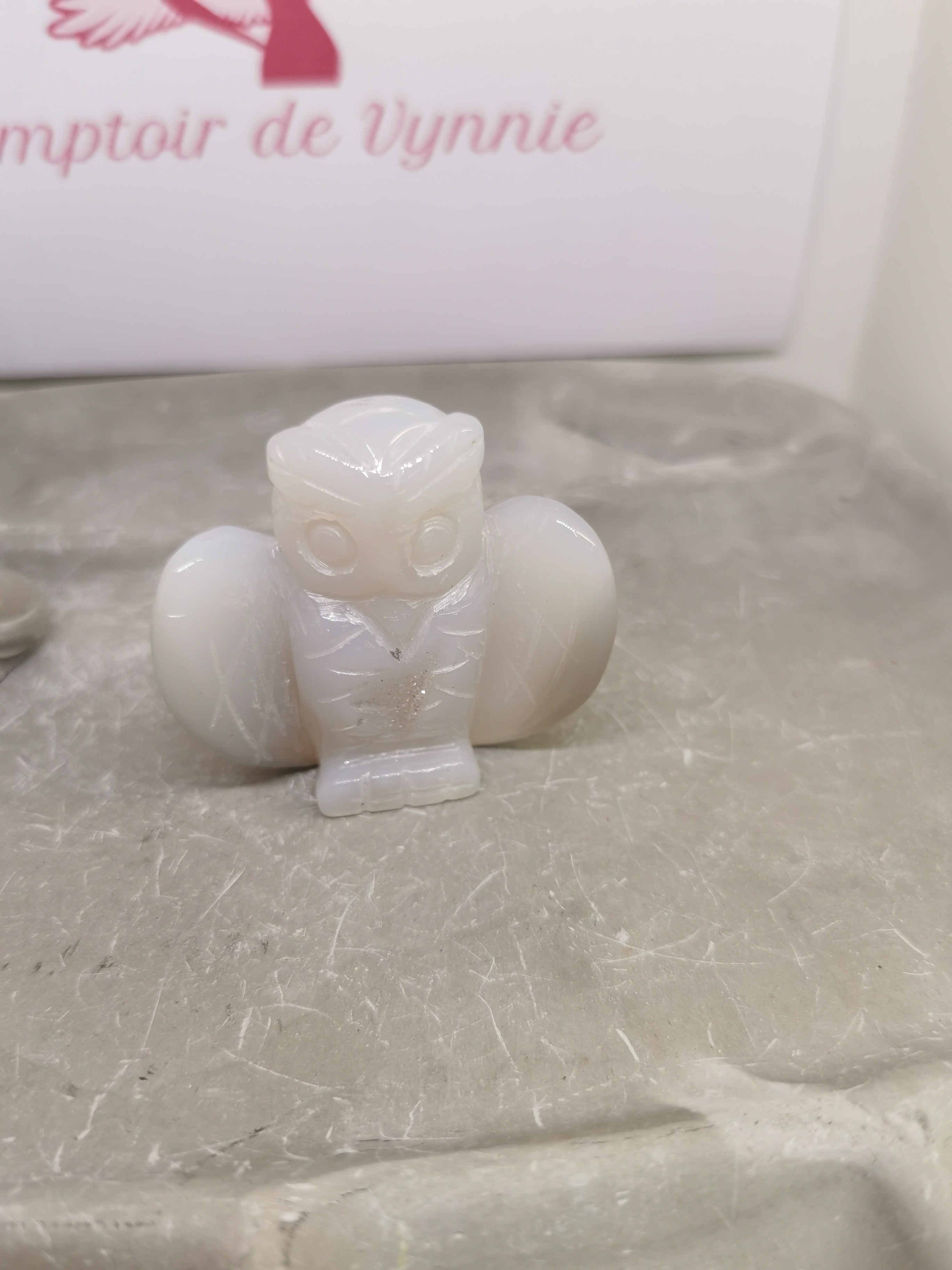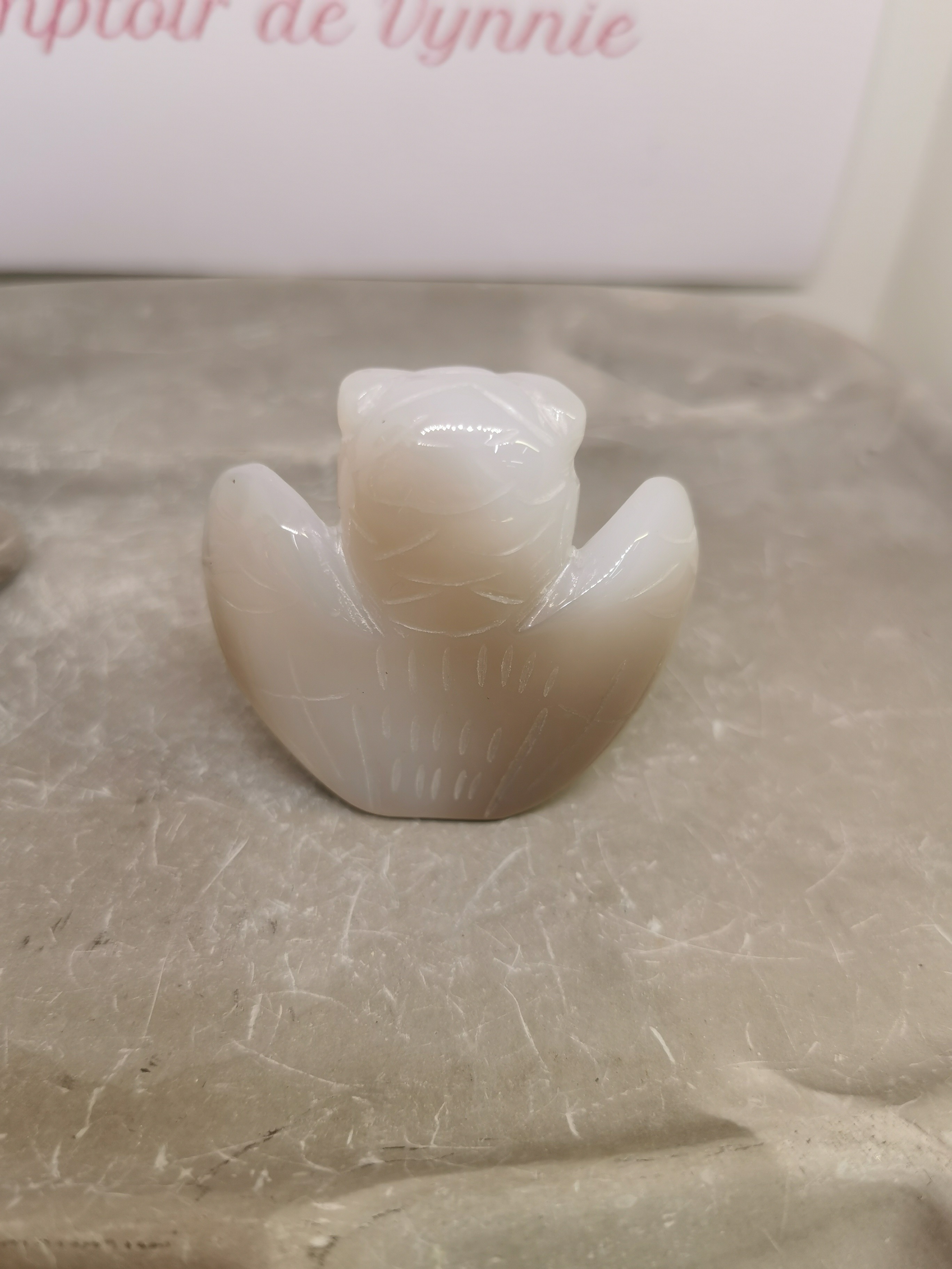 Ce magnifique hibou sculpté en agate grise est une pièce à la fois élégante et symbolique. Finement taillé dans une agate naturelle de belle qualité, il présente une teinte douce et nuancée, allant du gris clair au gris laiteux, mettant en valeur le travail de sculpture et les lignes naturelles de la pierre.