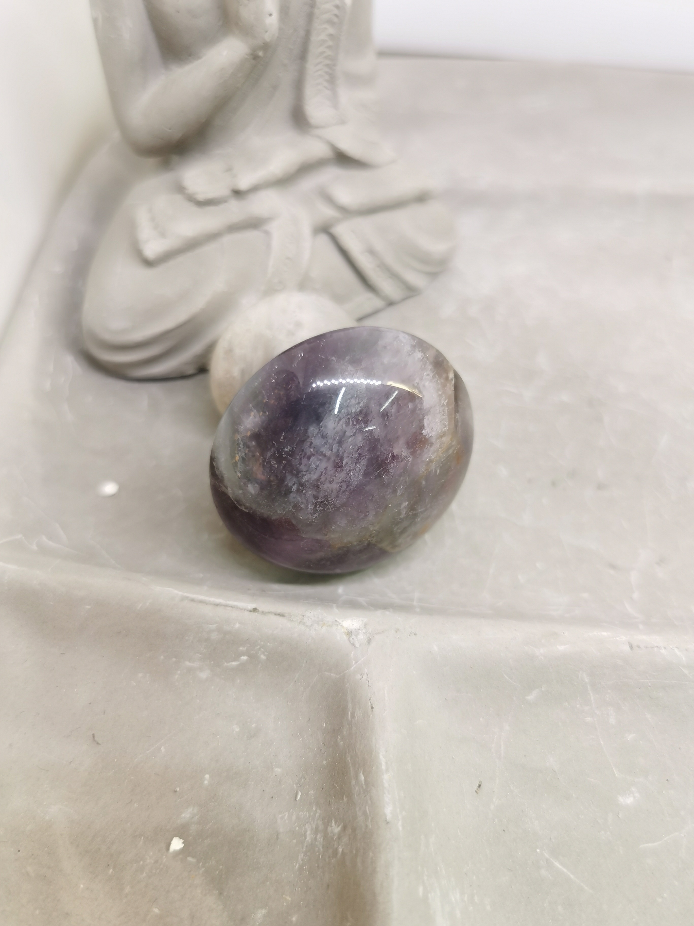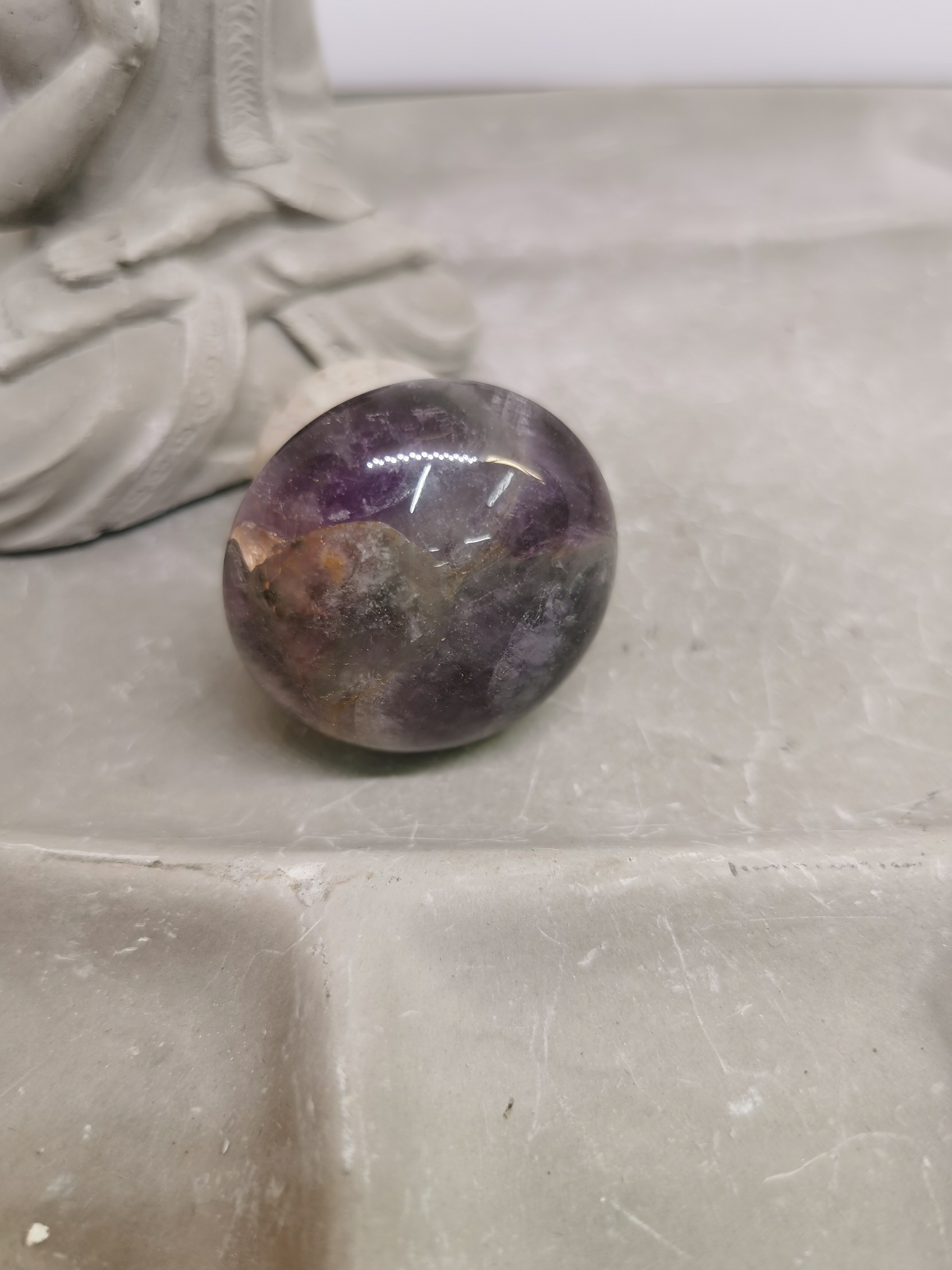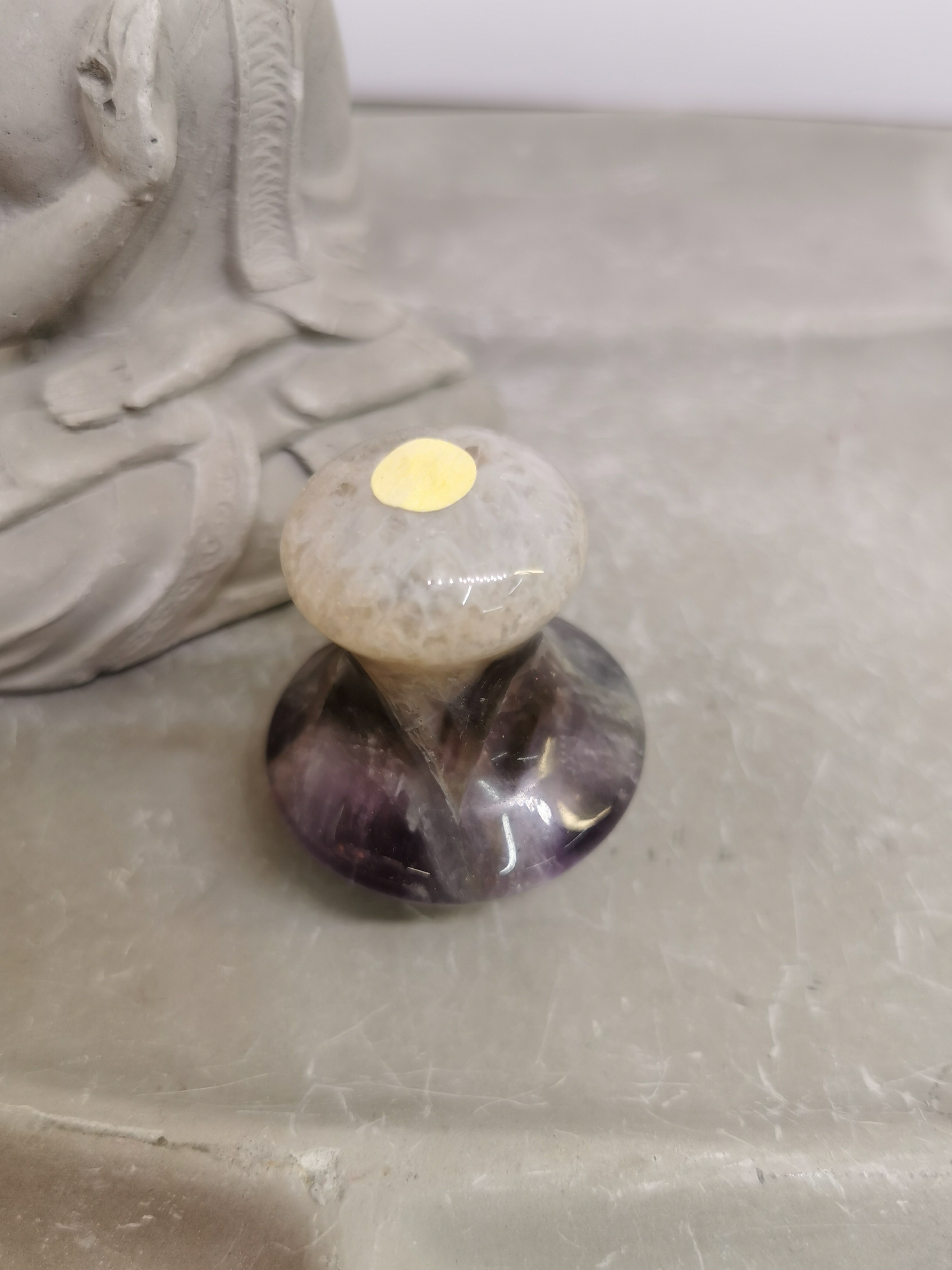 Ce très beau champignon de massage en améthyste chevron, taillé dans une pierre naturelle de qualité, associe harmonieusement les nuances violettes de l’améthyste et les zones blanches de quartz, créant un contraste doux et élégant.