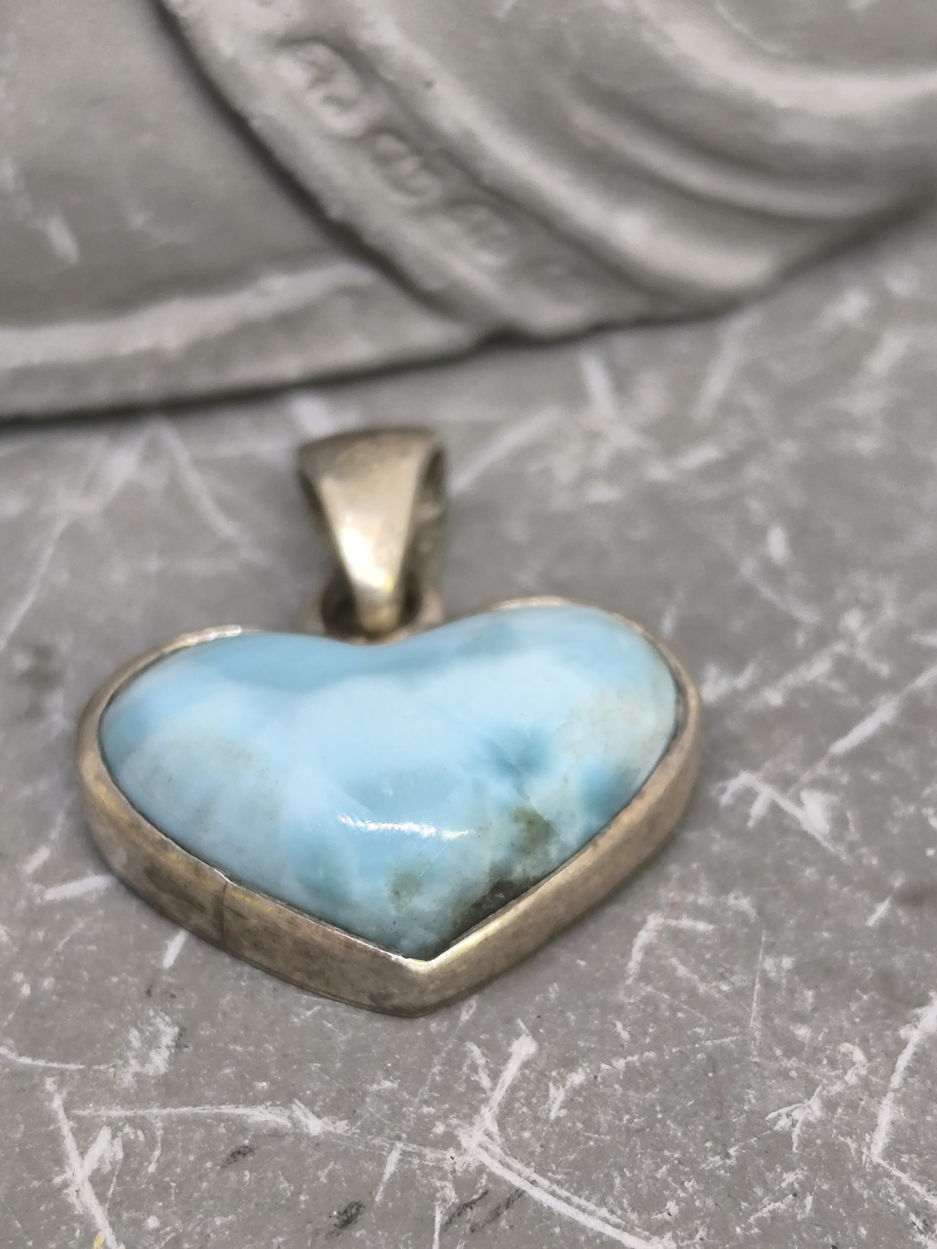 Ce pendentif en forme de cœur est réalisé en larimar naturel, pierre rare aux nuances de bleu céleste, et monté sur argent.