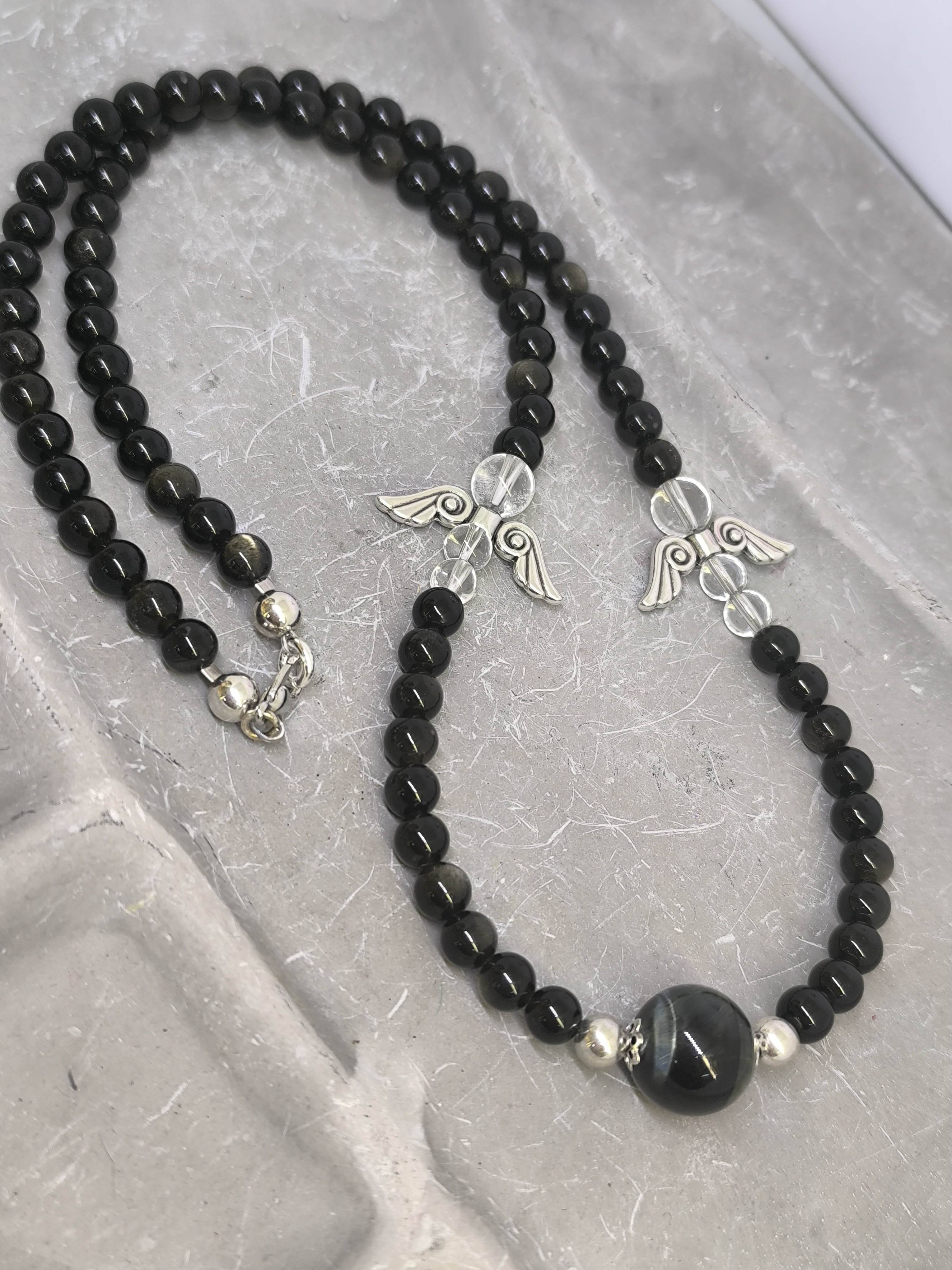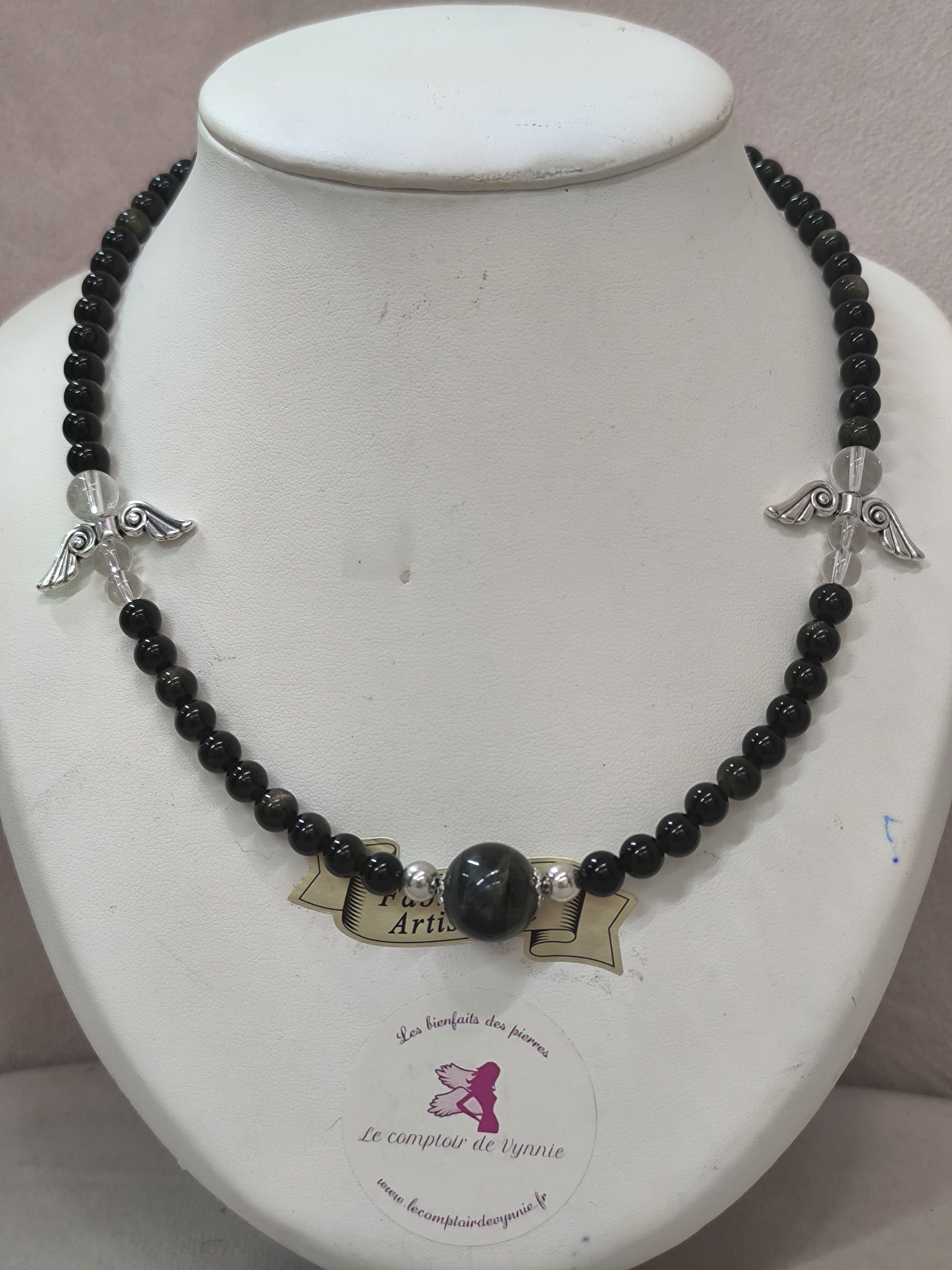 Ce collier en obsidienne céleste, sublimé par une grosse perle centrale d’œil de fer et des perles d’ange en cristal aux ailes argentées, est un bijou de protection profonde, d’ancrage et de guidance spirituelle.